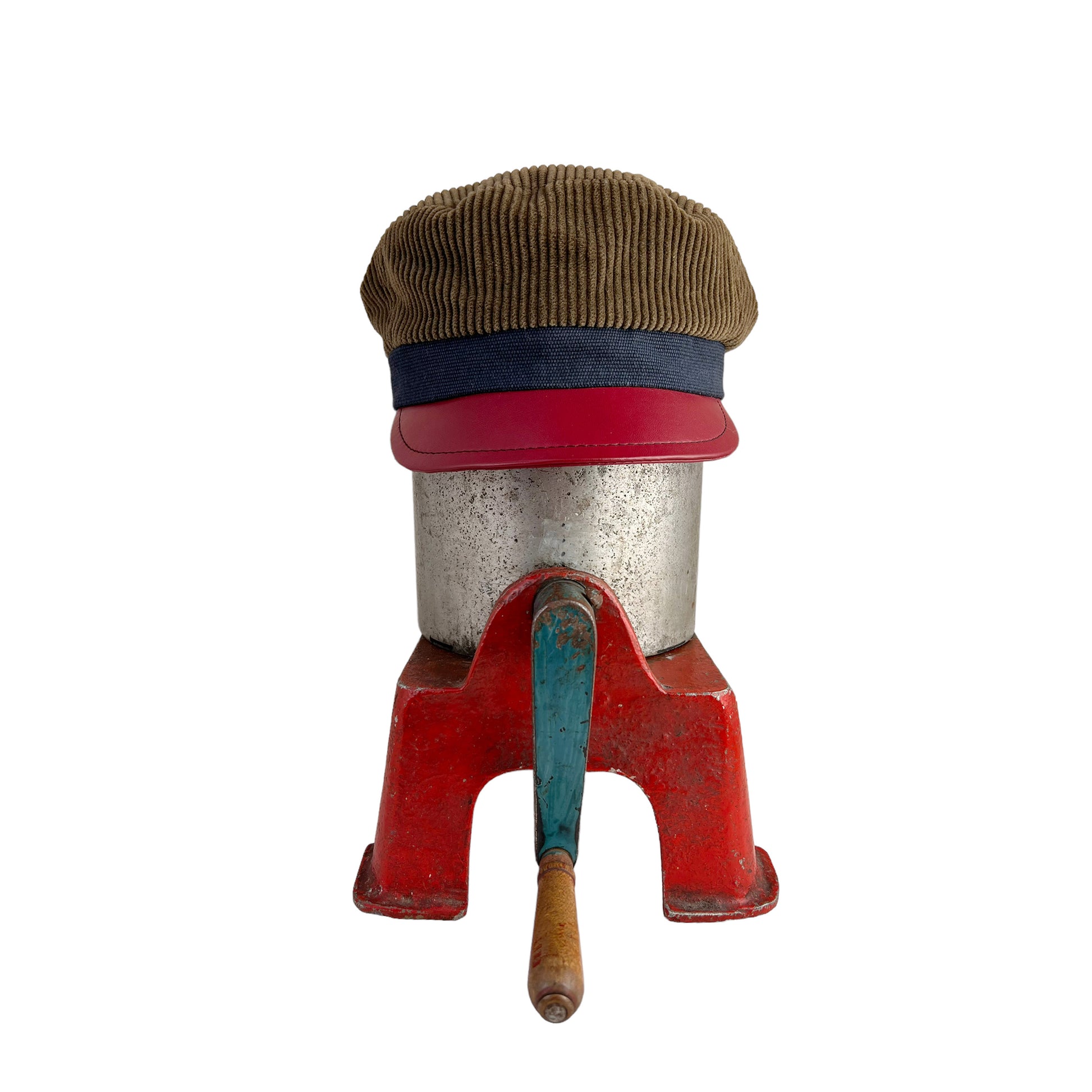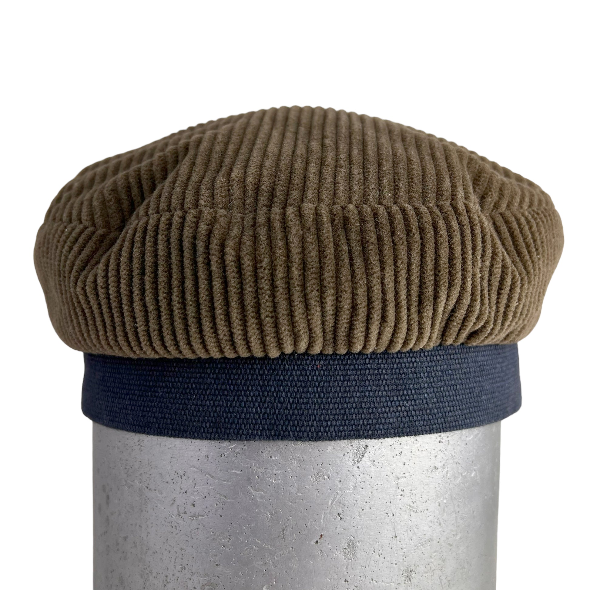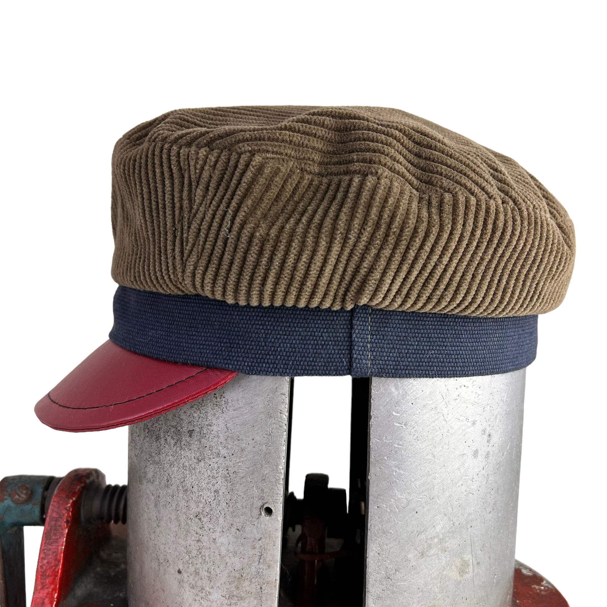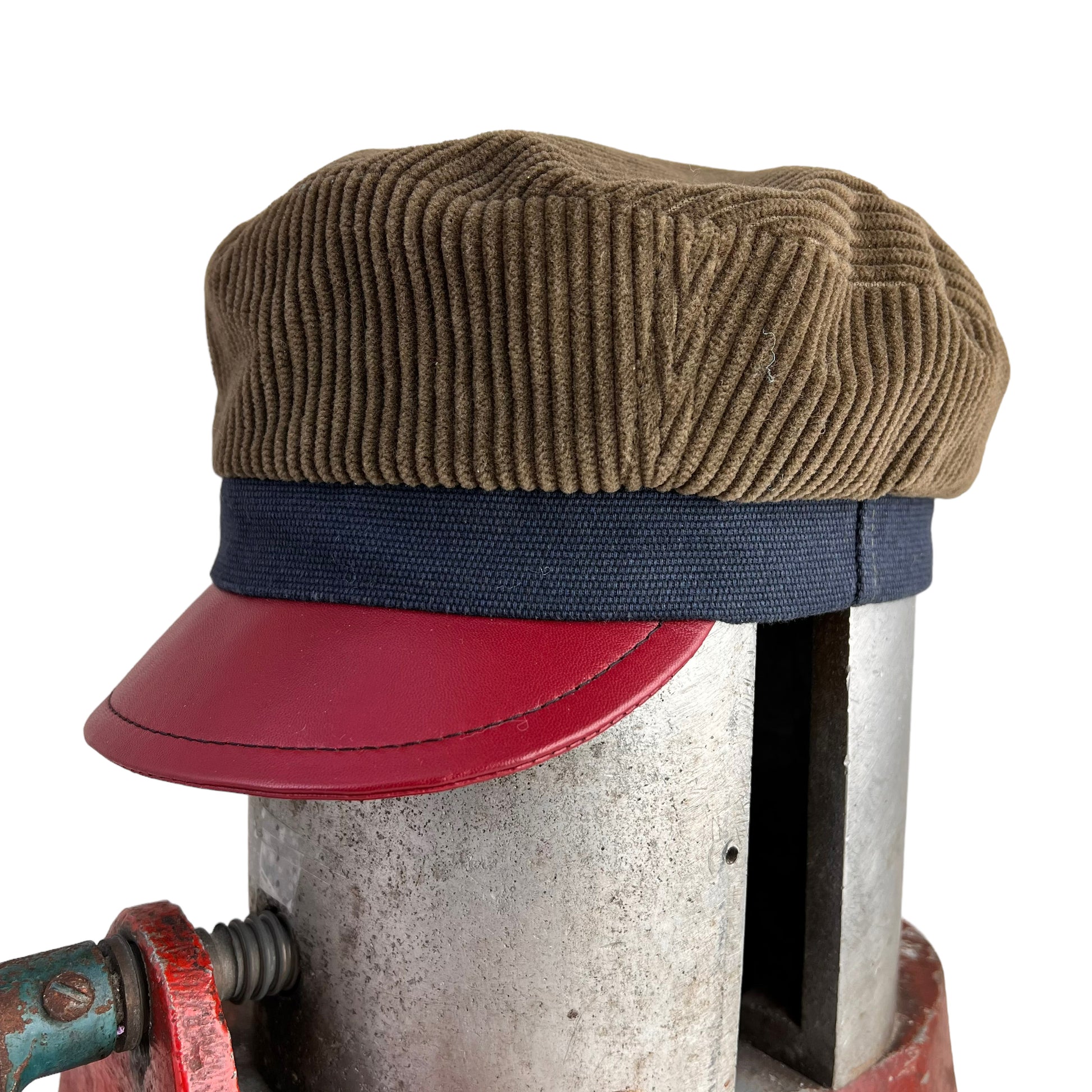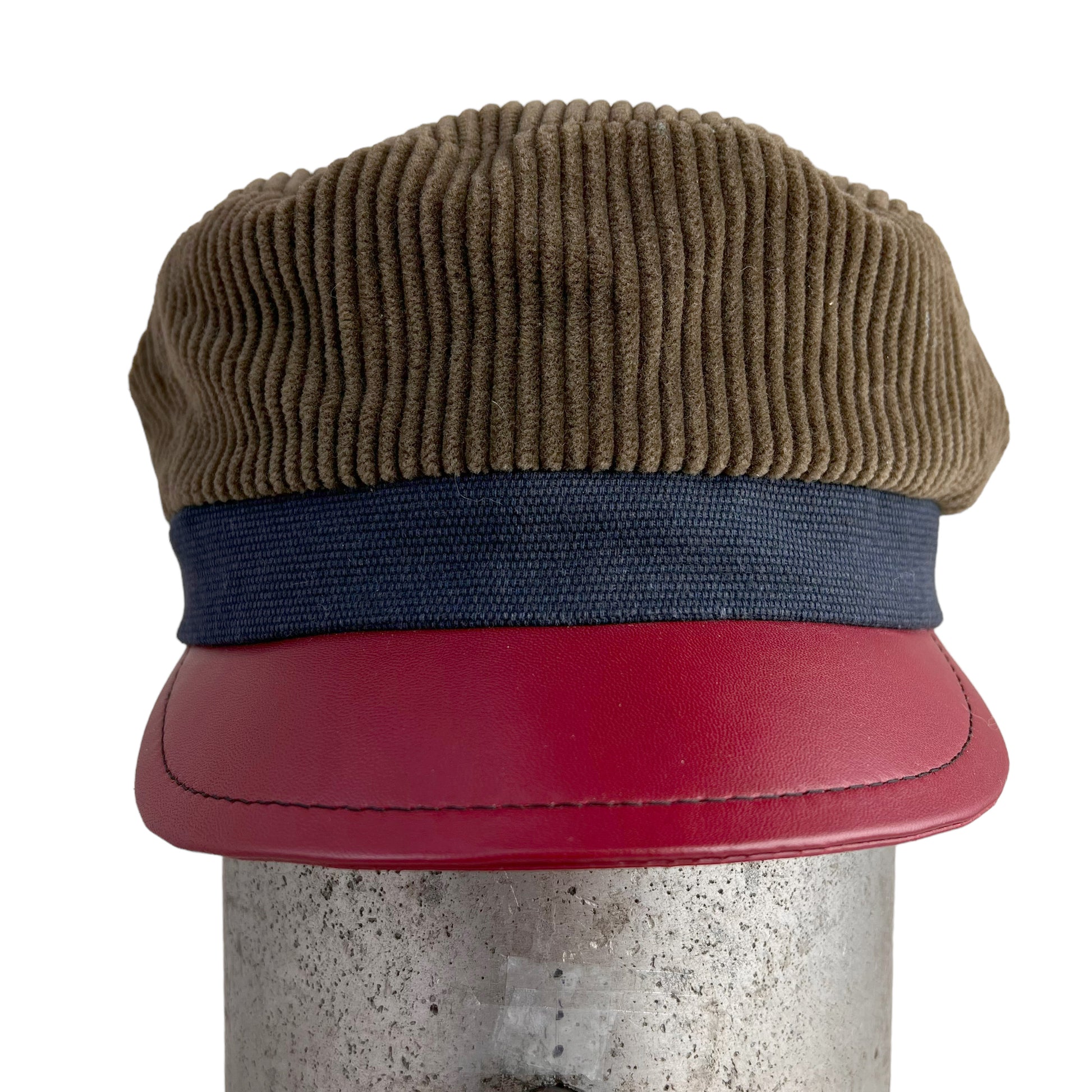 Named "The Cordy" this casual unisex Breton styling cap design has been hand cut from a army olive green cotton corduroy fabric. The black color band is made from a strong basket weave cotton. I hand cut my red lamb leather peak and reinforce it with a leather board inside, then finish it off by top stitching on my leather machine.