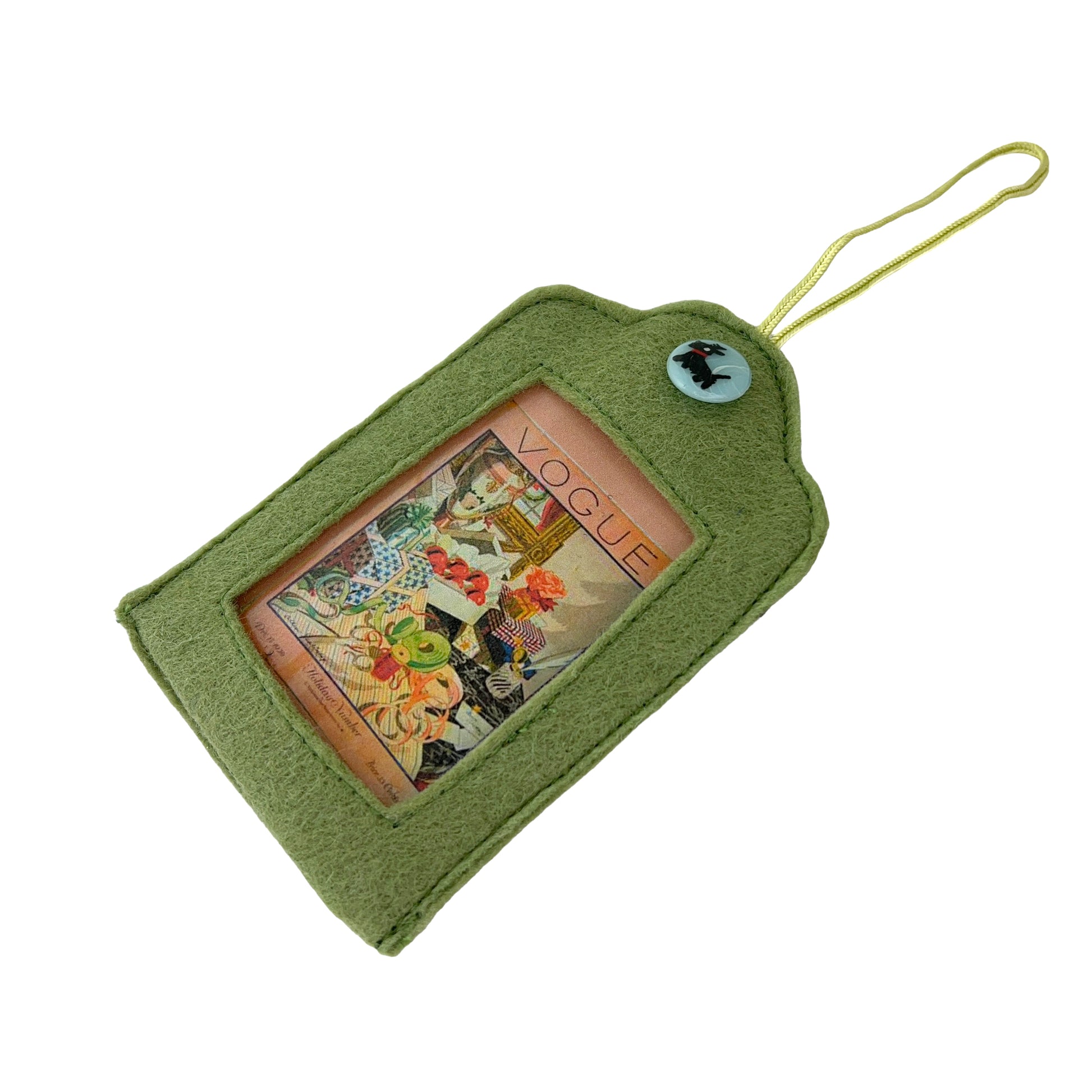 This avocado green frame is made from a sturdy 100% wool felt that is sewn and decorated with a vintage Scottie dog button from the 1950s. The laminated card  is the template (2  7/16" wide by 3  10/16") for you to use for trimming the photo is so wish to insert inside. The bottom openings have a Velcro closure to open and close.