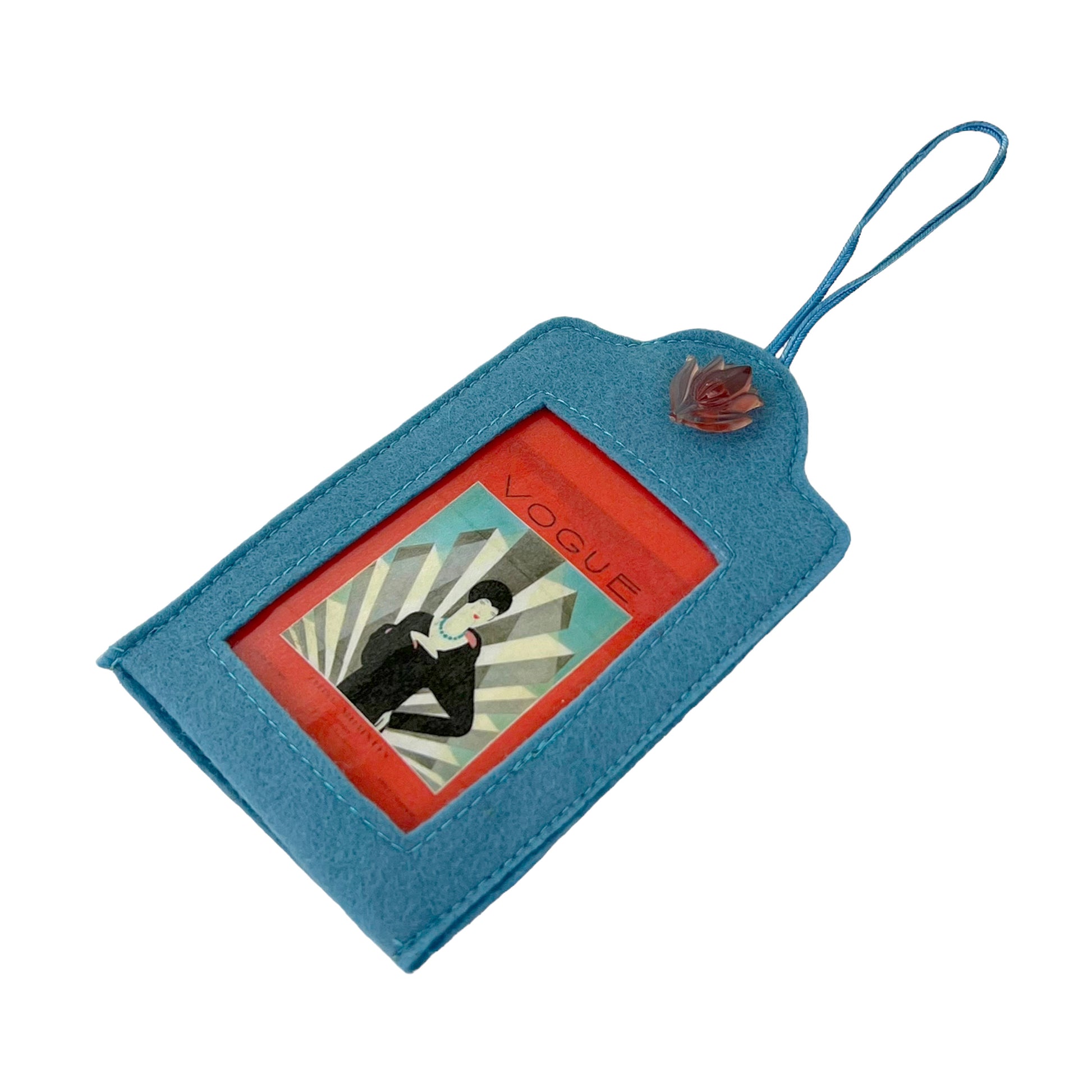 This baby blue frame is made from a sturdy 100% wool felt that is sewn and decorated with a vintage translucent pink flower button from the 1950s. The laminated card  is the template (2  7/16" wide by 3  10/16") for you to use for trimming the photo is so wish to insert inside. The bottom openings have a Velcro closure to open and close.