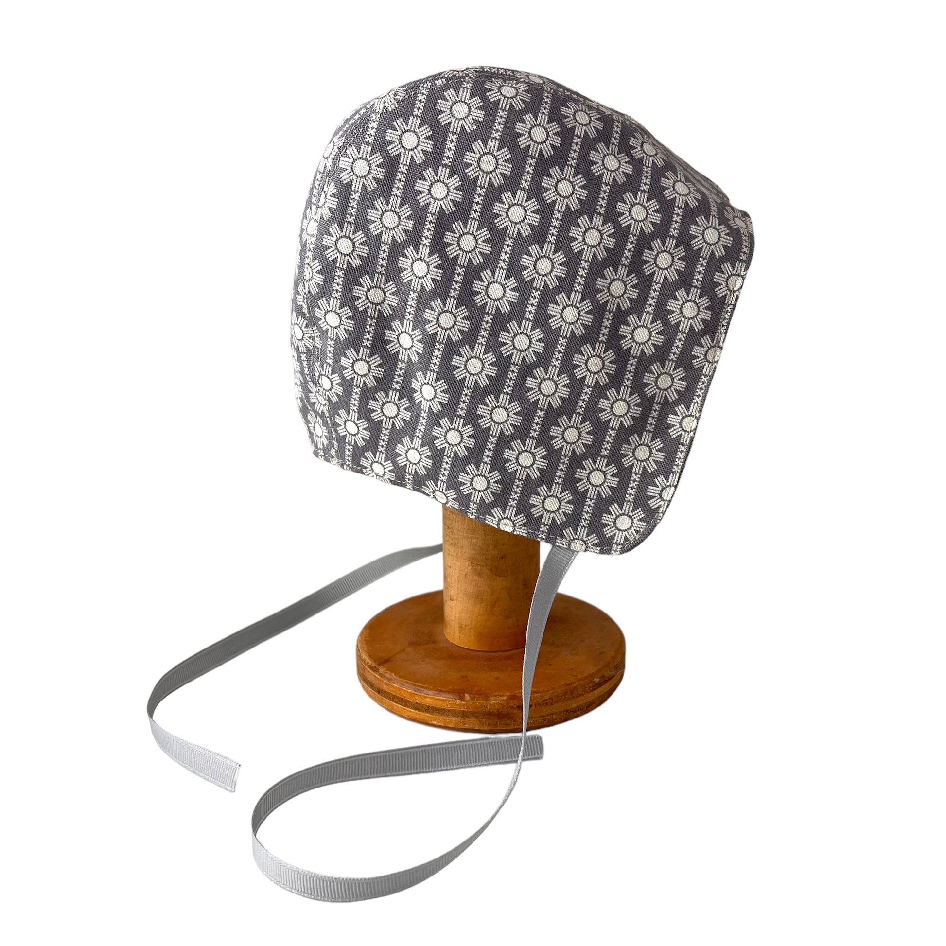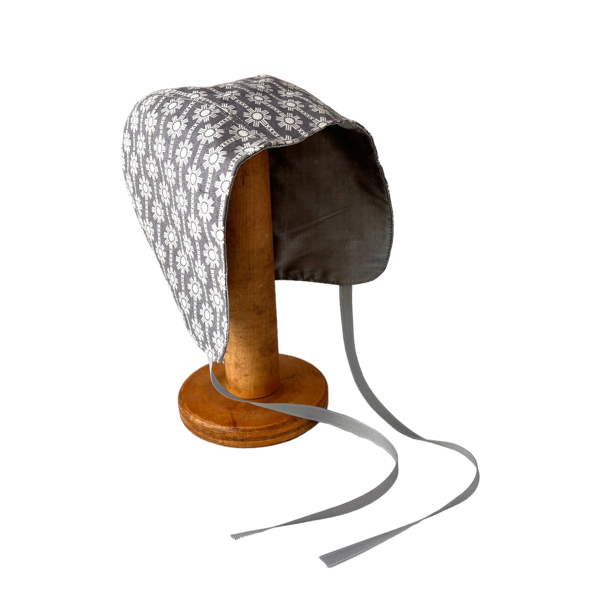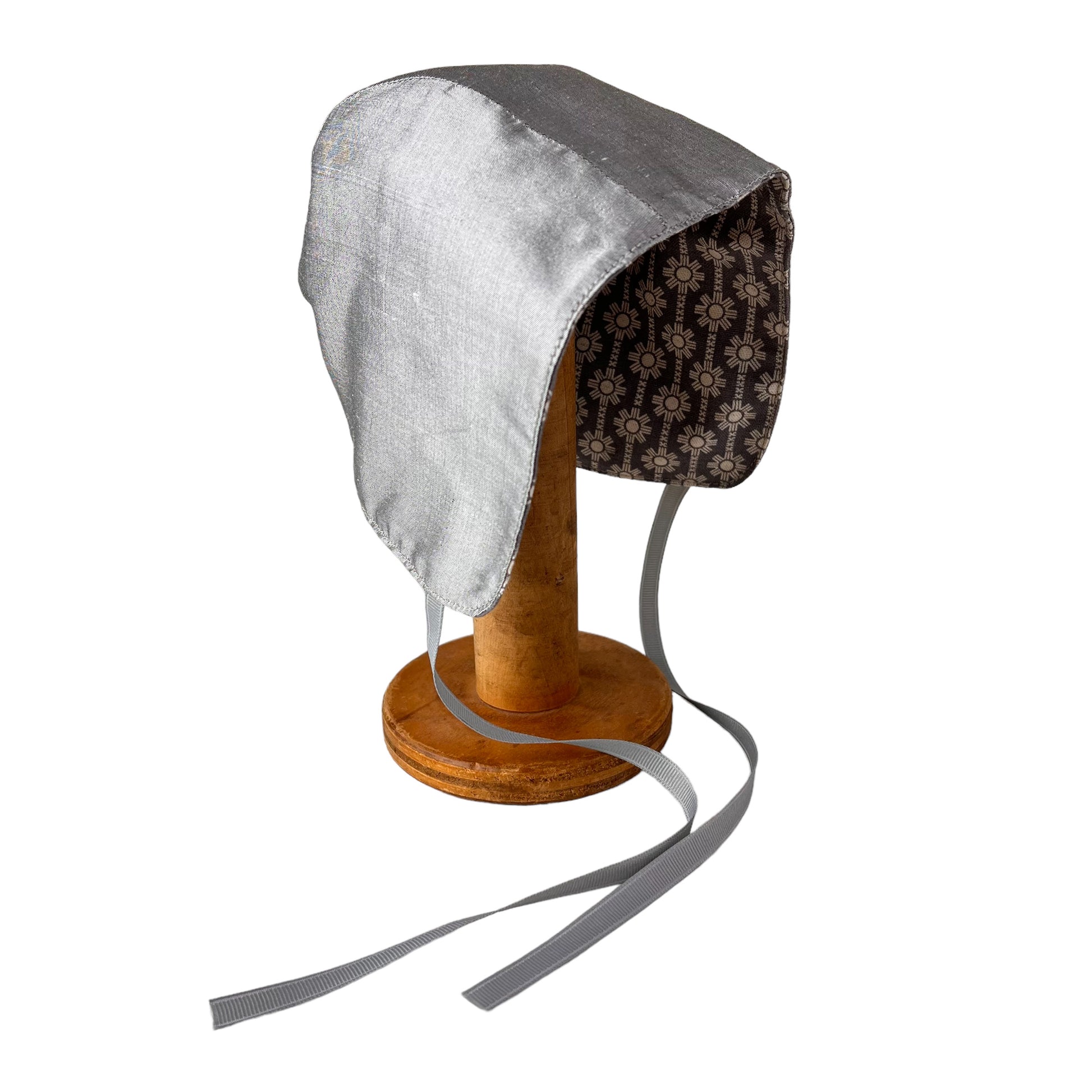 This reversible bonnet has 100% cotton print fabric on one side. The other side is 100% silver color dupioni silk.