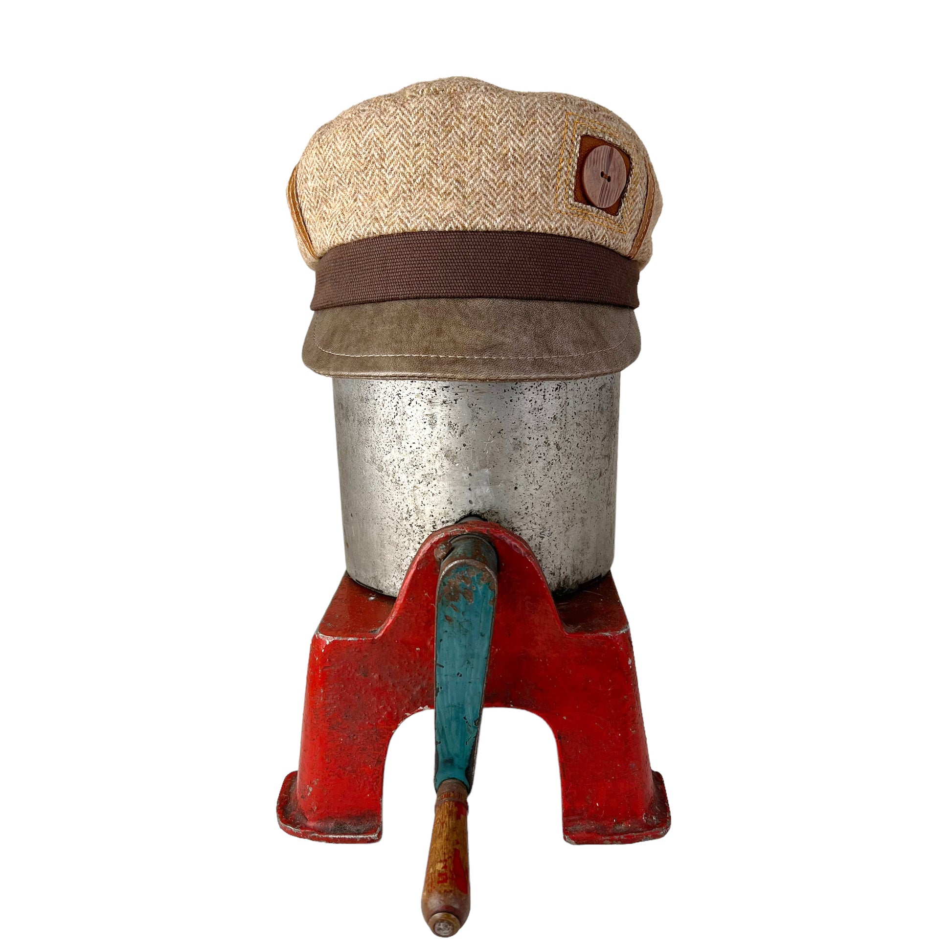 The outside of this hat has been hand cut from a beige tan herringbone wool weave. The brown band is made from a strong basket weave cotton. I hand cut my peak from a taupe lamb leather and reinforce it with a leather board inside, then finish it off by top stitching on my leather machine. This antique celluloid button was chosen for this cap is from the 1920s