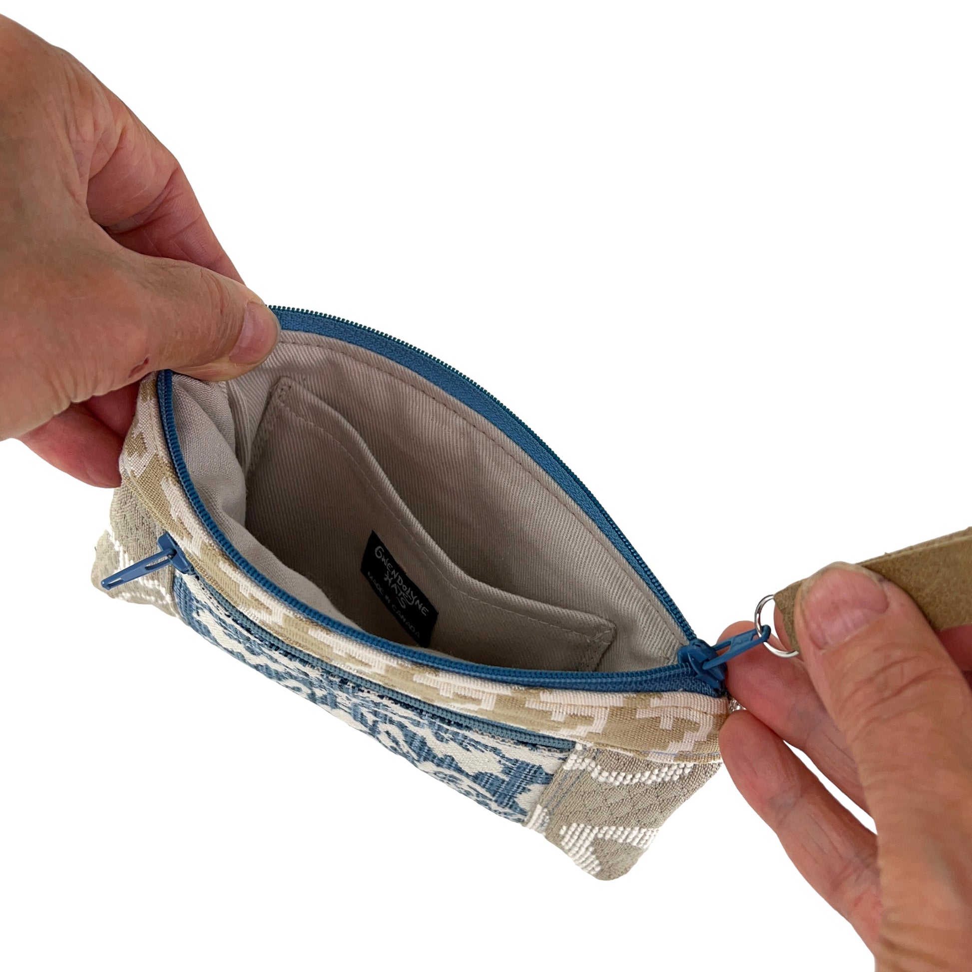 This one of a kind small beige white blue zipper wallet purse has been cut from a selection of exquisite tapestries creating its one of a kind patchwork wallet purse.