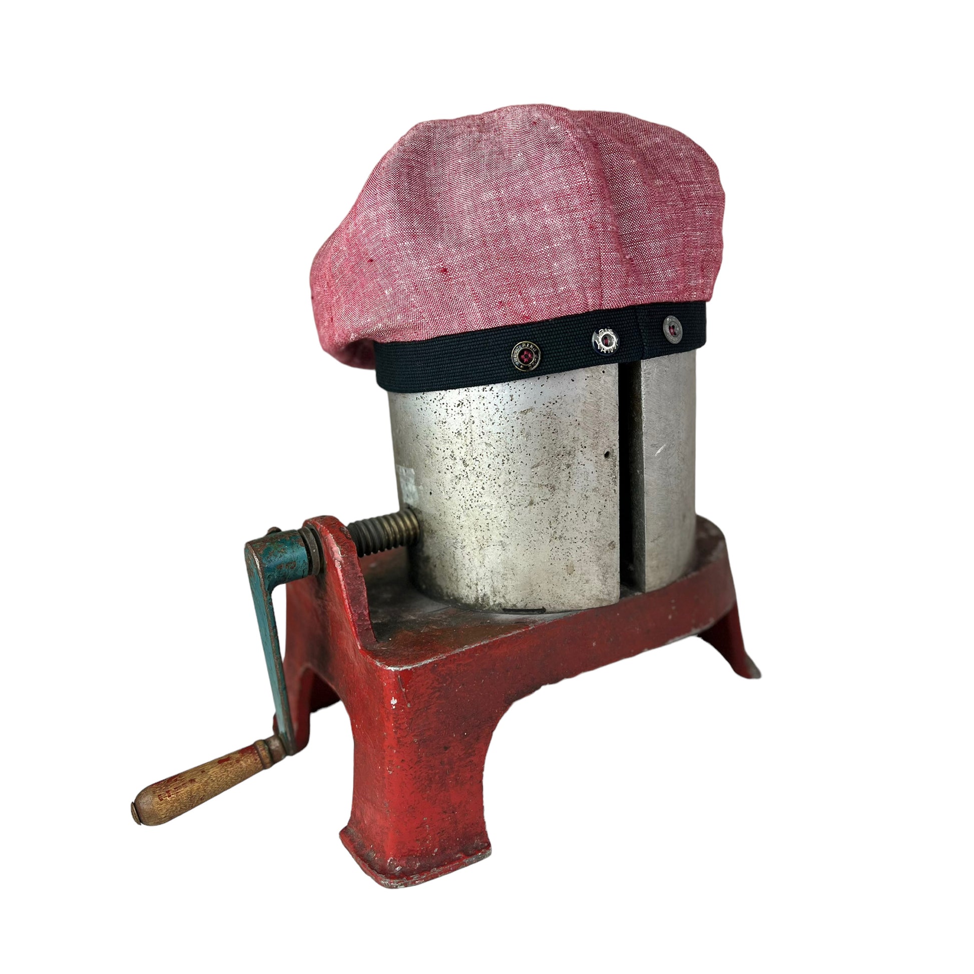 This unique small red shot white linen weave beret style hat is one of a kind. It is hand cut and sewn together with a light weight linen weave for the outer layer, and is embellished with 2 vintage buttons sewn on the sturdy black cotton band. The top is finished with a antique shell button.