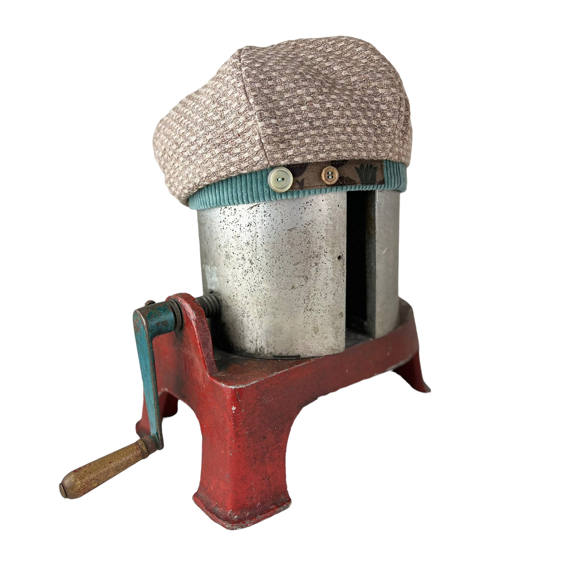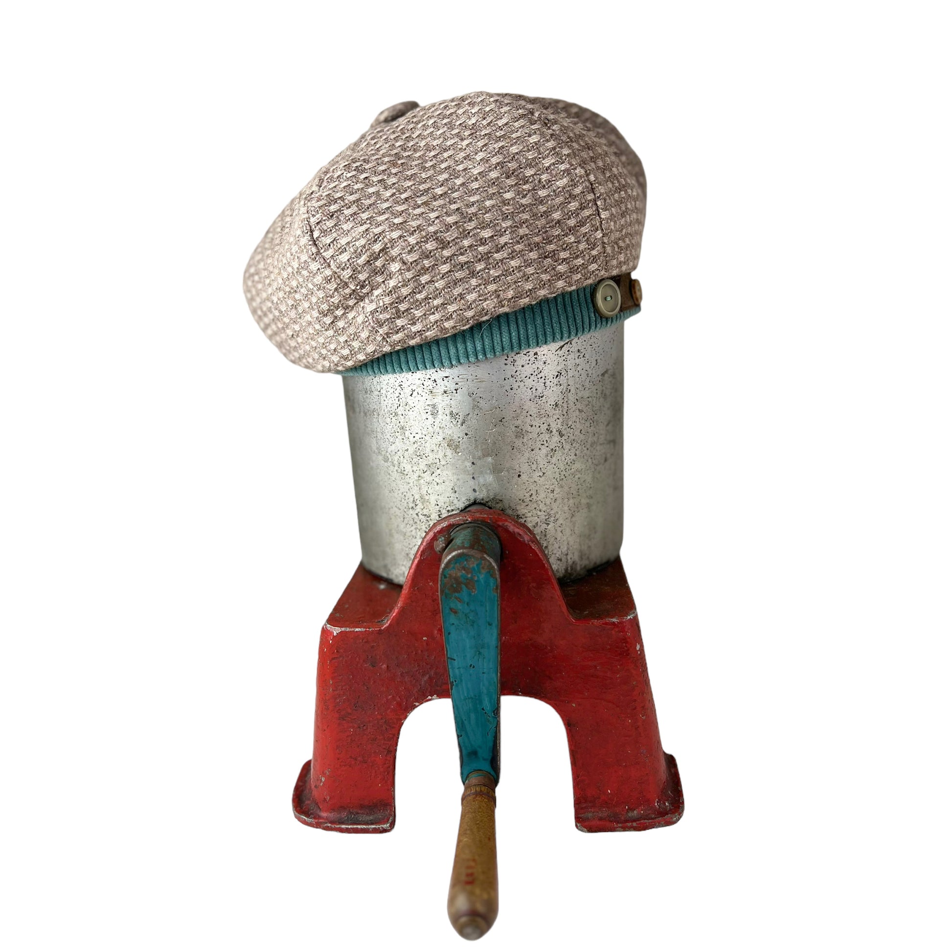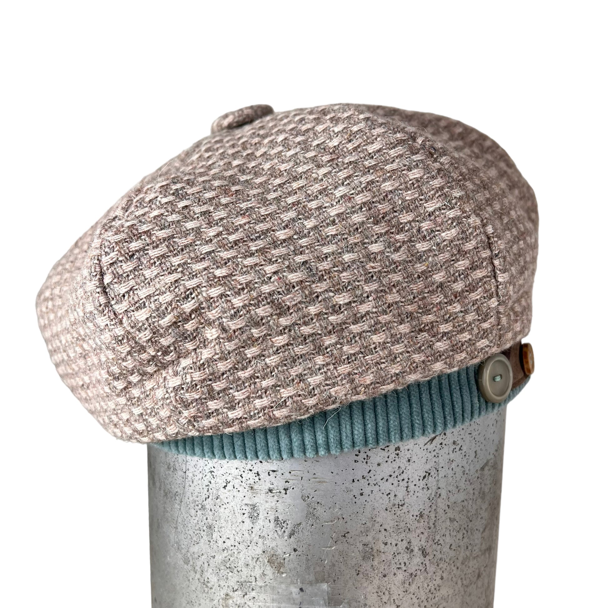 This unique beige tan wool weave beret style hat is one of a kind. It is hand cut and sewn together with a wool weave for the outer layer, and is embellished with 2 vintage buttons sewn on the printed leather which is sewn onto a cotton corduroy band. The top is finished with a covered button in the same wool fabric.
