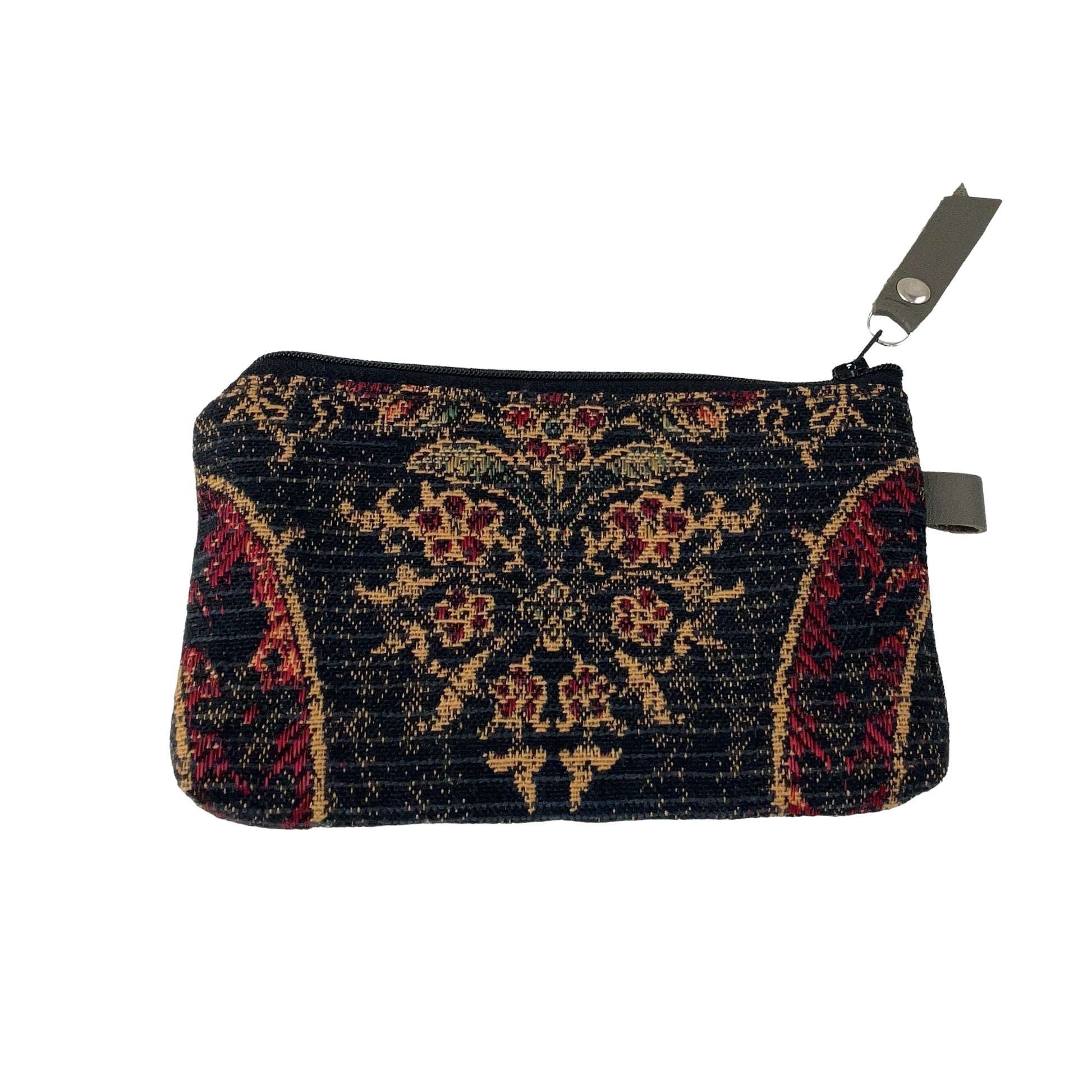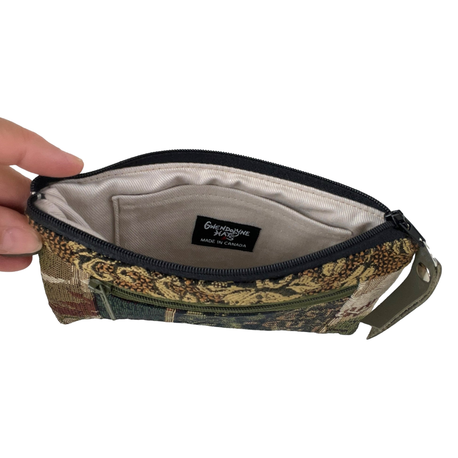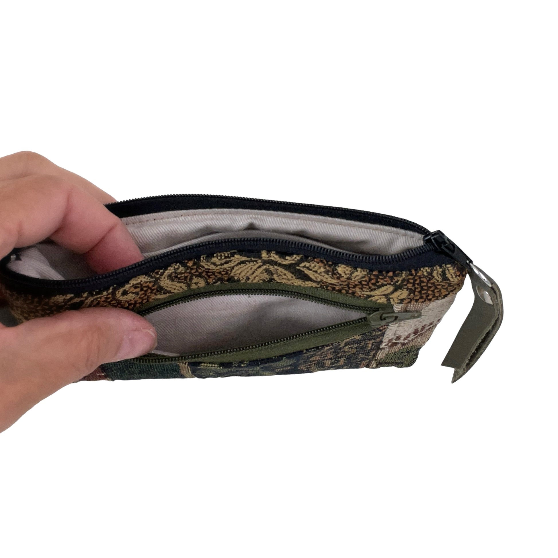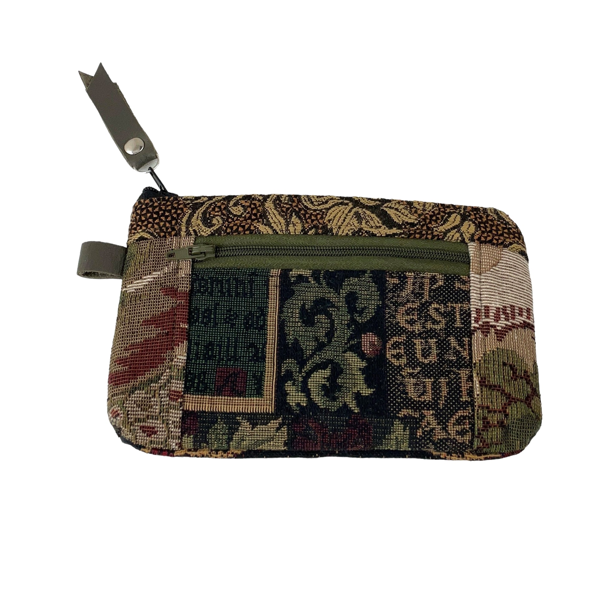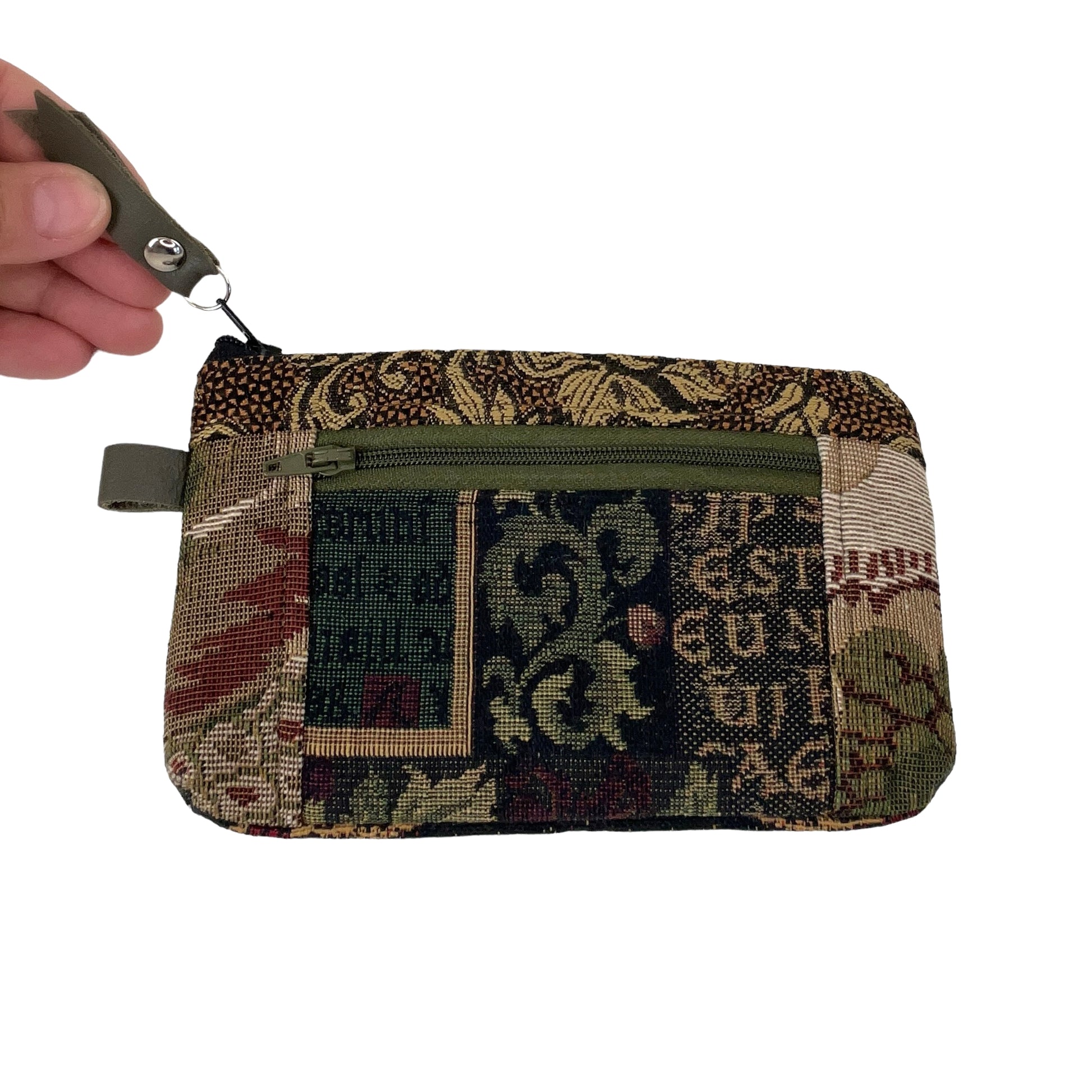 This one of a kind small green brown and black zipper wallet purse has been cut from a selection of exquisite tapestries creating its one of a kind patchwork wallet purse.