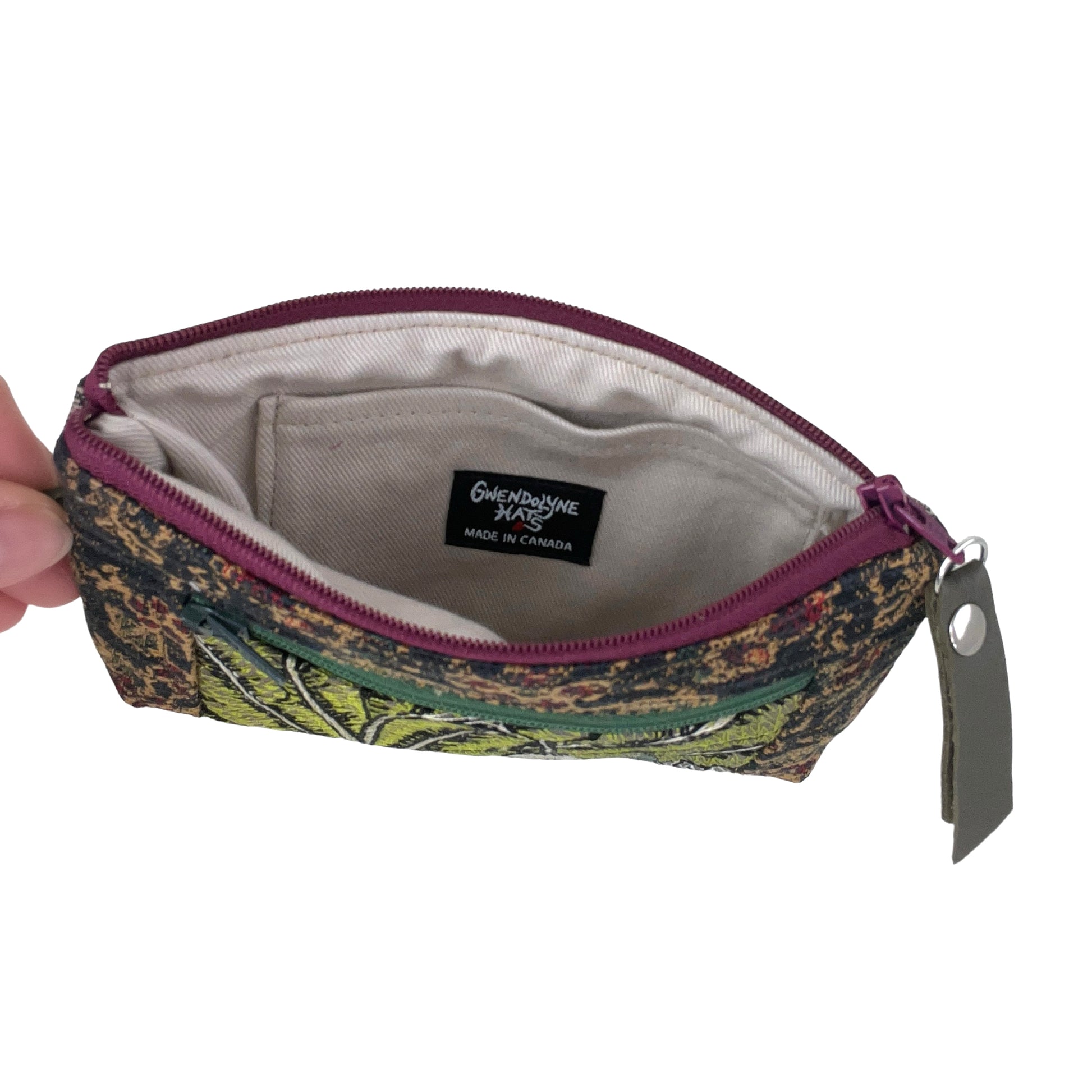 It measures 6 1/4” wide and 3 1/4” deep. The small front panel zipper pocket measures 4” across and is 2 5/8” deep. There is a small inside card pocket that can hold 4 credit cards.