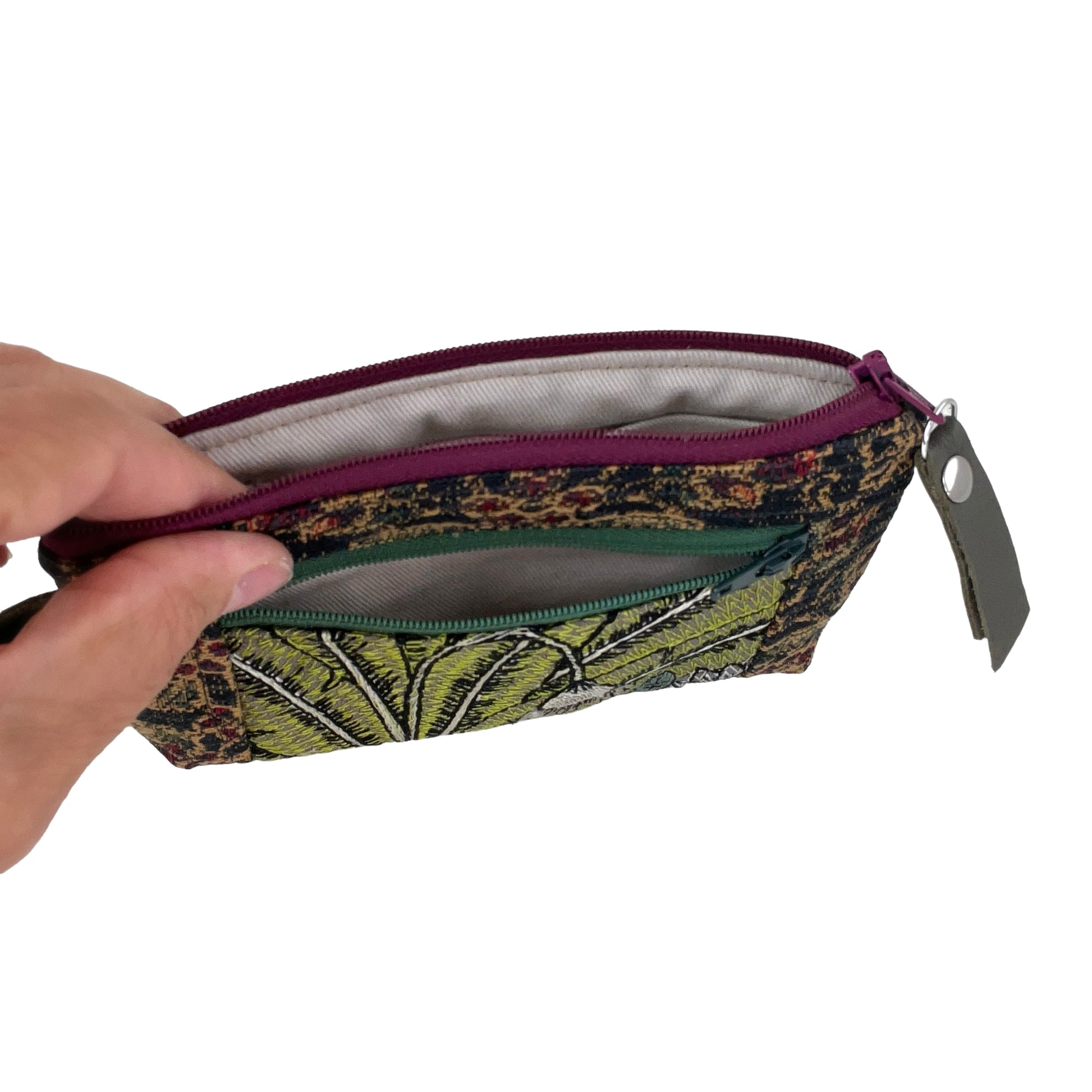 I select and cut an individual colour pallet for each wallet I make. Then I sew the wallet together and finish it with a cowhide side loop and a zipper fob. Great care and love of fabric and sewing is done while I work.