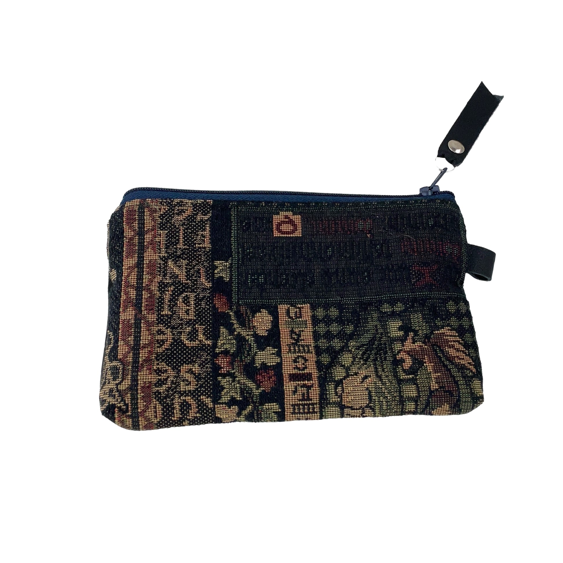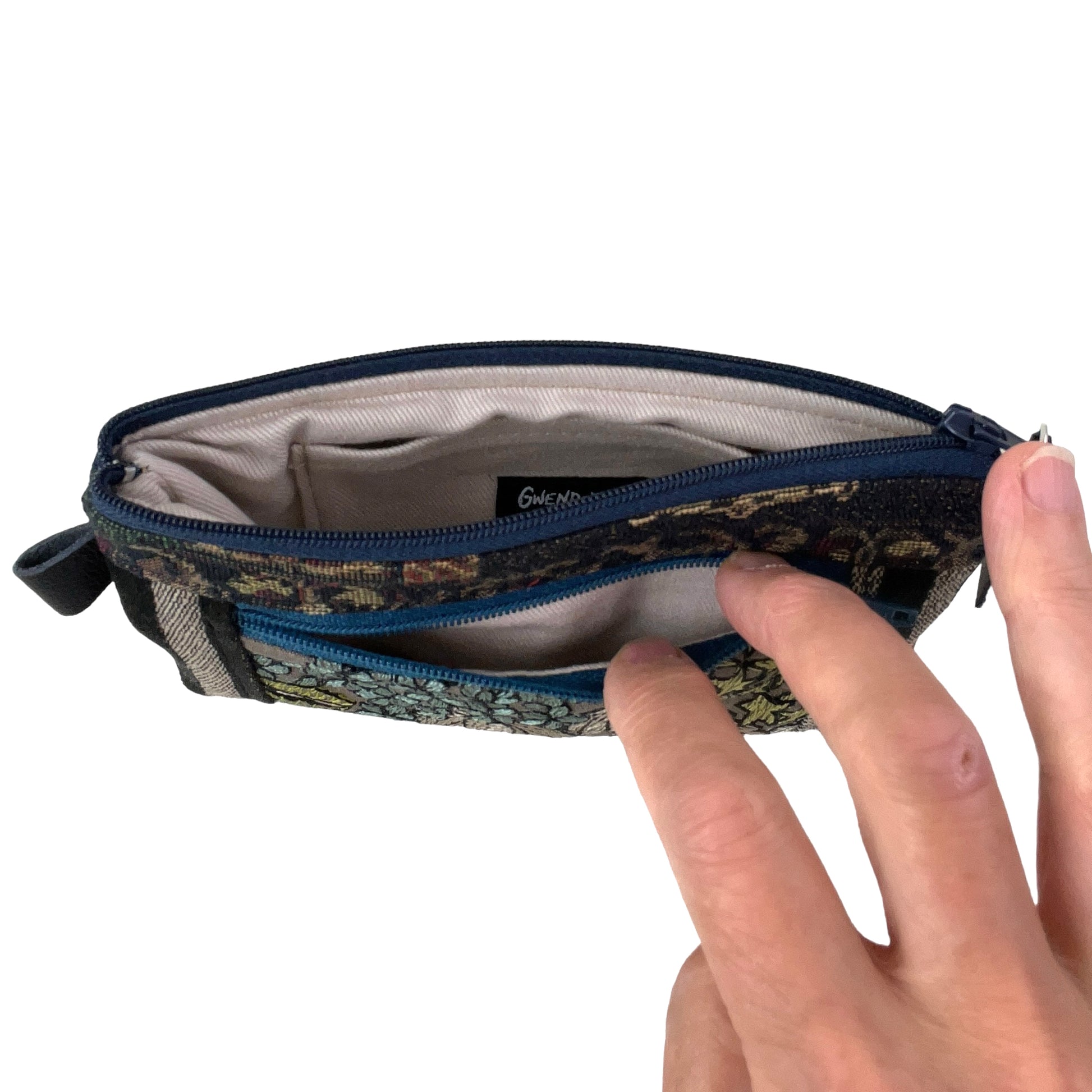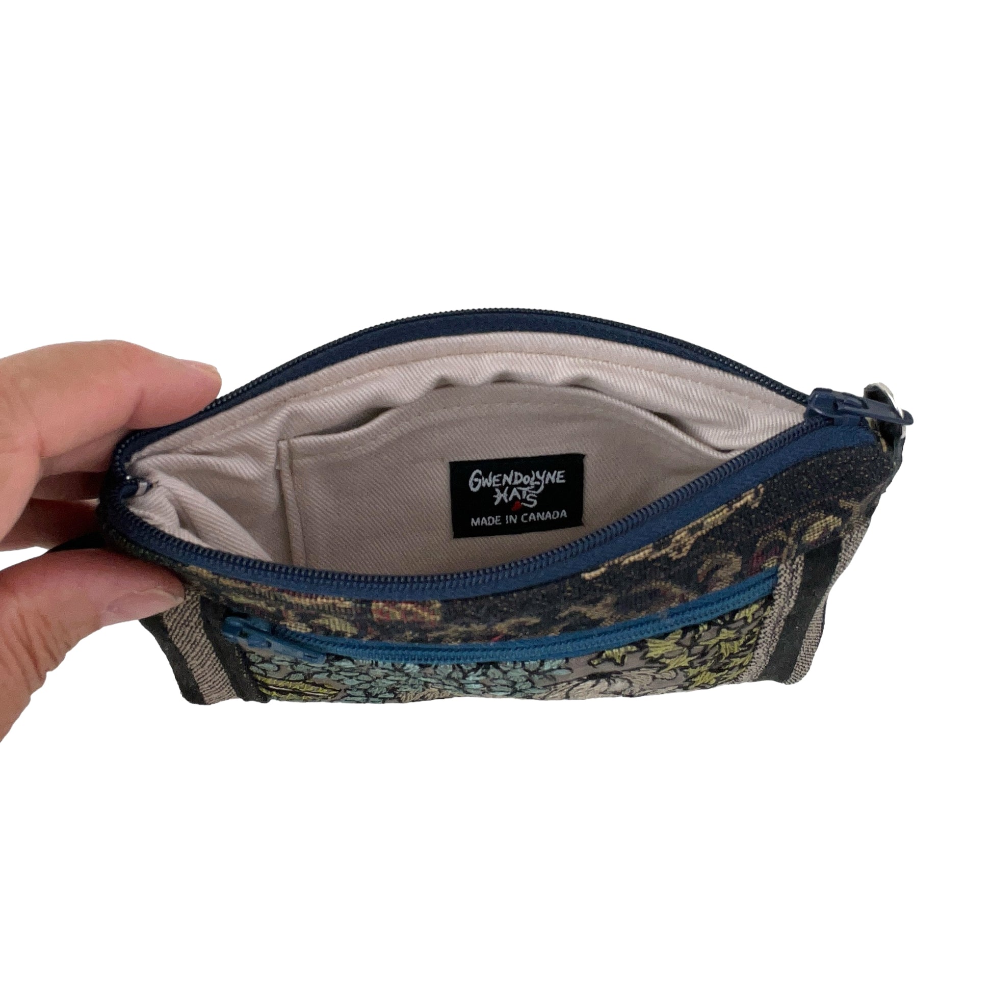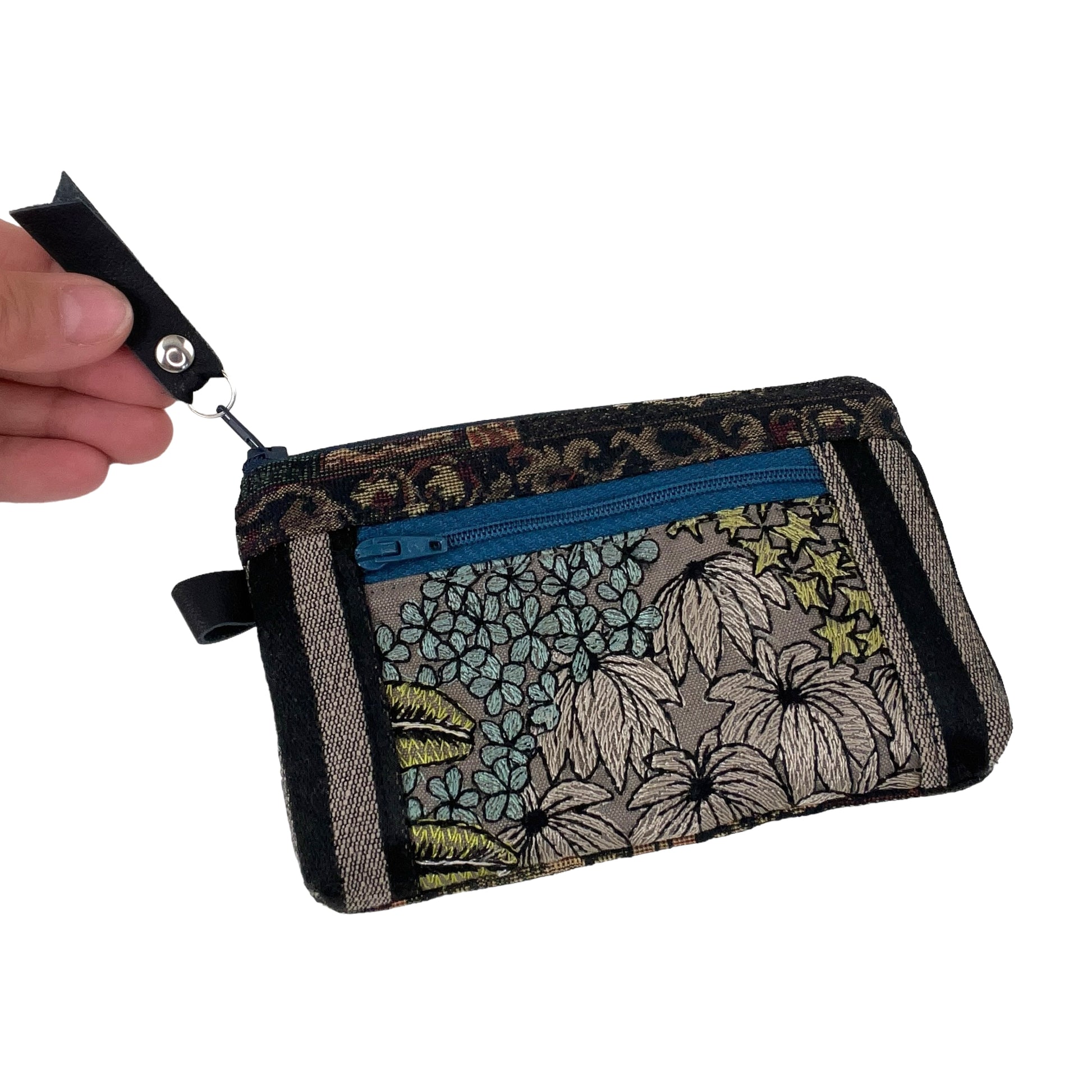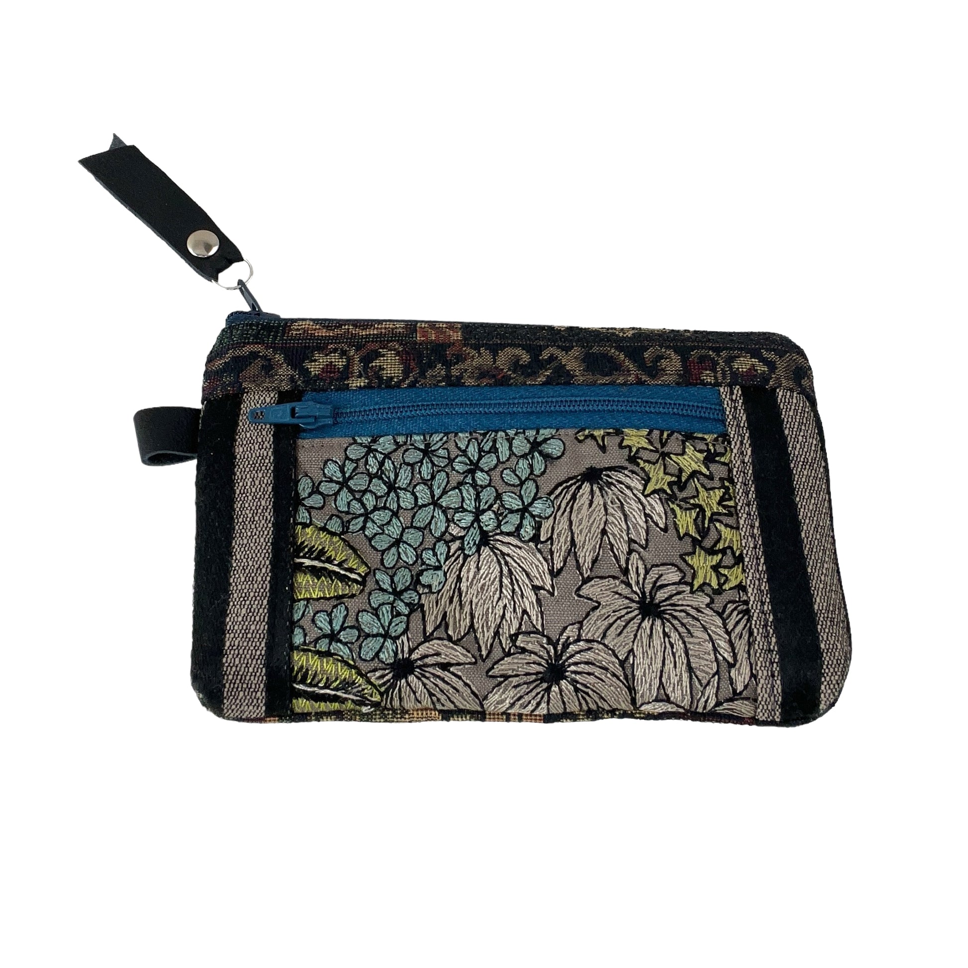 This one of a kind small grey black and blue zipper wallet purse has been cut from a selection of exquisite tapestries creating its one of a kind patchwork wallet purse.