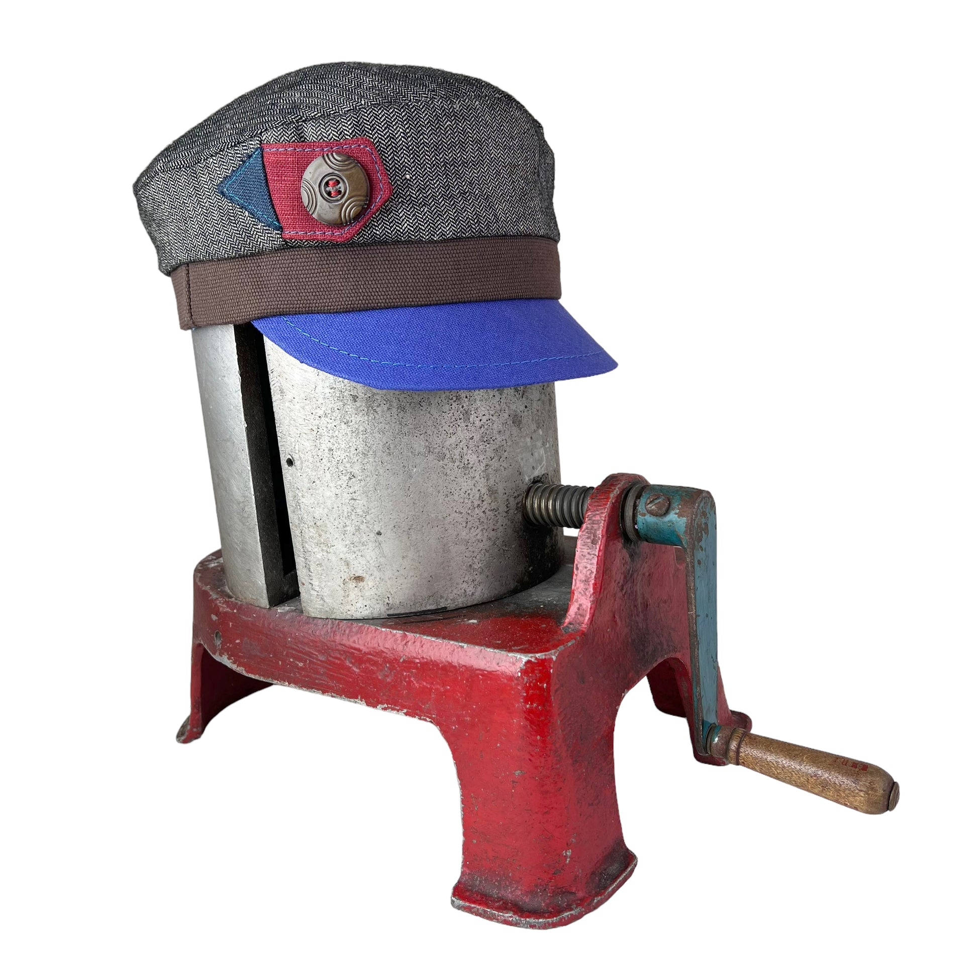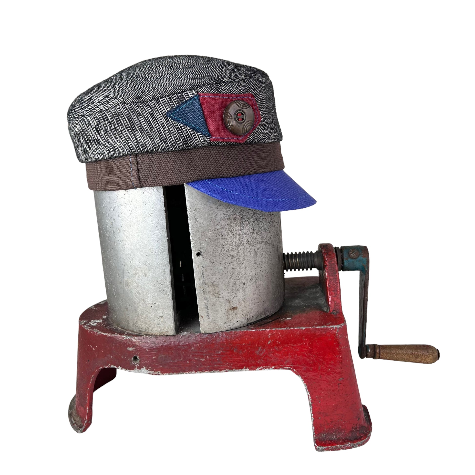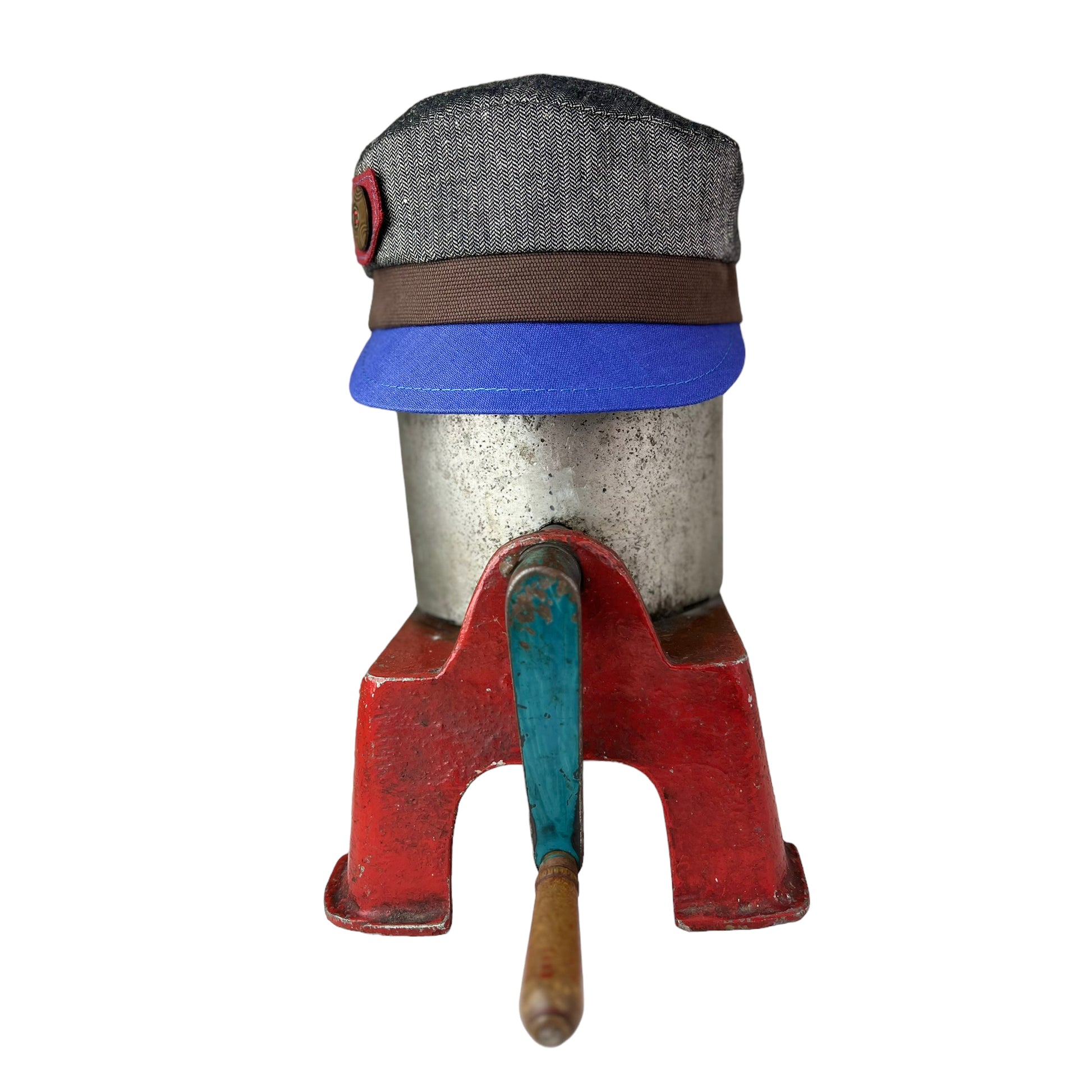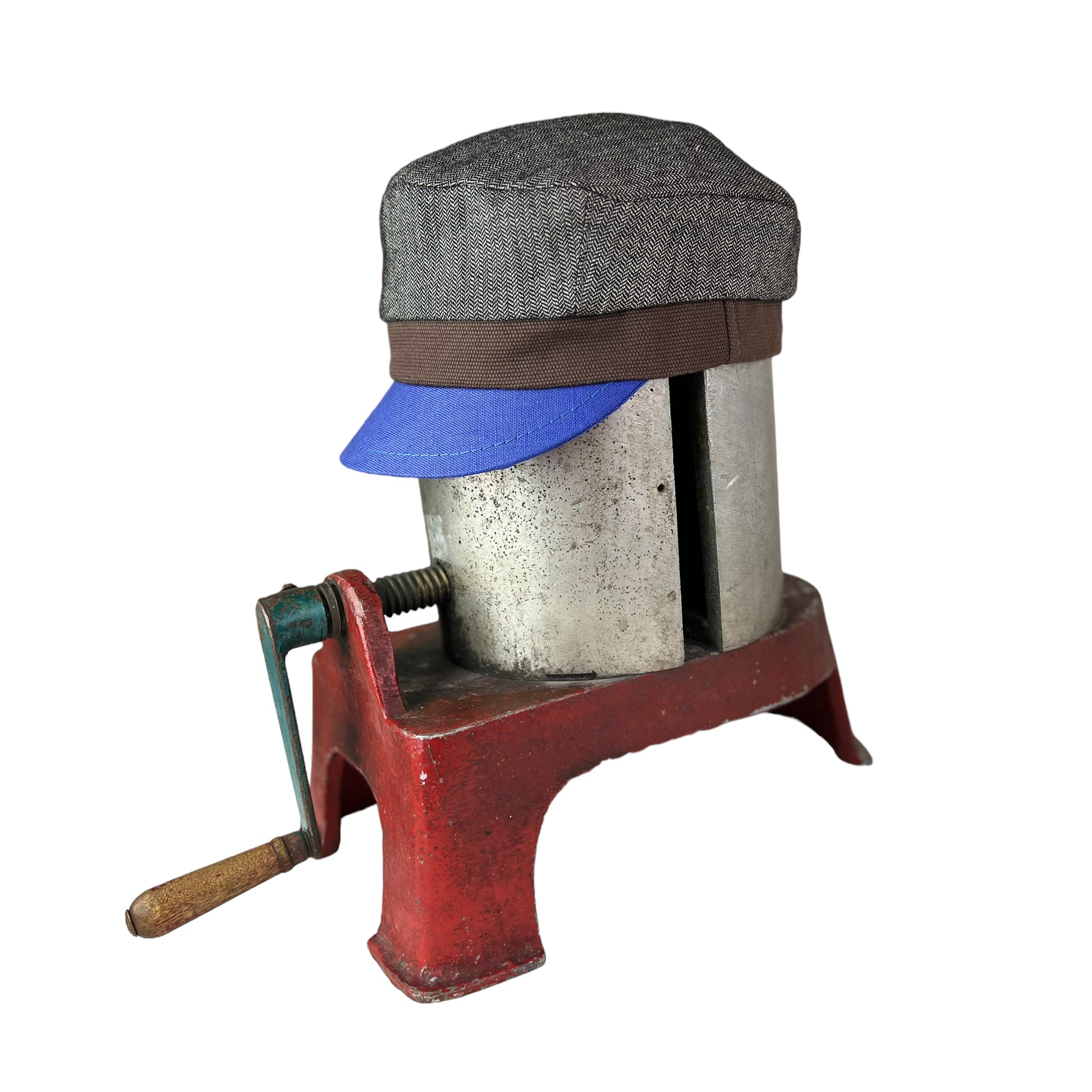 The outside of this cap has been hand cut from a shot black white linen weave. The brown band is made from a strong basket weave cotton. The royal blue linen peak is made from a sturdy flexible leather board which I top stitch on my leather machine. The cap is embellished with a 1920s celluloid button strap detail.