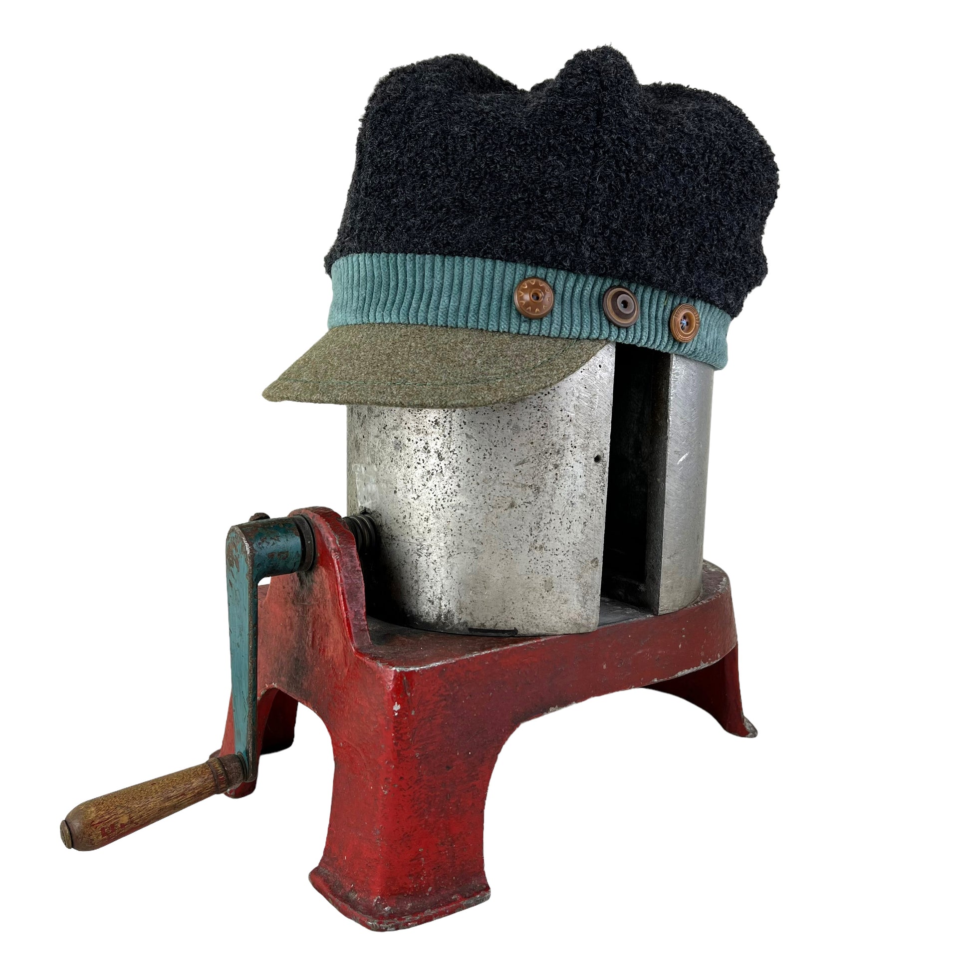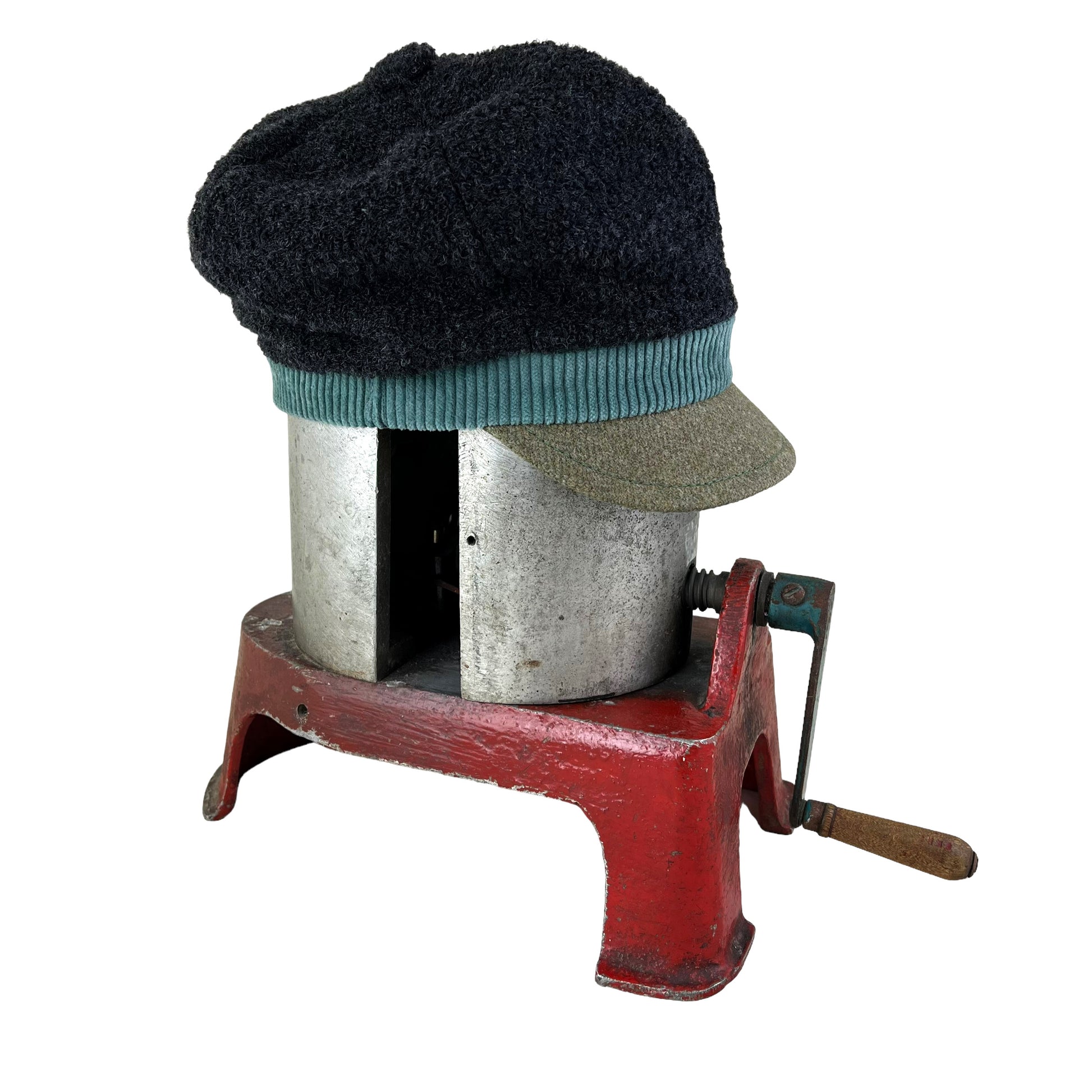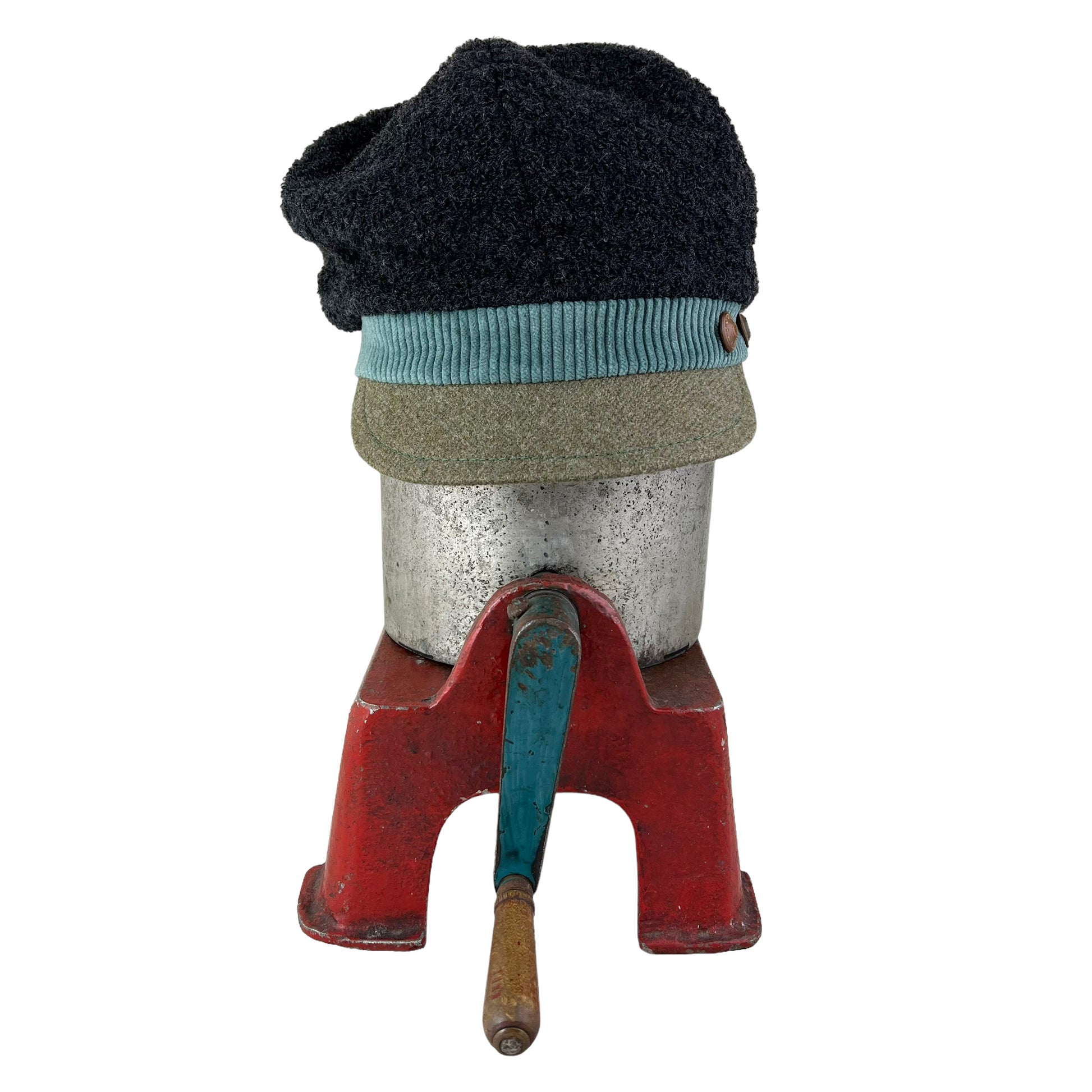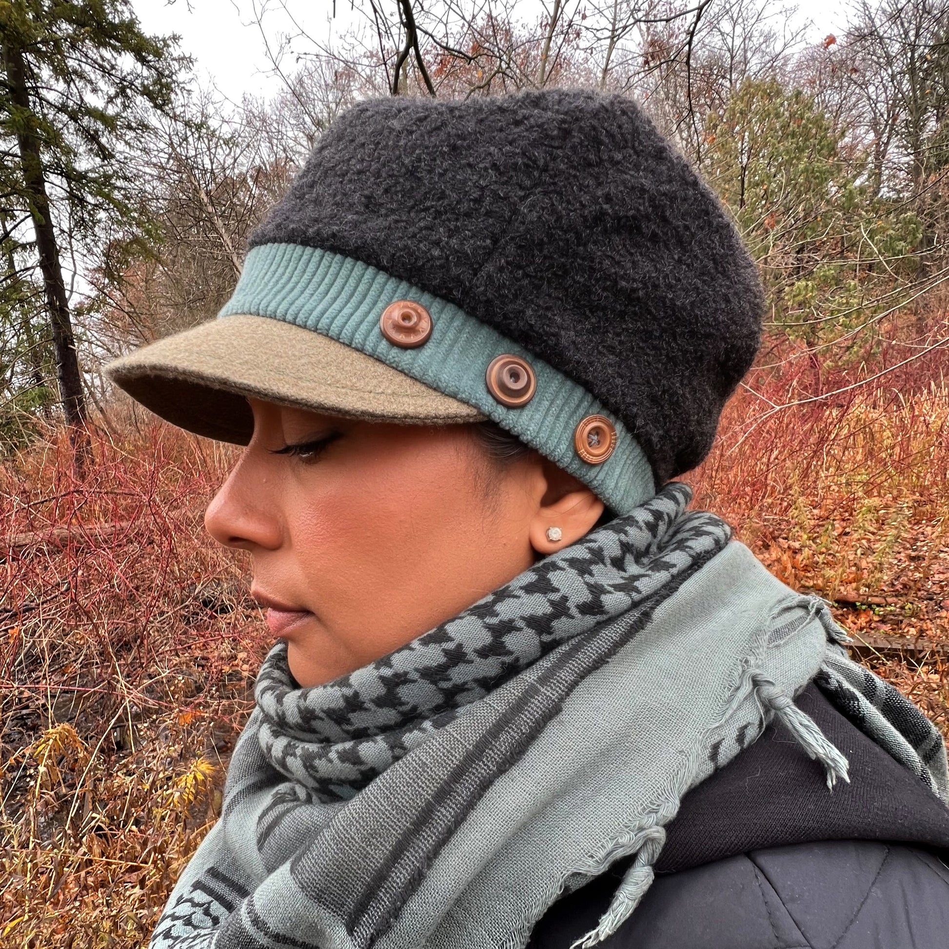 The outside of this hat has been hand cut from a soft dark charcoal bouclé wool weave. The band is made from a sturdy and plush Dutch cotton corduroy weave. This hand cut peak is cut from a sage coloured herringbone weave and that is reinforced with a leather board inside. It is then finished by top stitching on my leather machine. The 3 antique Tagua (vegetable ivory) buttons were chosen from my collection as a side embellishment. Accented by a bouclé black covered button on the top. The lining is cut from a olive green taffeta silk which makes the cap very breathable and eliminates hat hair, due to the natural choice of materials.