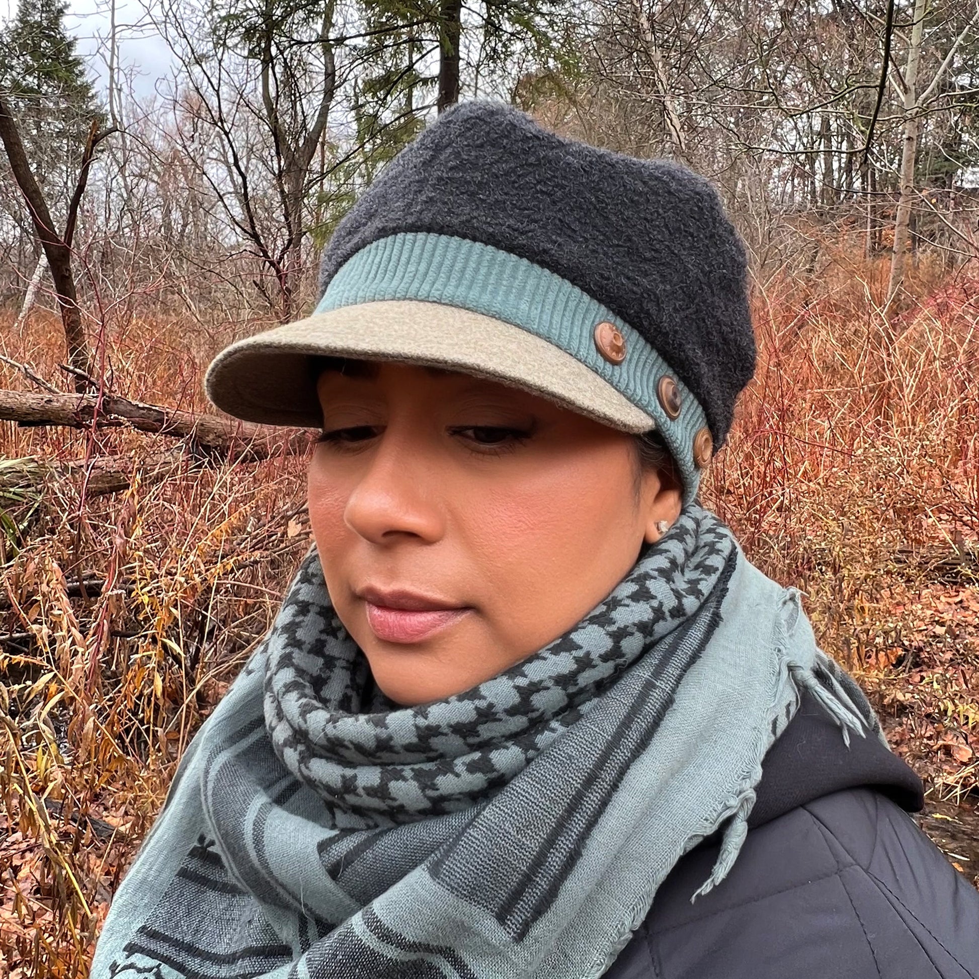 The "Rowan Bouclé Wool Cap" is a take on the classic Newsboy style. Designed to wear in the mid seasons like Spring and Fall. This casual feminine sensible design has a cozy feel and looks terrific with any black coat.