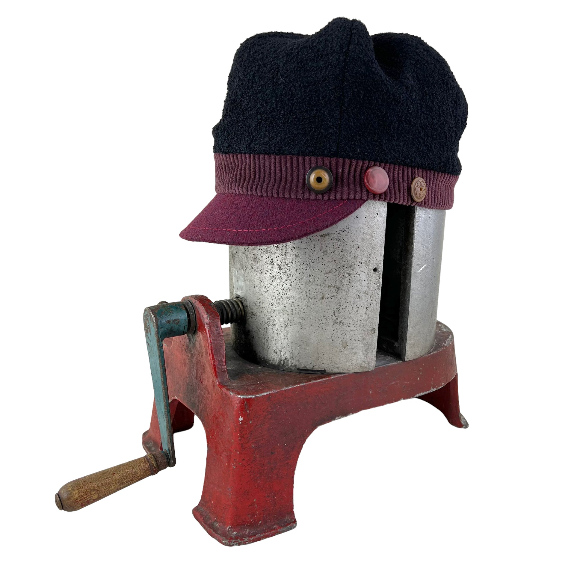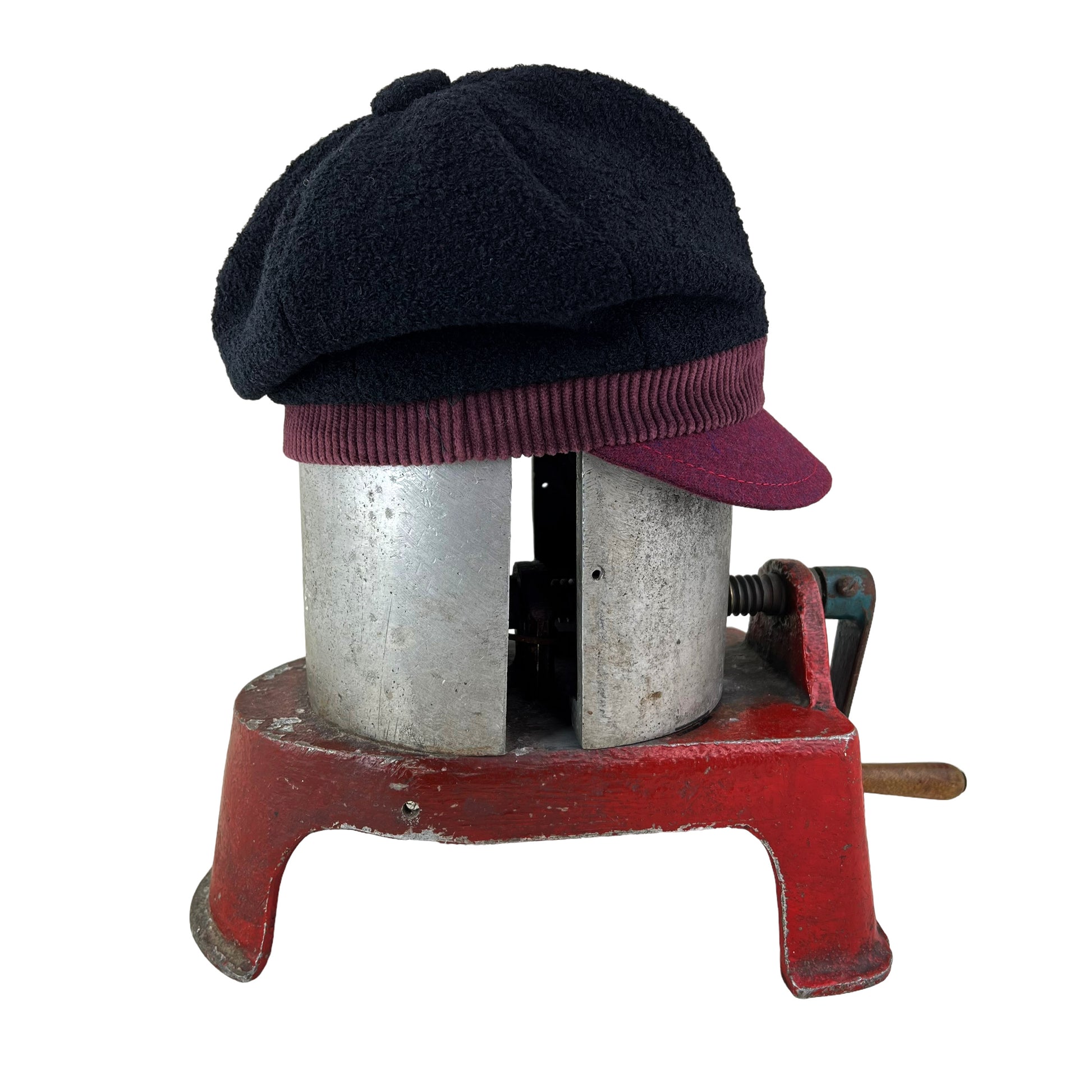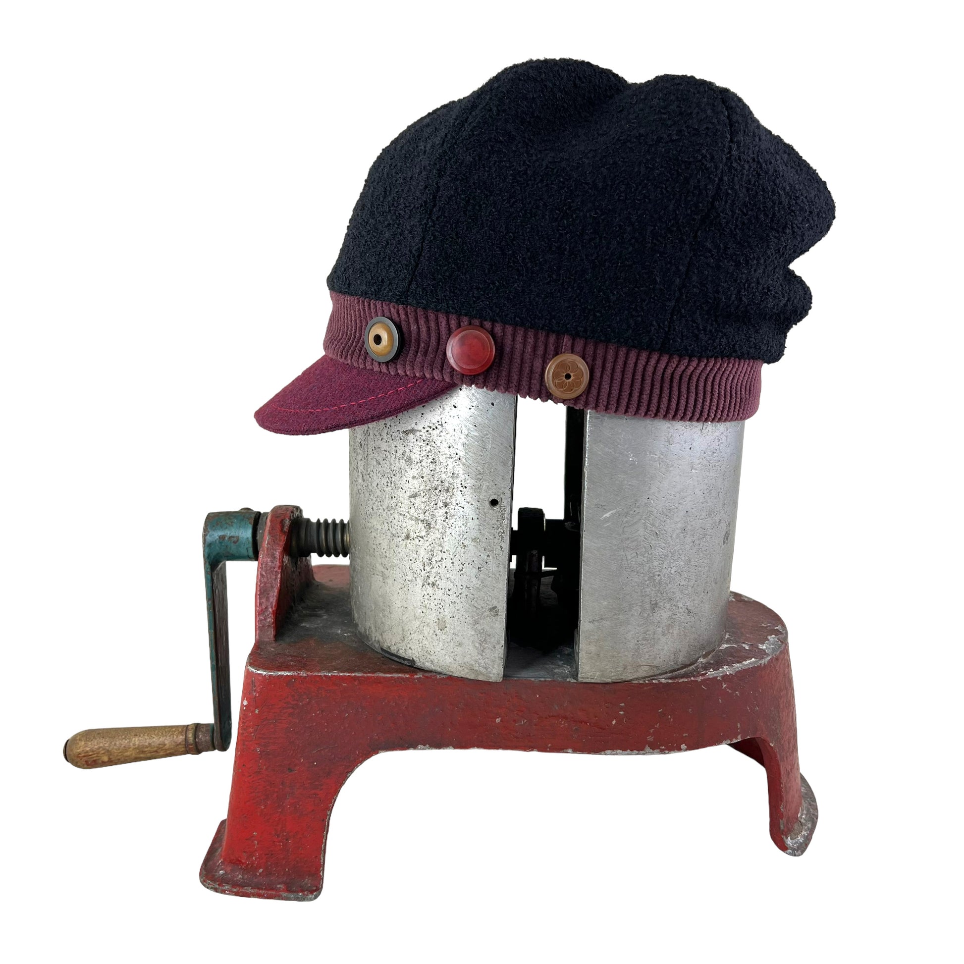 The outside of this hat has been hand cut from a soft black bouclé wool weave. The band is made from a sturdy and plush Dutch cotton corduroy weave. This hand cut peak is cut from a wine coloured wool twill weave and that is reinforced with a leather board inside. It is then finished by top stitching on my leather machine. The 3 antique Tagua (vegetable ivory) buttons were chosen from my collection as a side embellishment. Accented by a bouclé black covered button on the top. The lining is cut from a blue taffeta silk which makes the cap very breathable and eliminates hat hair, due to the natural choice of materials.