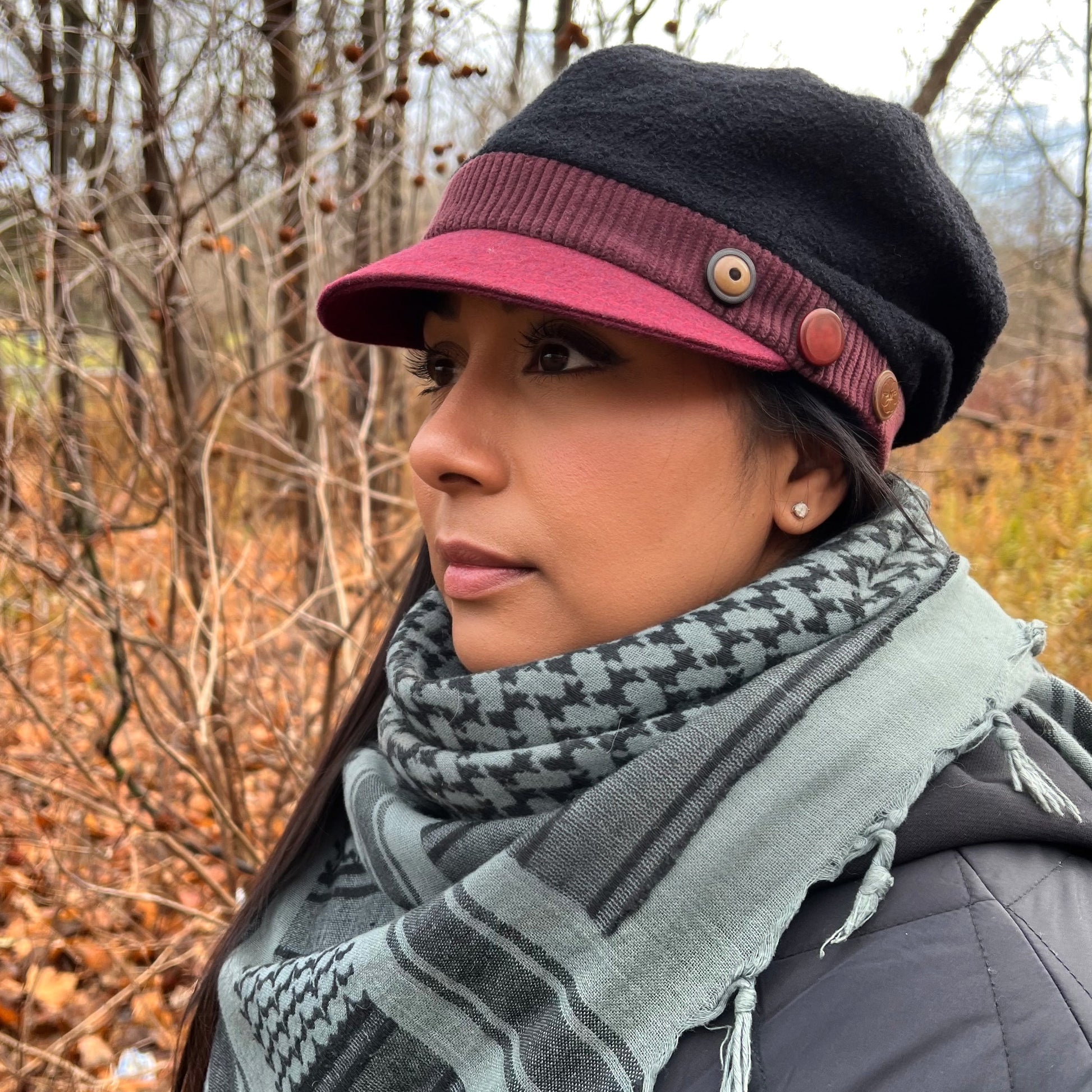 The "Rowan Bouclé Wool Cap" is a take on the classic Newsboy style. Designed to wear in the mid seasons like Spring and Fall. This casual feminine sensible design has a cozy feel and looks terrific with any black coat.