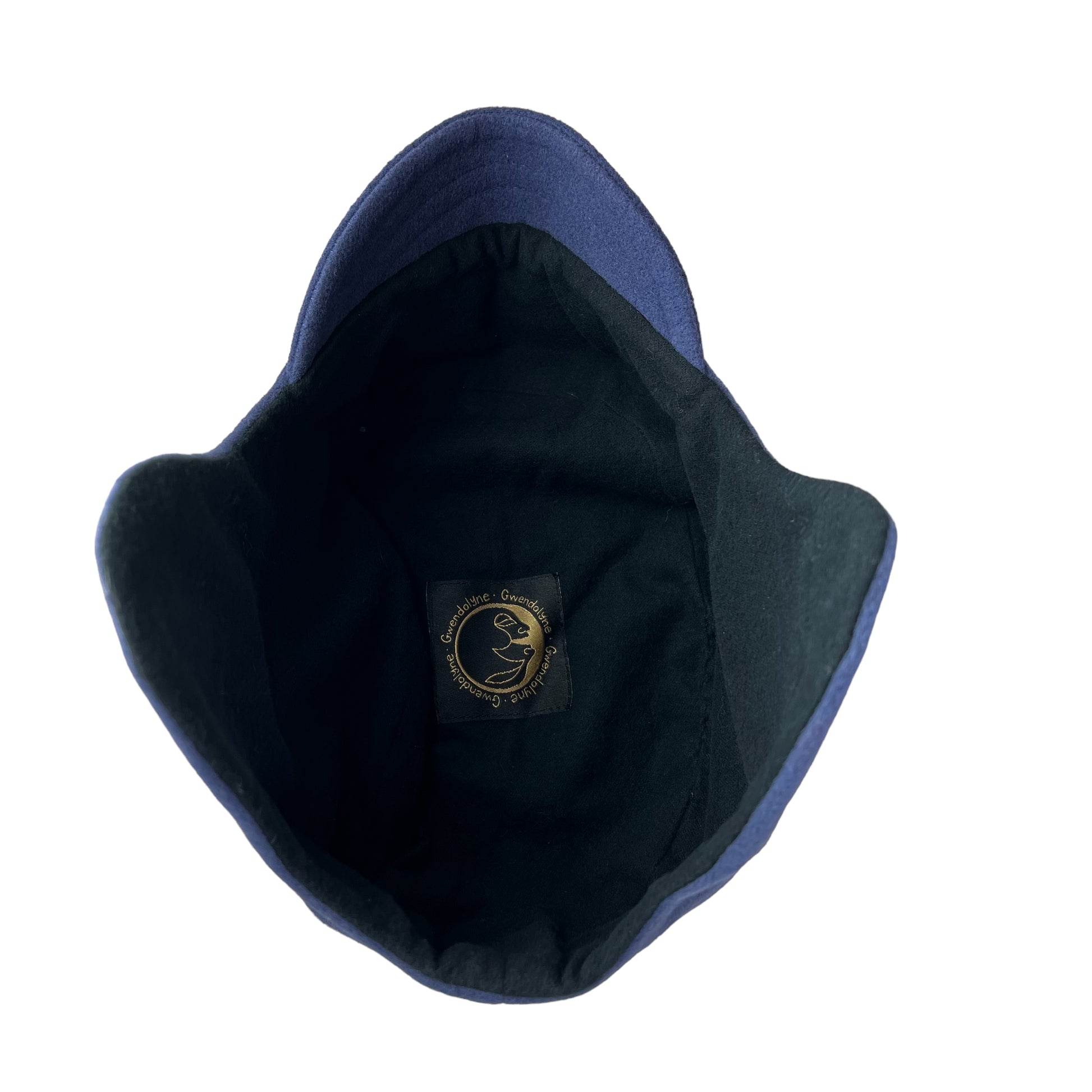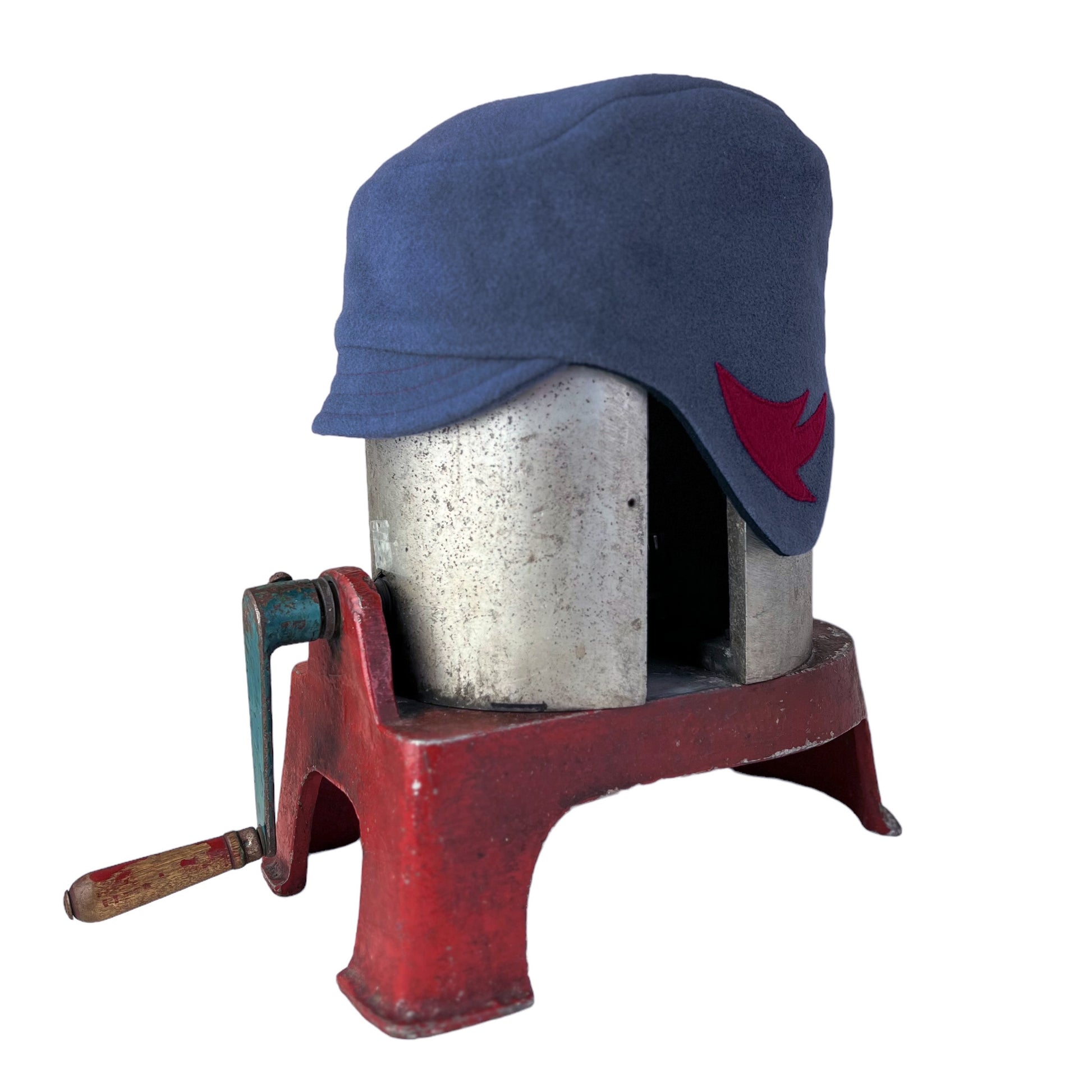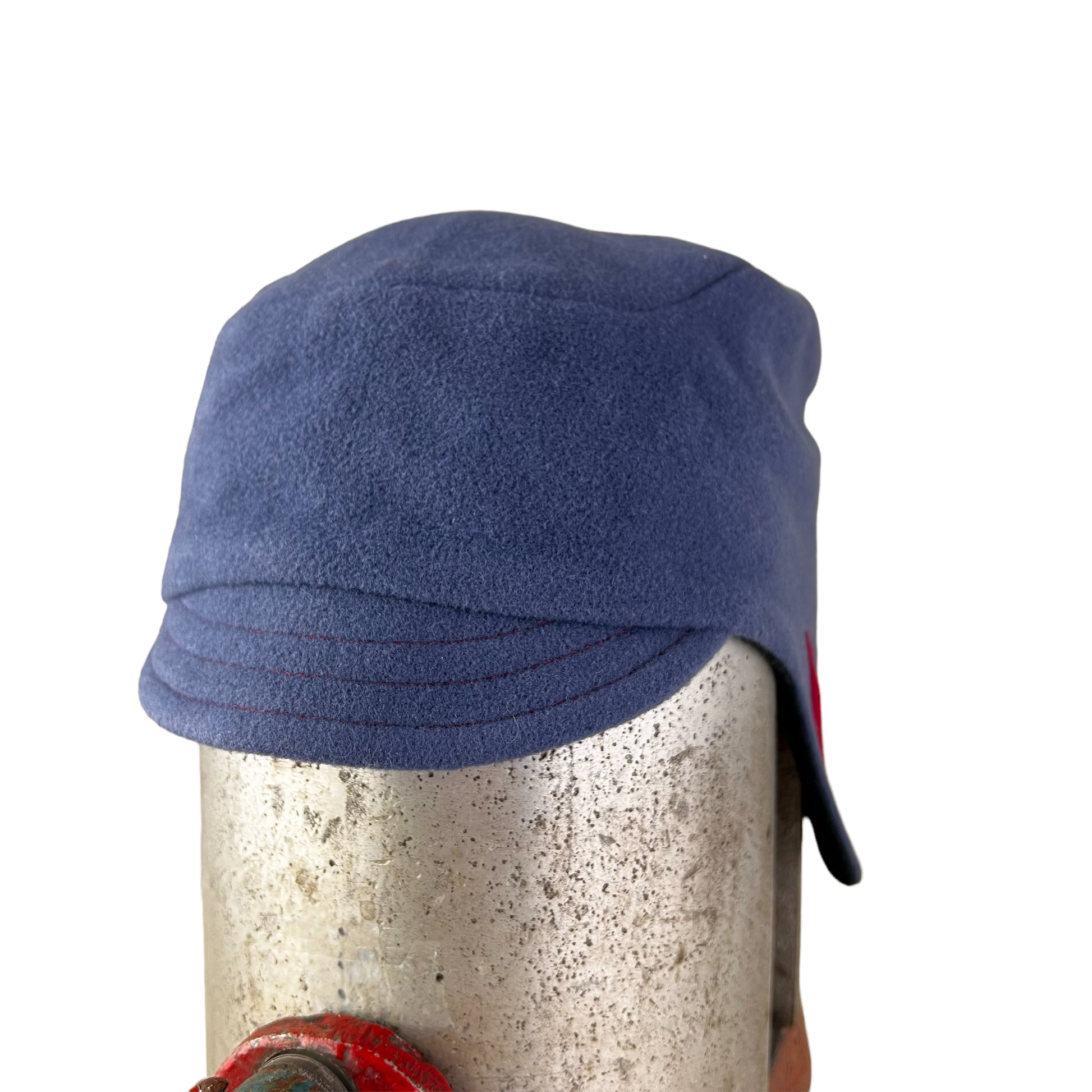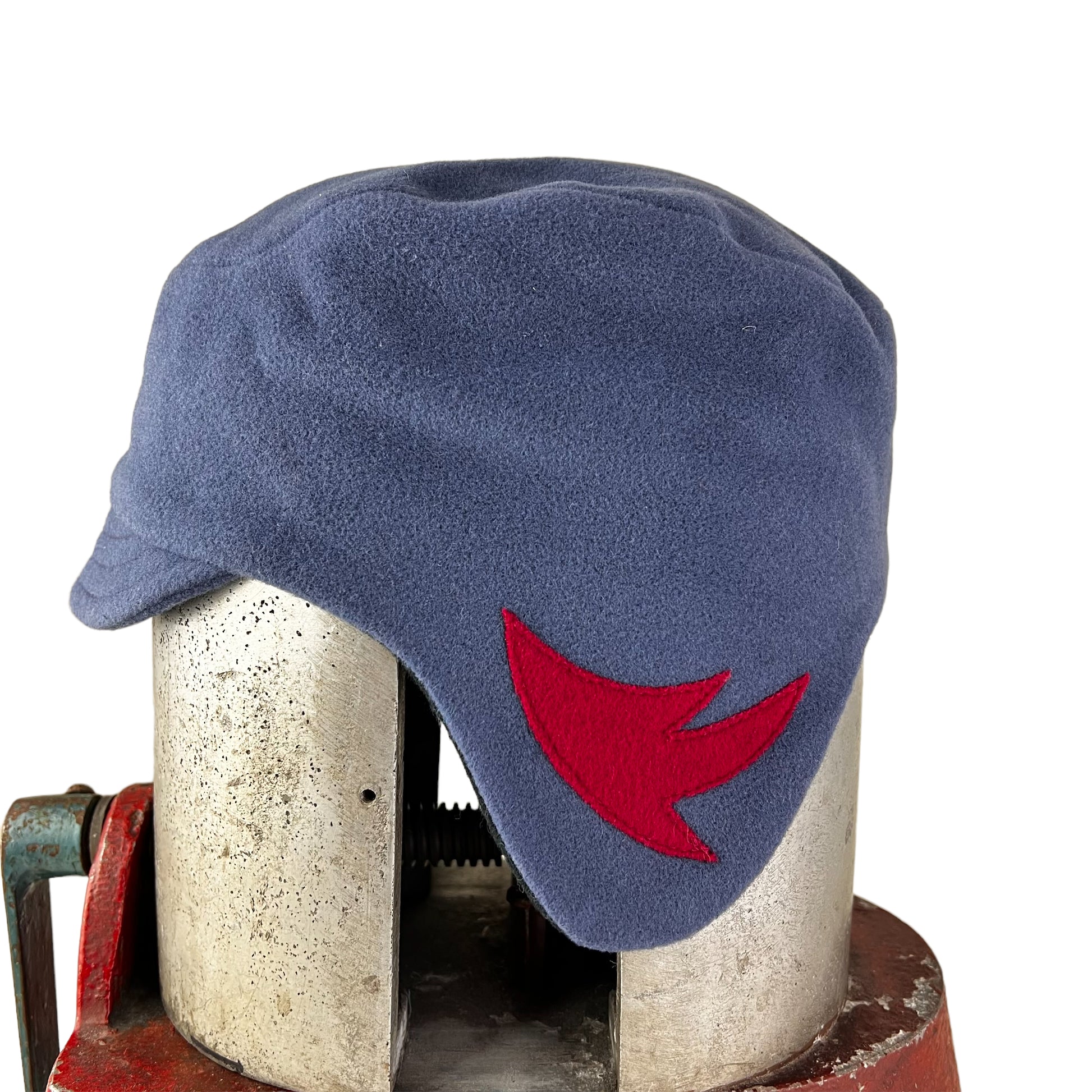 This X large funky wool ear flap helmet hat has been hand cut using a smoky blue light weight cashmere blend wool weave fabric for the outer layer. I have sewn a red appliqué wool wing motif on both flap sides. I named this hat "The Amelia" after Amelia Earhart the aviator.