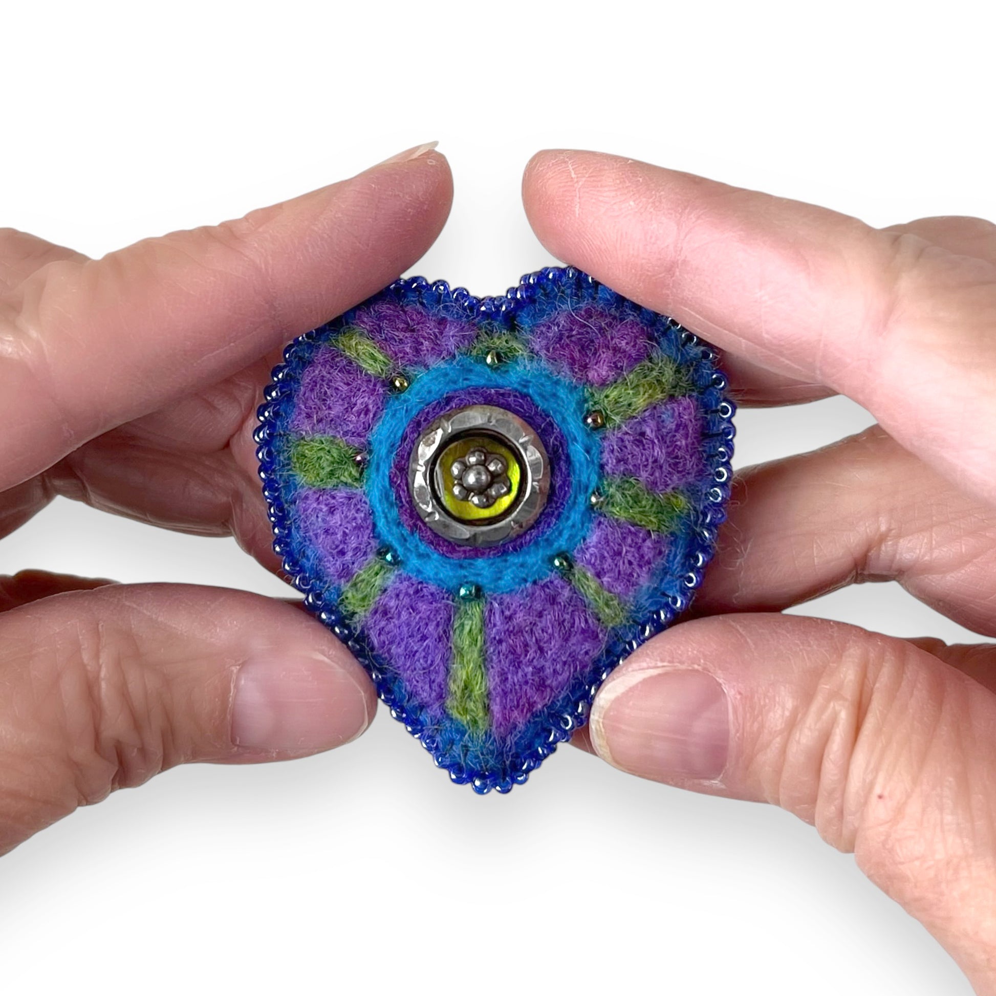 This blue and purple multi coloured heart felted pin is the fifteenth brooch I created, edition #15.