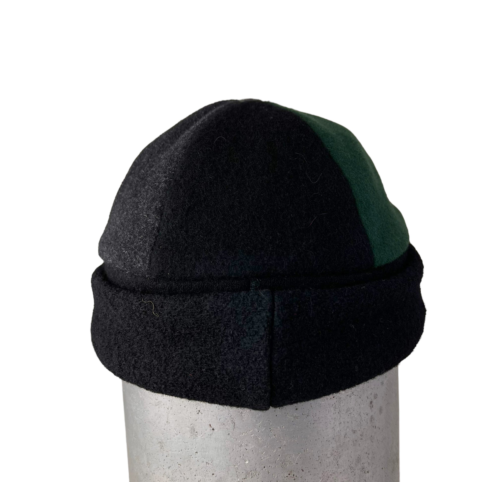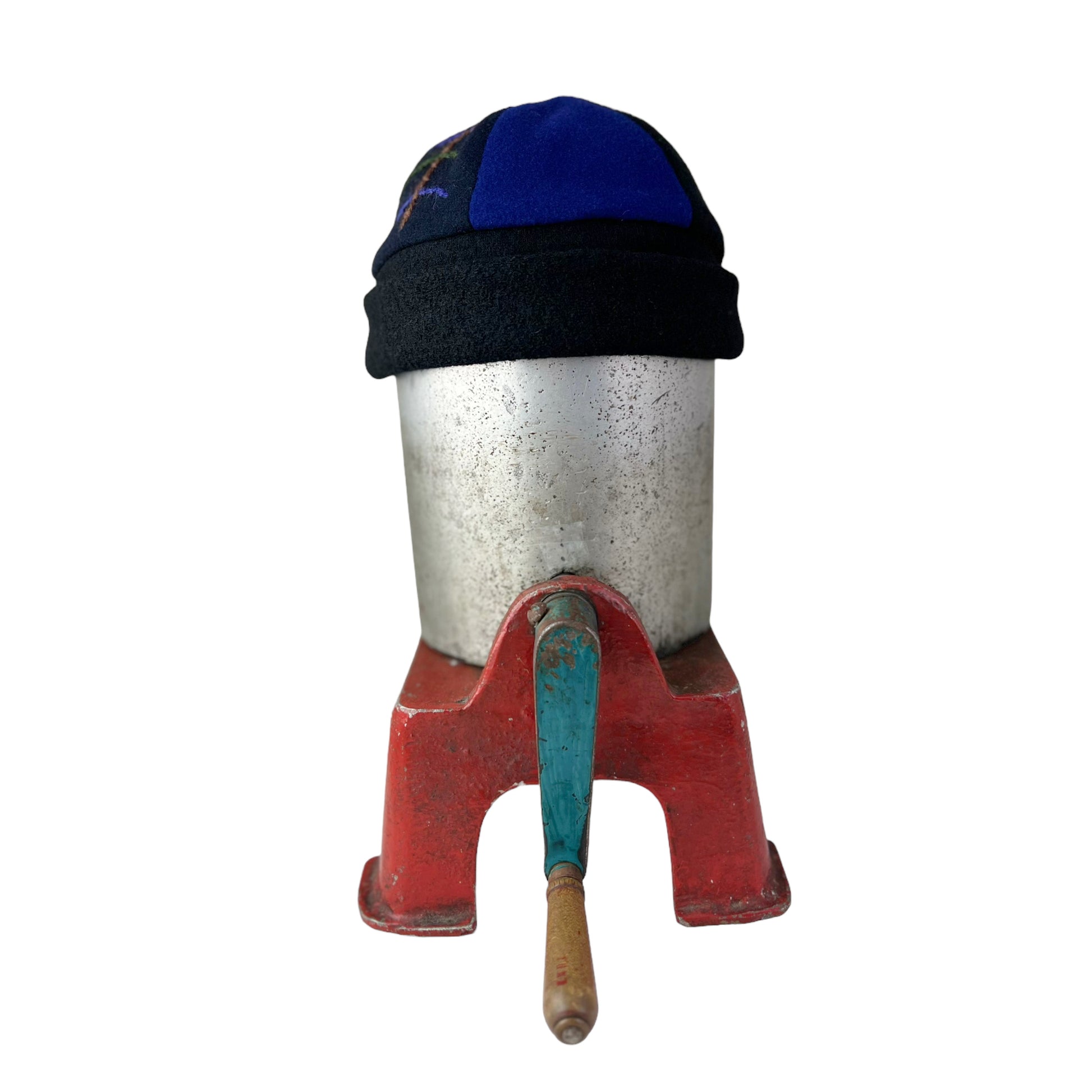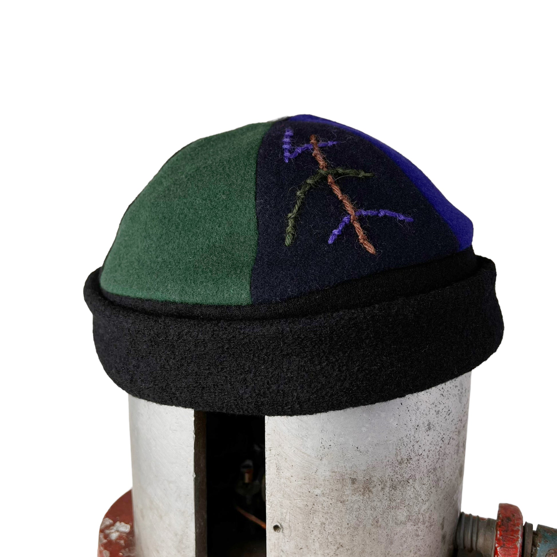 This unisex sporty winter brown, royal blue and black Beanie Slouchy cap hat has been hand cut from a different blue color cashmere blend wool. The rim is made from a boiled wool knit that has an encased thin elastic. The lining is a preshrunk 100% black cotton flannel which makes the hat both a cozy feel and eliminates hat hair, due to the natural choice of materials. I have hand embroidered one of the panels with wool yarn a simple design. There is a small flat 2 hole button on the very top of the beanie.