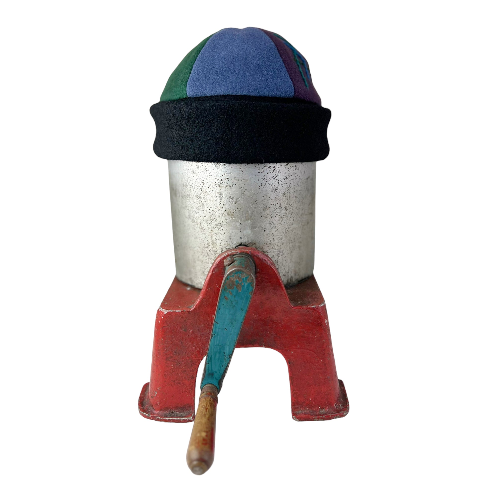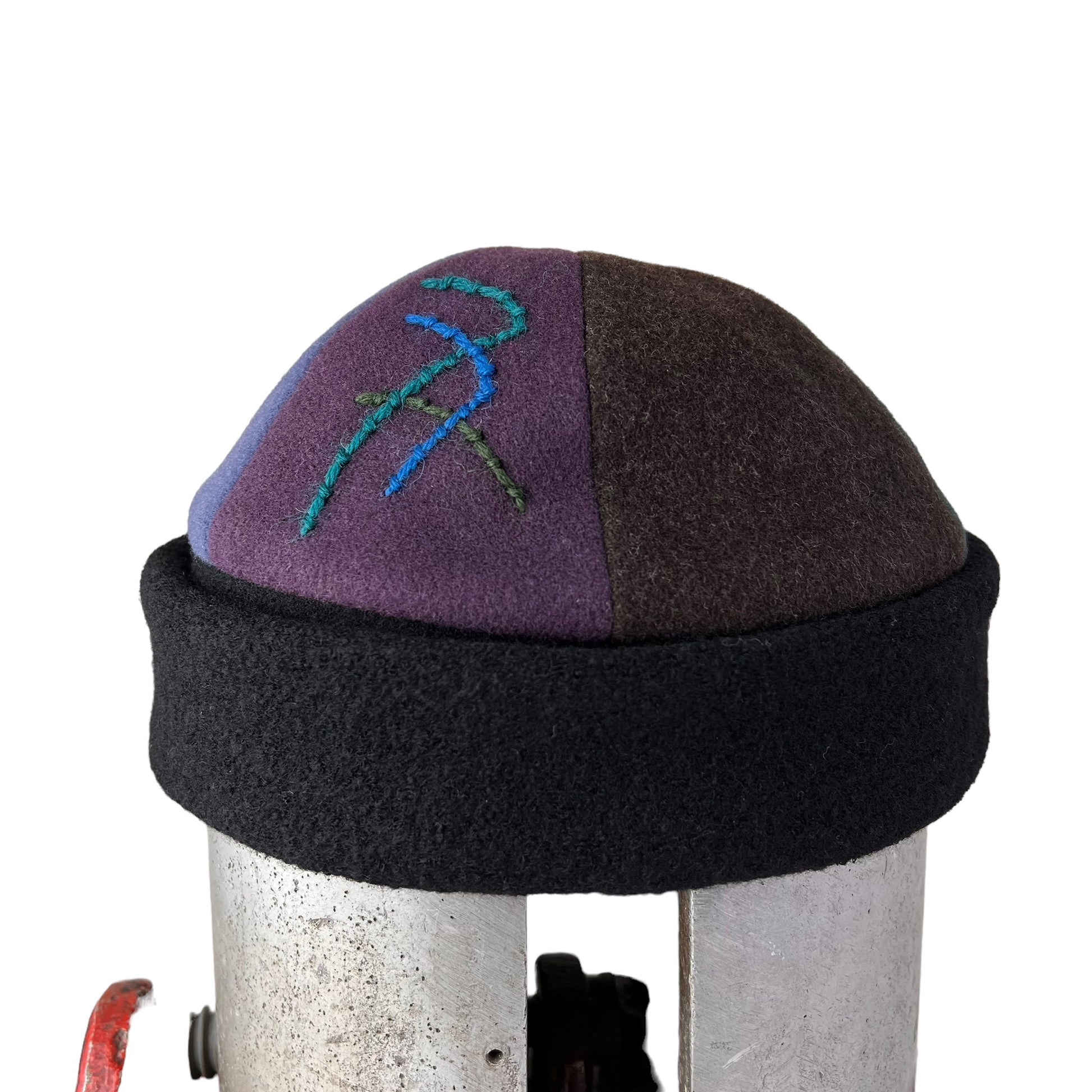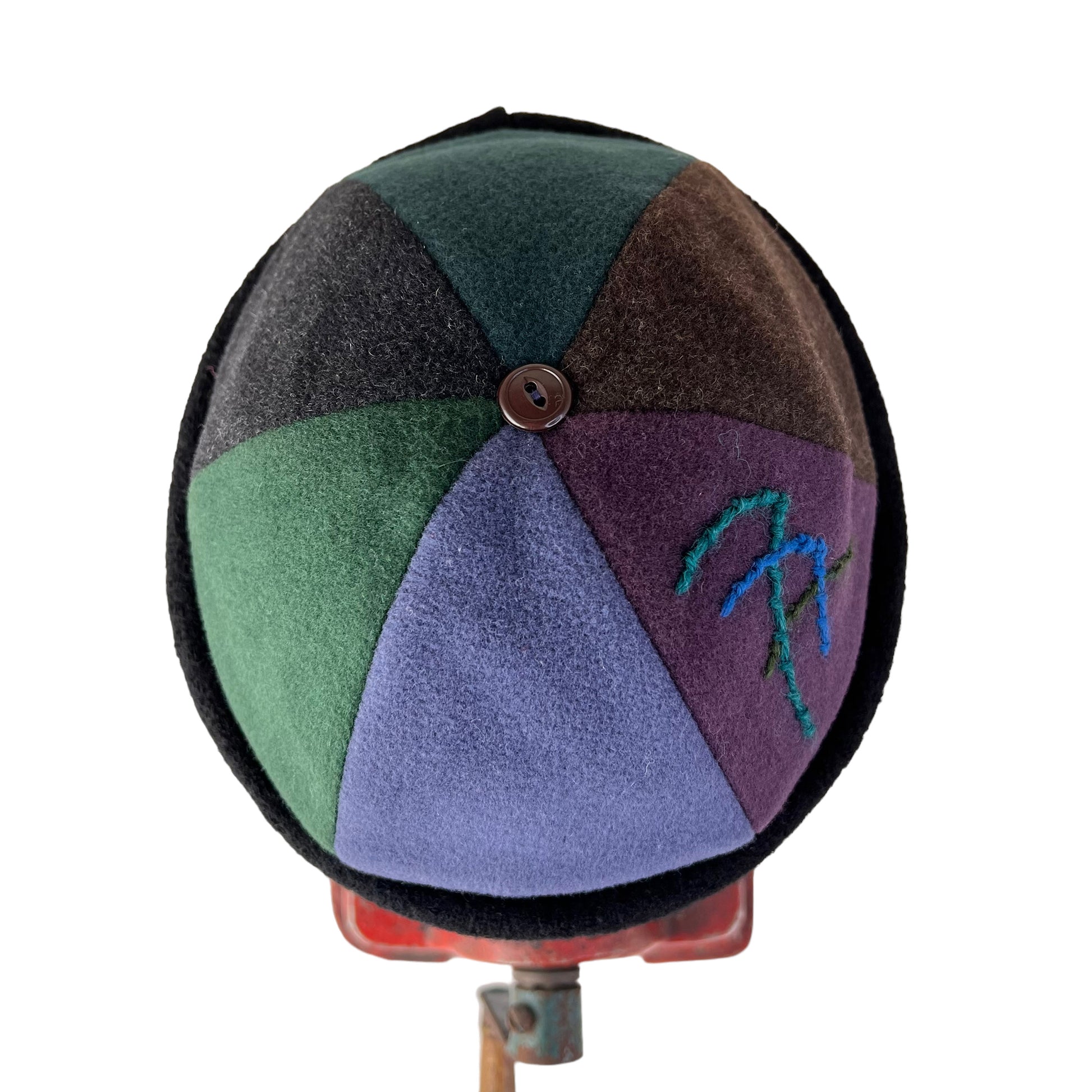 This unisex sporty winter blue, brown, green and black Beanie Slouchy cap hat has been hand cut from a different blue colour cashmere blend wool. The rim is made from a boiled wool knit that has an encased thin elastic. The lining is a preshrunk 100% black cotton flannel which makes the hat both a cozy feel and eliminates hat hair, due to the natural choice of materials. I have hand embroidered one of the panels with wool yarn a simple design. There is a small flat 2 hole button on the very top of the beanie.
