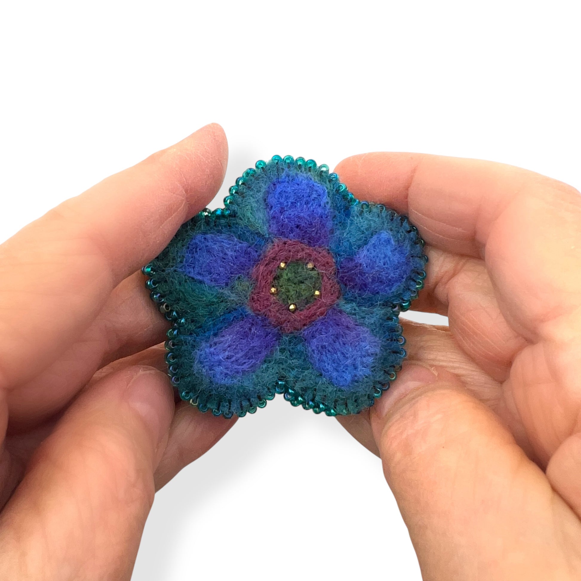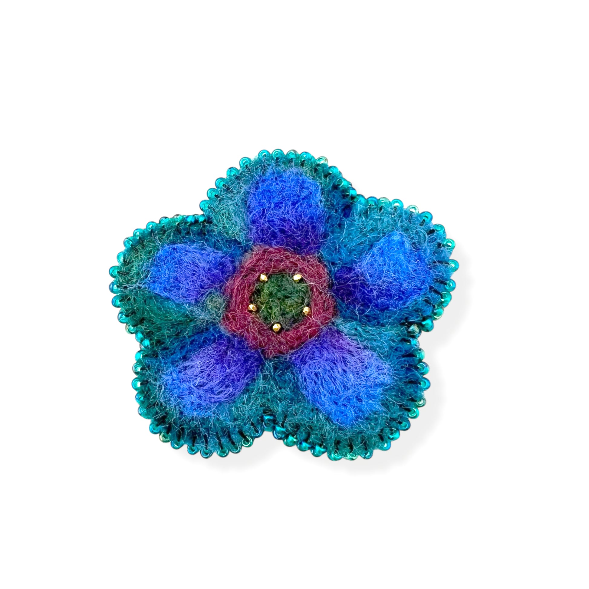 This blue and mauve Fairy Flower Brooch was needle felted with an assortment of wool fleece colours. Embellished with 5 brass beads  in the centre.