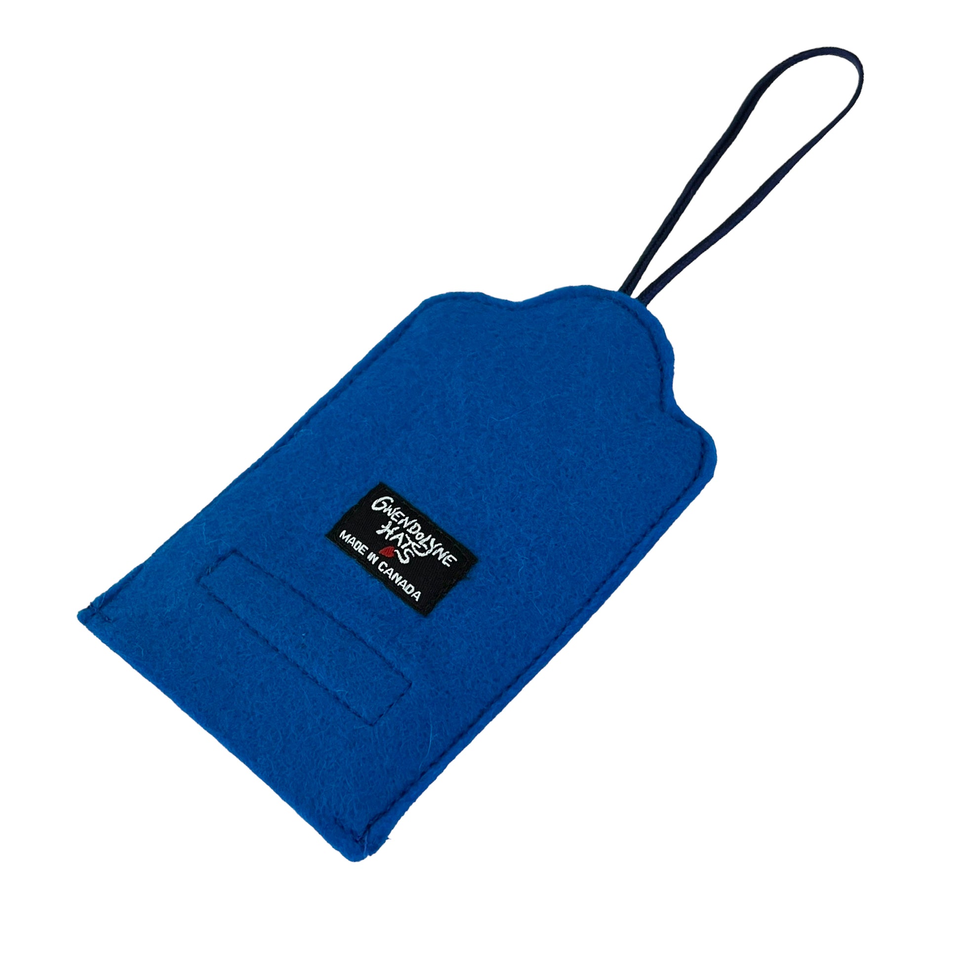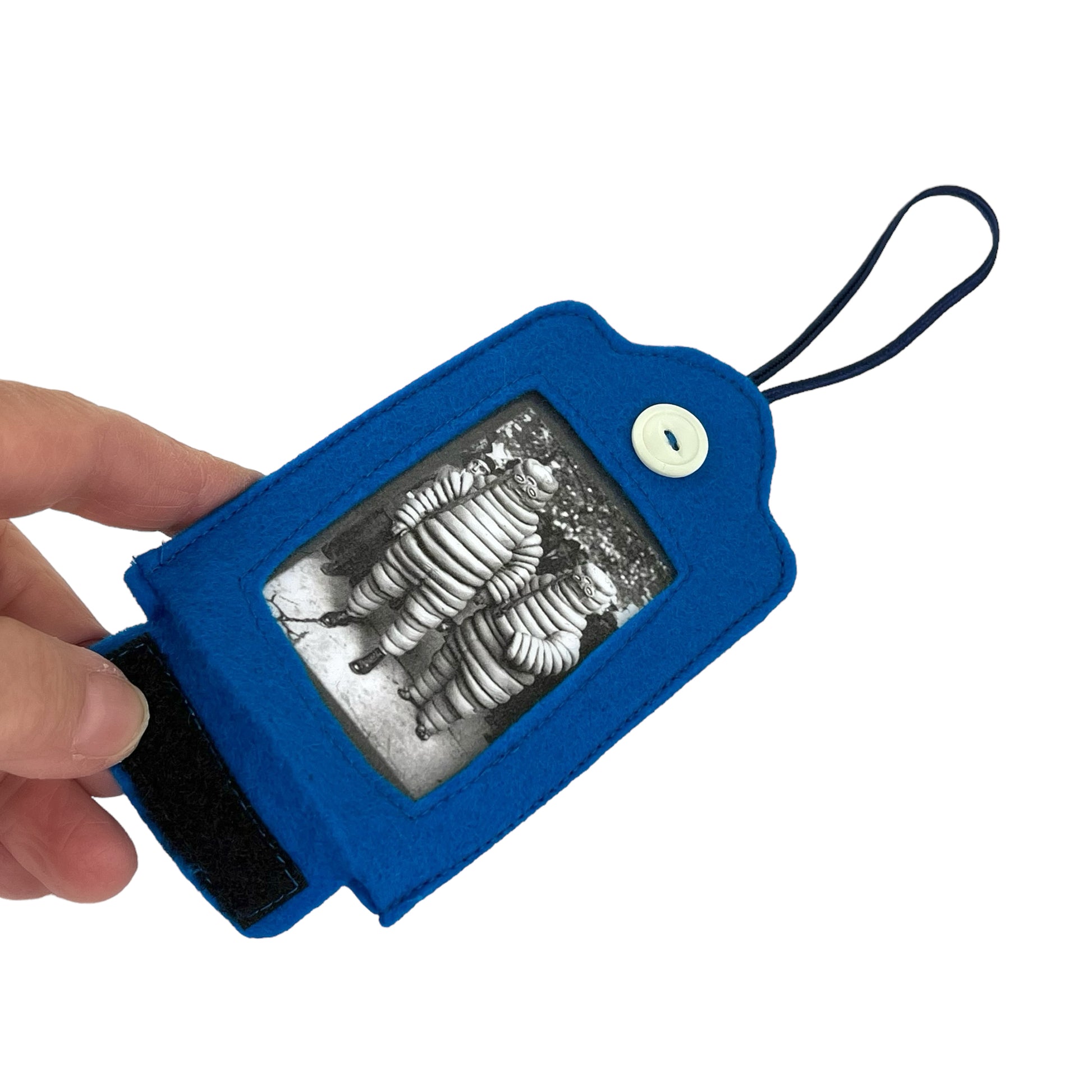 This blue coloured frame is made from a sturdy 100% wool felt that is sewn and decorated with a white mother of pearl 2 hole button from the early 1900s. The laminated card is the template (2  7/16" wide by 3  10/16") for you to use for trimming the photo is so wish to insert inside. The bottom openings have a Velcro closure to open and close.