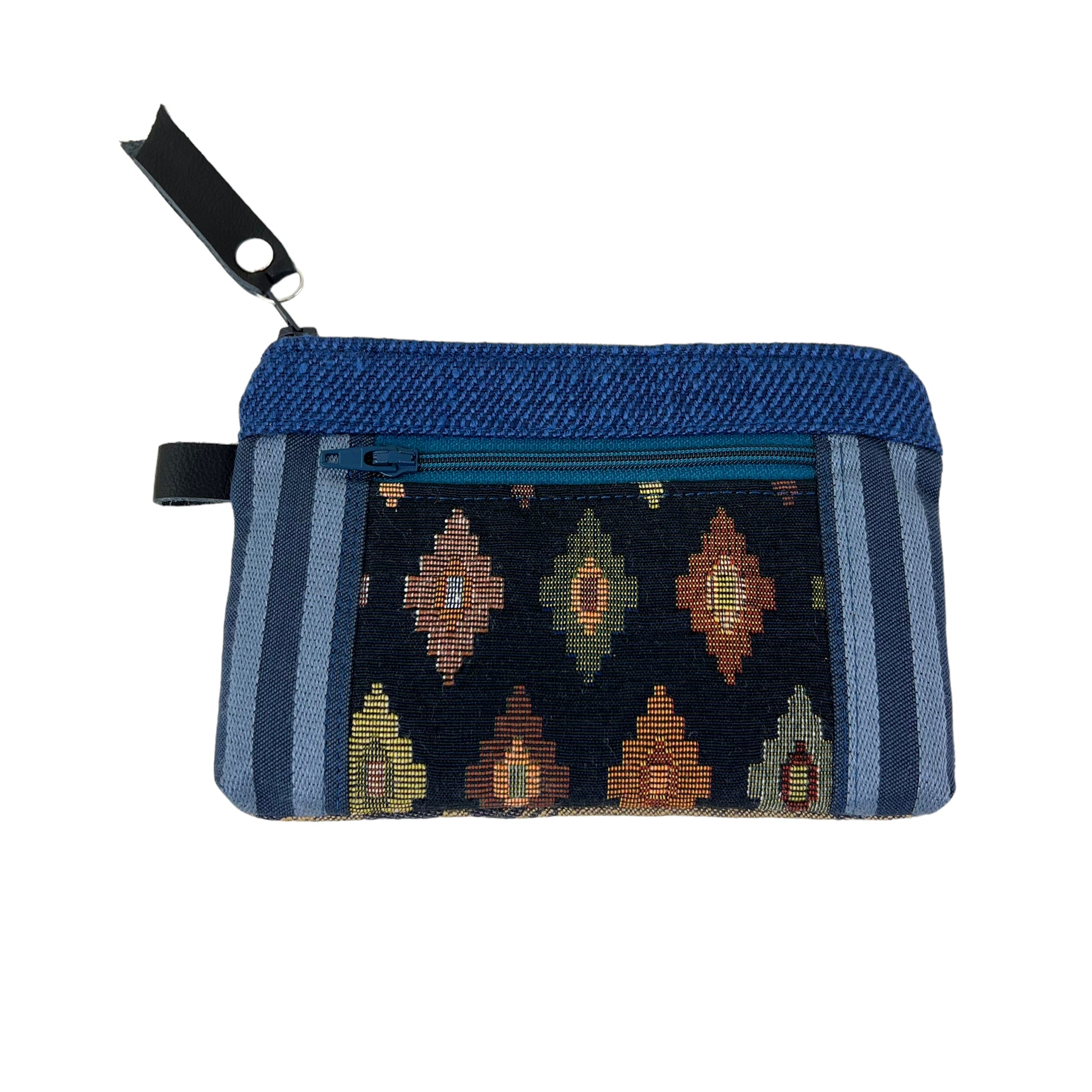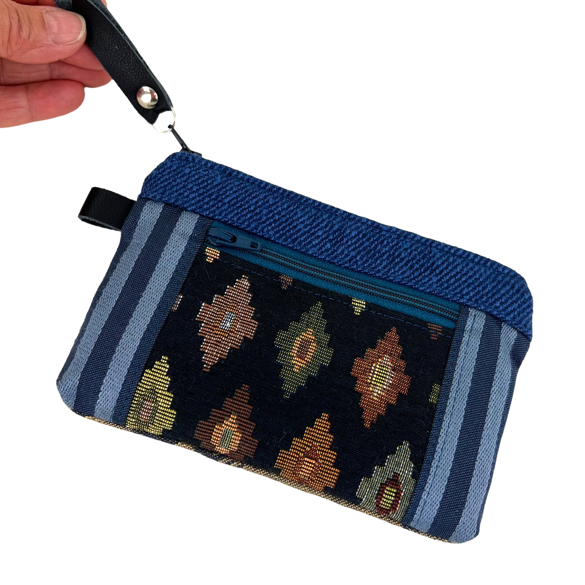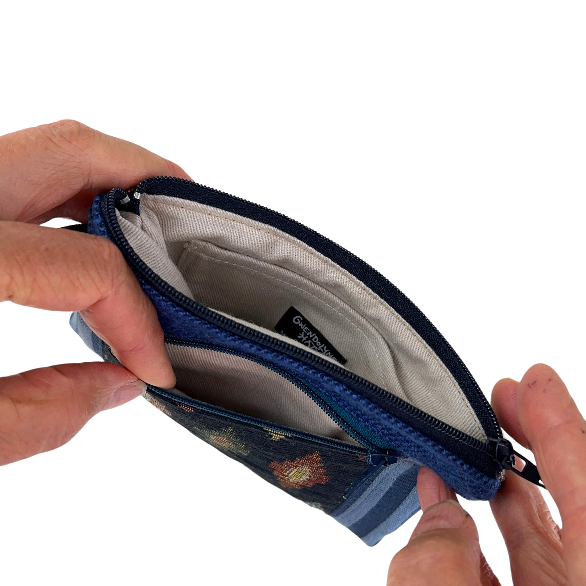 This one of a kind small rich colour blue zipper wallet purse has been cut from a selection of exquisite tapestries creating its one of a kind patchwork wallet purse.