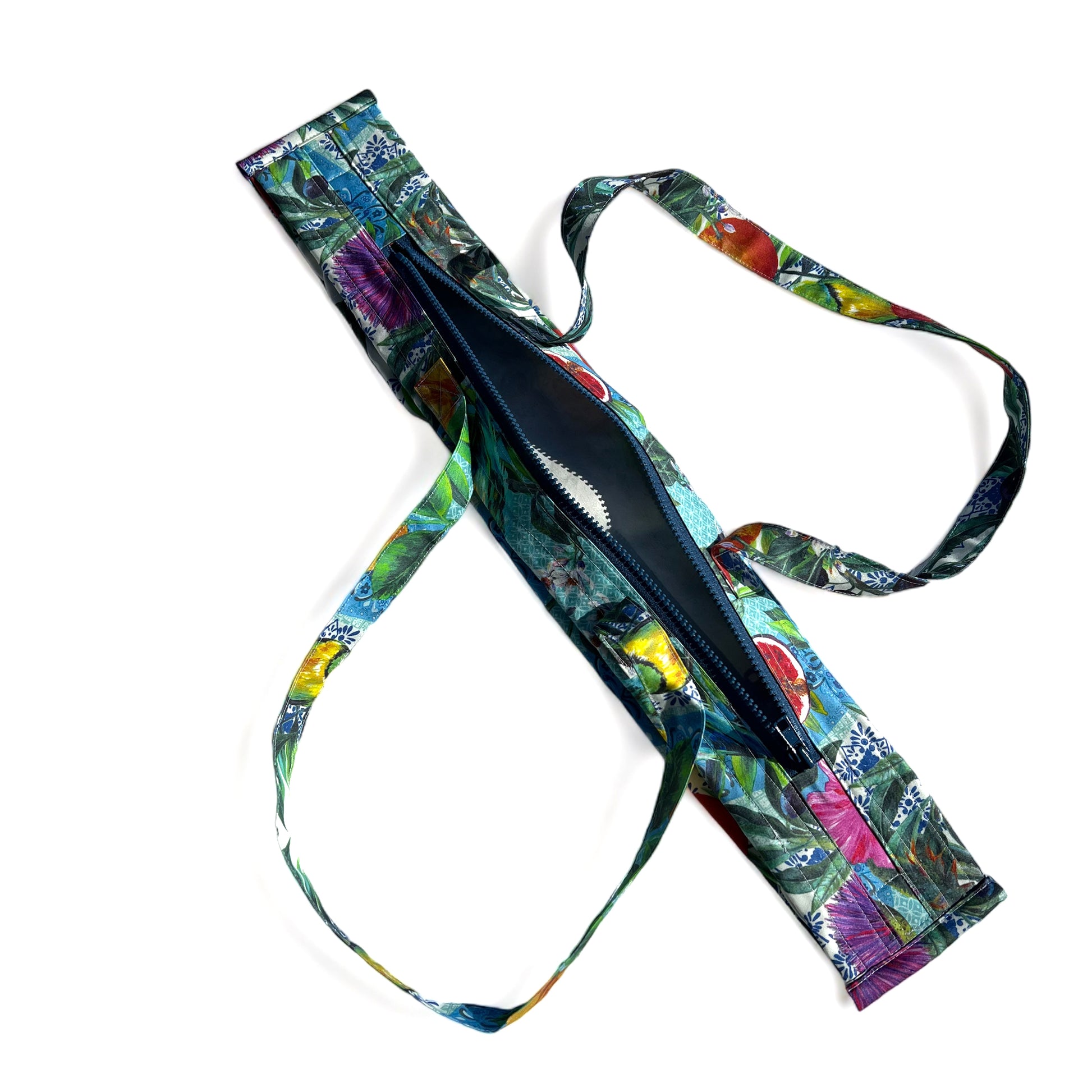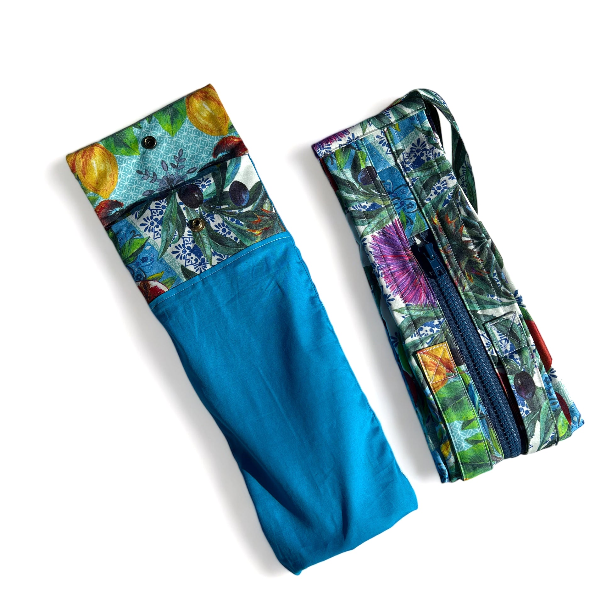 This 26" double strap shoulder foldable tote bag has a 12" long sleeve with a snap closure for easy storage when not being used. The bag is hand cut from a high quality blue fruit / bird print design on a very strong tight premium cotton weave. It flattens easily, then folds in half secured with a velcro tab to keep it in place. It has a durable large 15" smoky blue coloured zipper sewn at the top. When filled, it measures approximately 14" by 14". This video of one of the bags shows how it opens up.