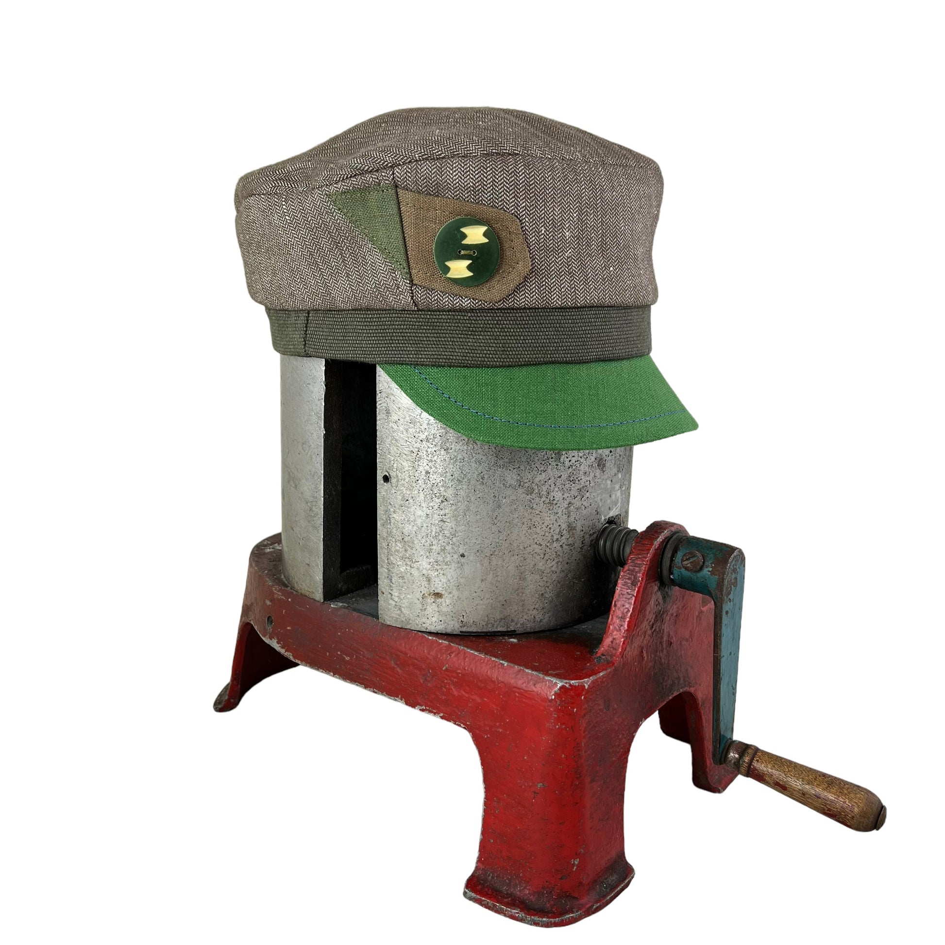 The outside of this medium large cap has been hand cut from a shot brown herringbone linen weave. The olive band is made from a strong basket weave cotton. The kelly green linen peak is made from a sturdy flexible leather board which I top stitch on my leather machine. The cap is embellished with a green carved 1920s button strap detail.