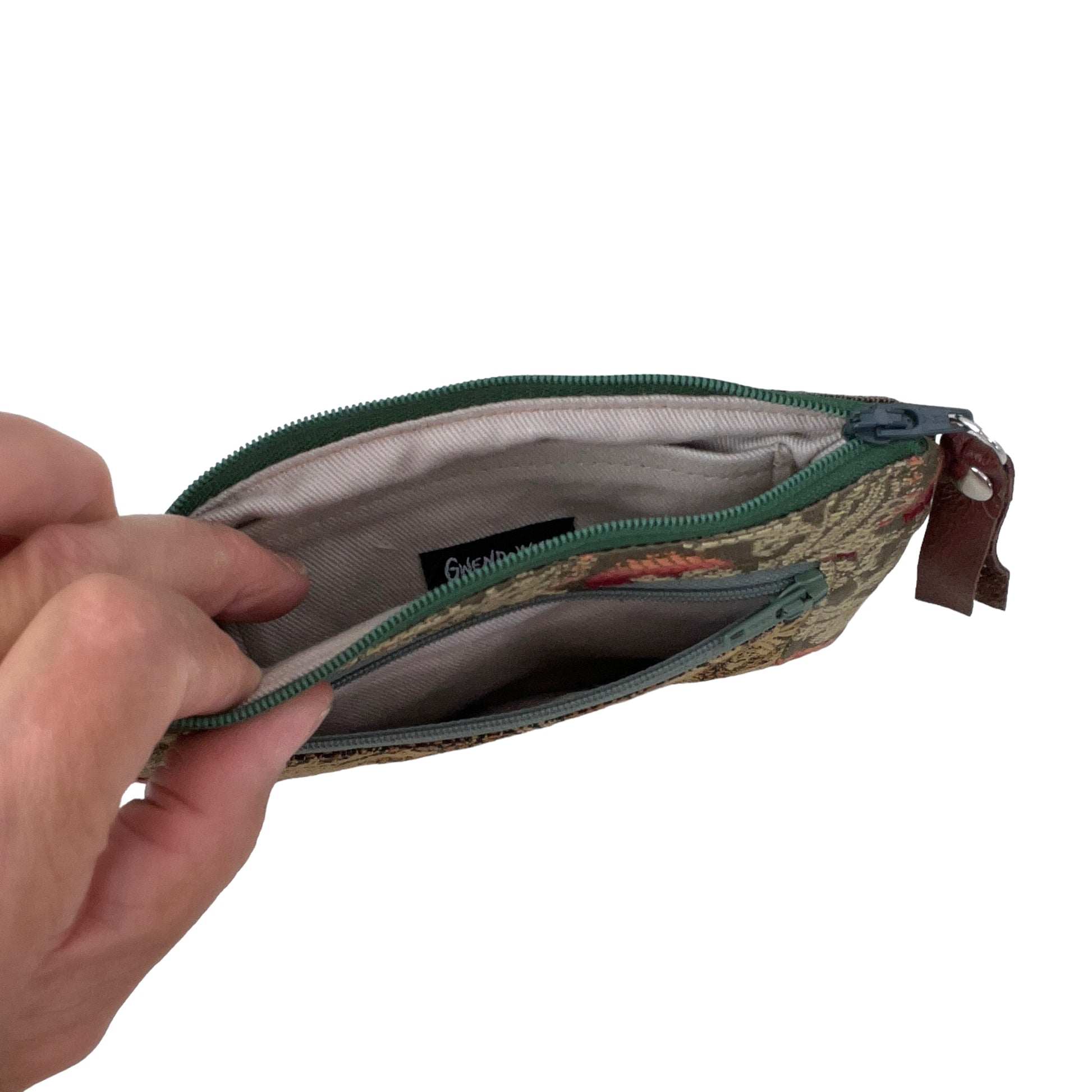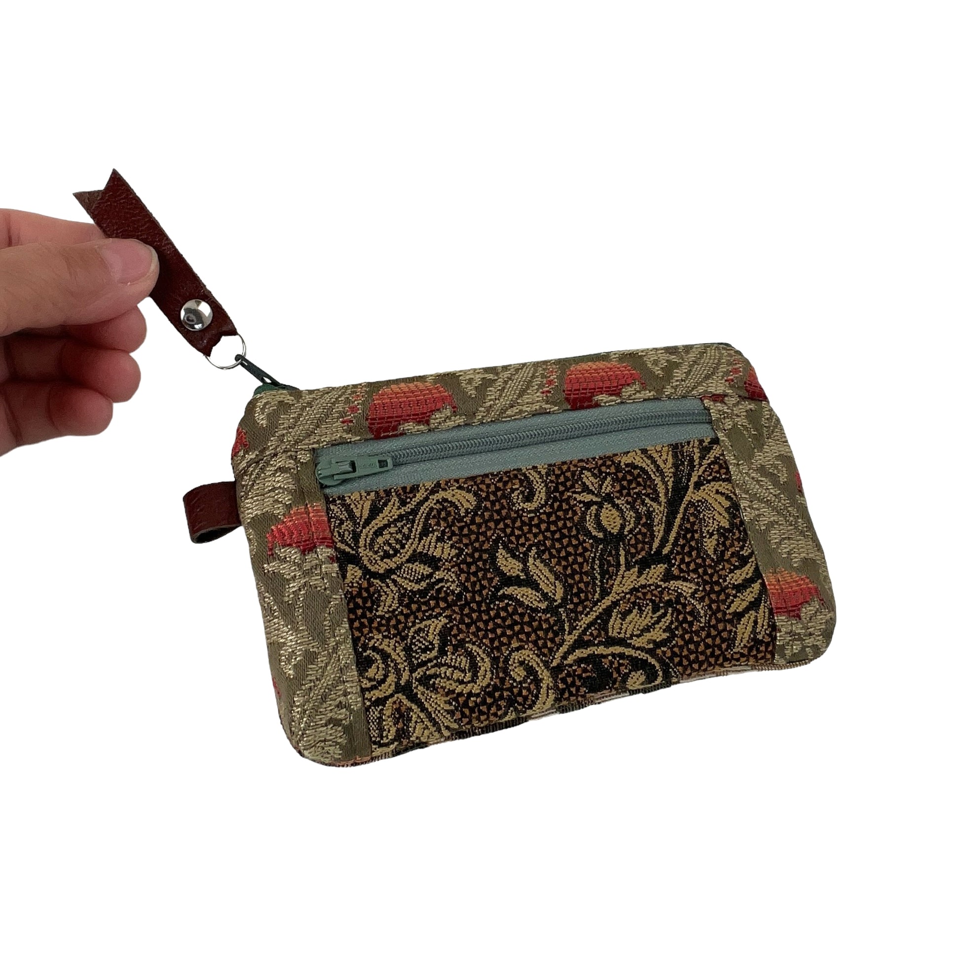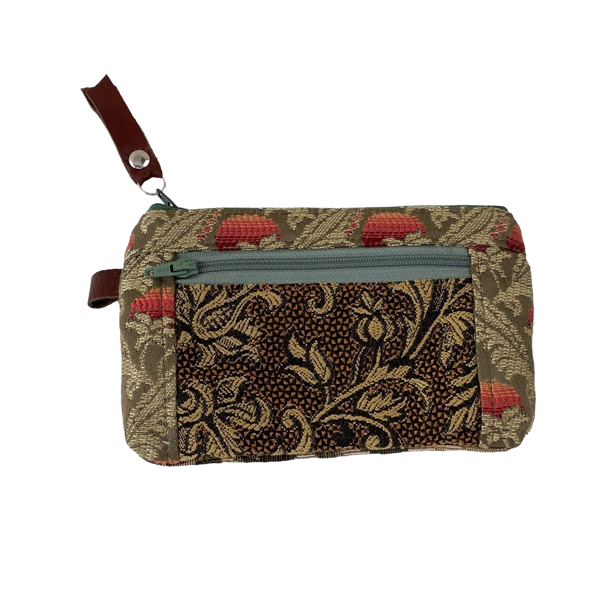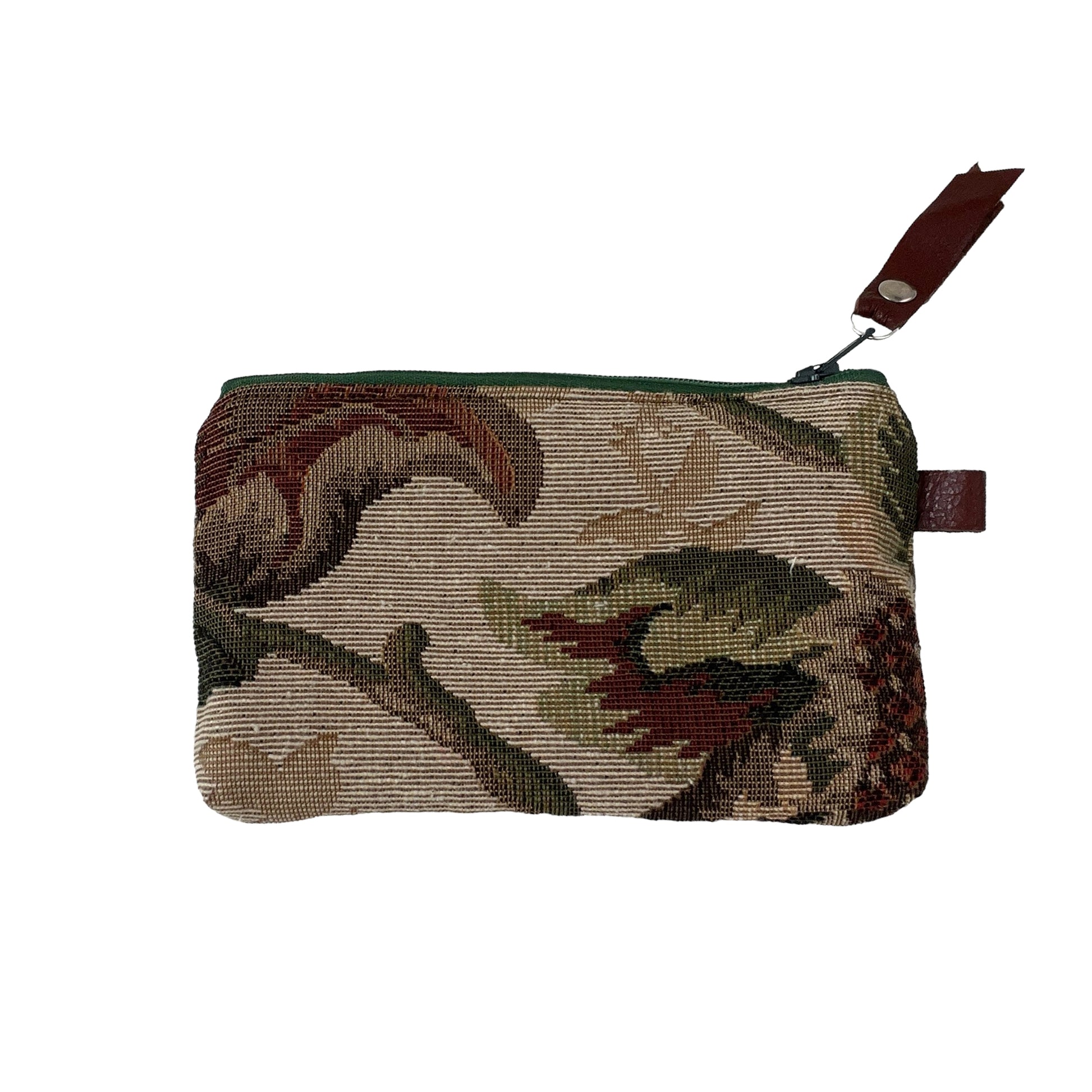 This one of a kind small green brown and black zipper wallet purse has been cut from a selection of exquisite tapestries creating its one of a kind patchwork wallet purse.