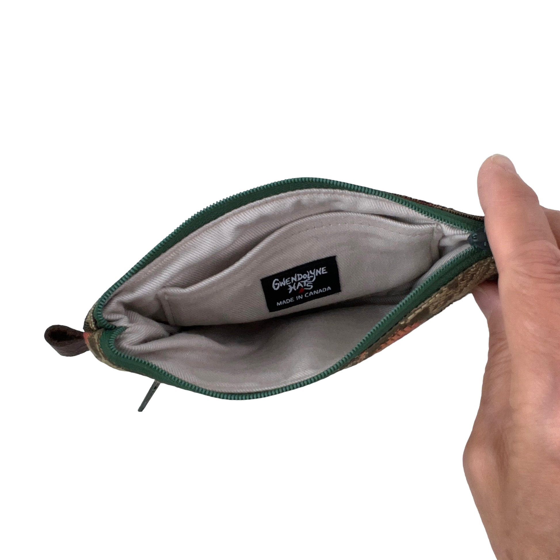 It measures 6 1/4” wide and 3 1/4” deep. The small front panel zipper pocket measures 4” across and is 2 5/8” deep. There is a small inside card pocket that can hold 4 credit cards.