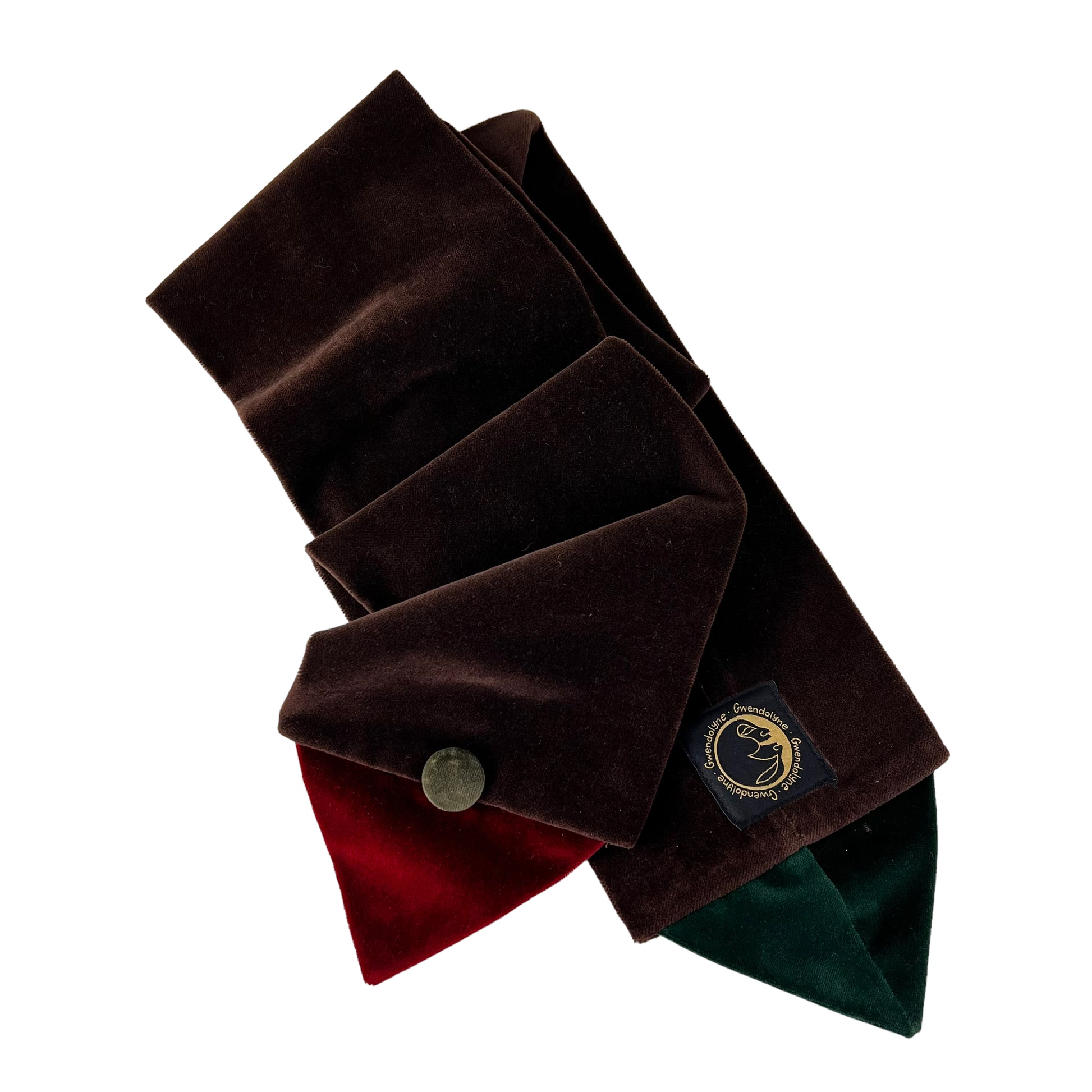 I hand cut and sew this luxurious dark brown soft velvet cotton woven narrow scarf for those of us who are wool sensitive. It is a lovely Spring and Fall season accessory which is both unique, cozy and modern. The triangle ends and covered buttons are distinct design features.