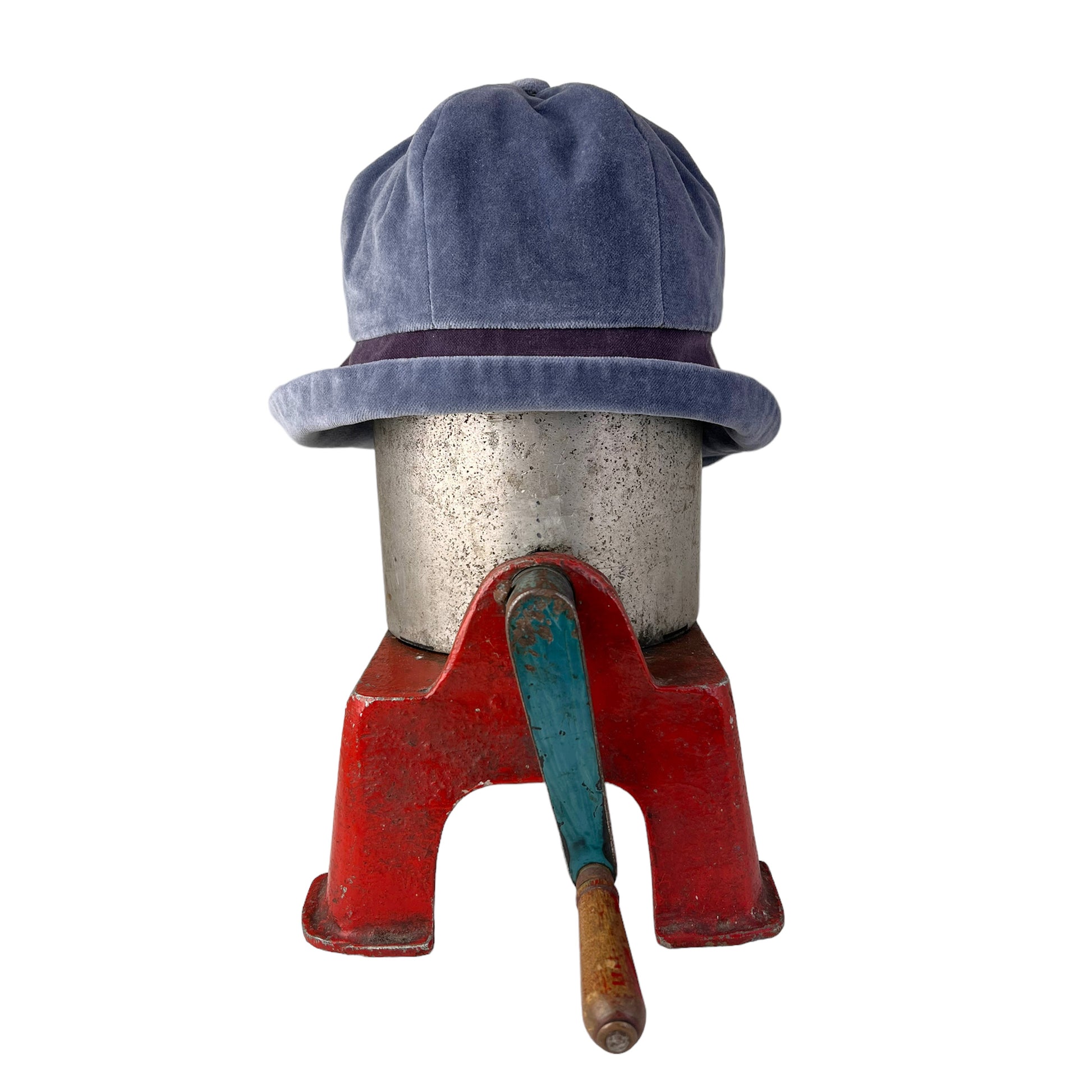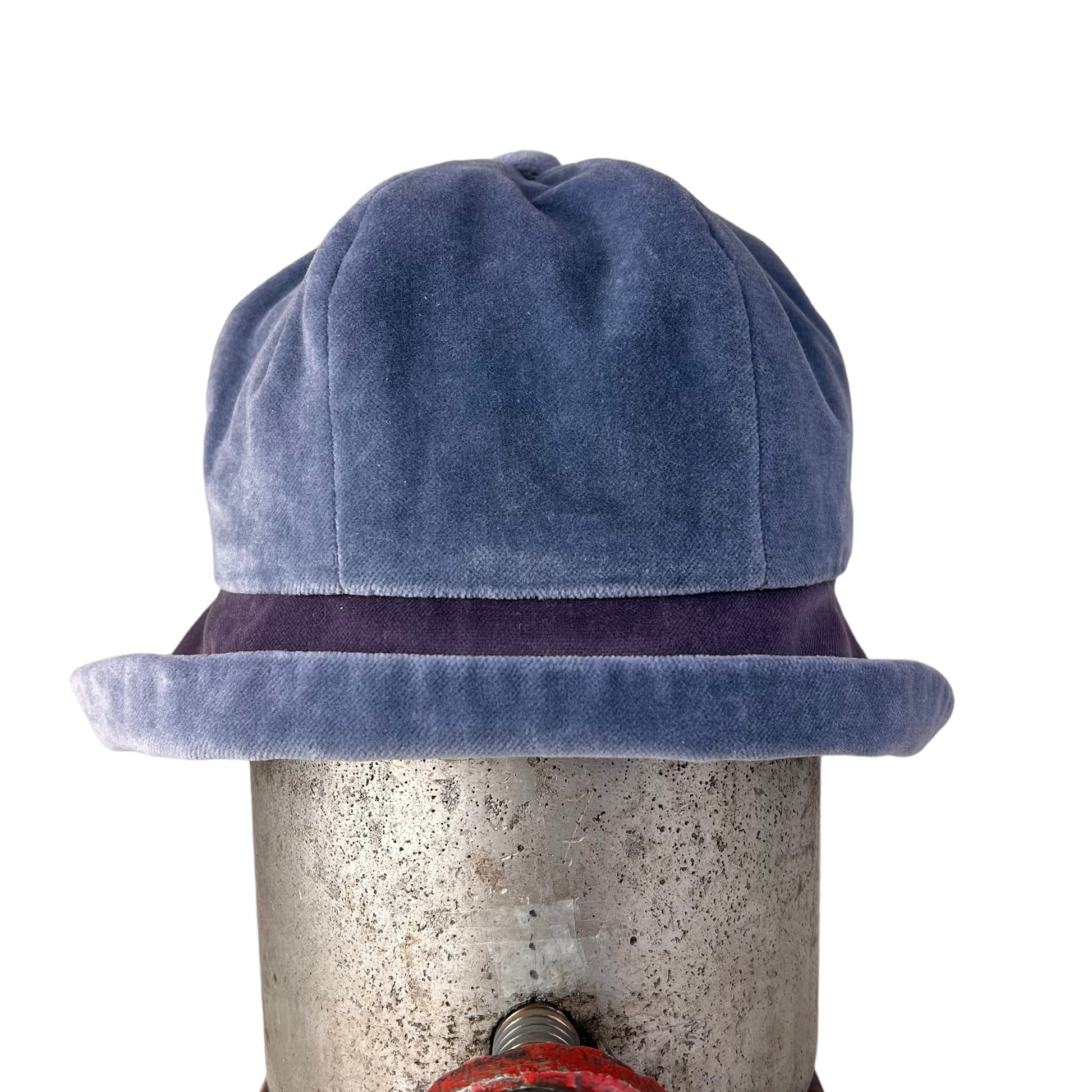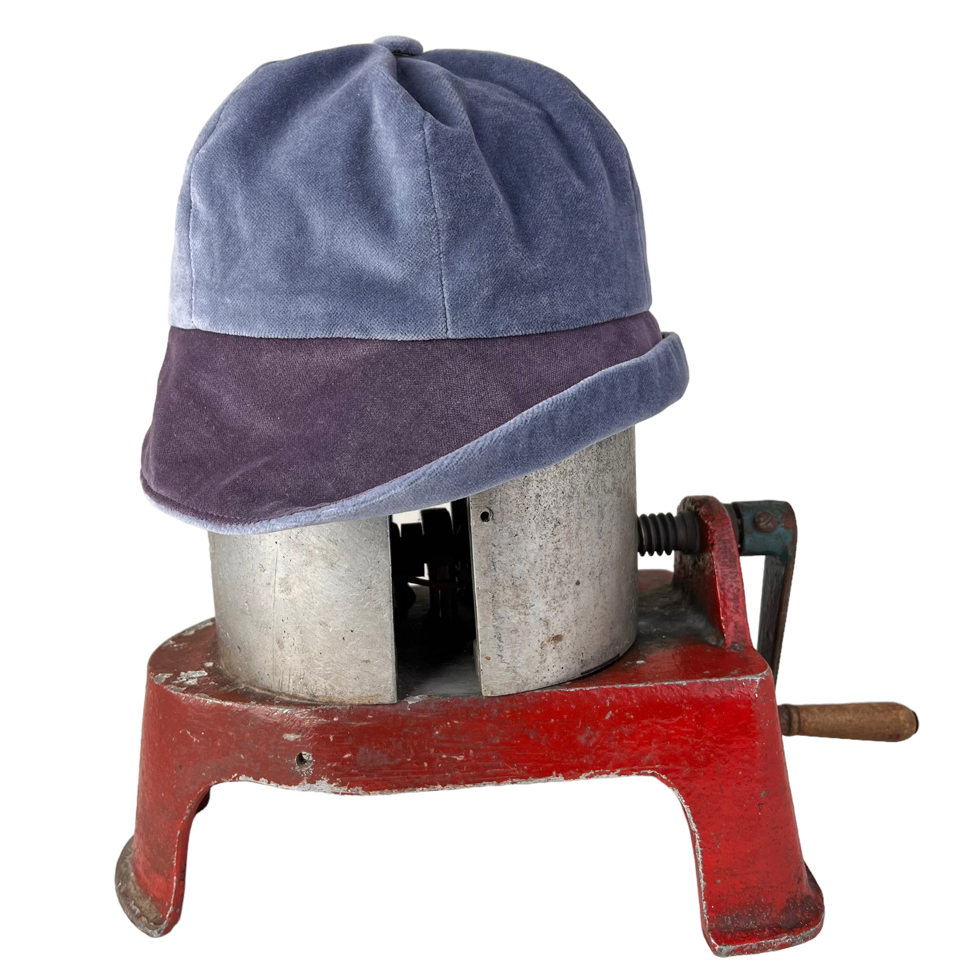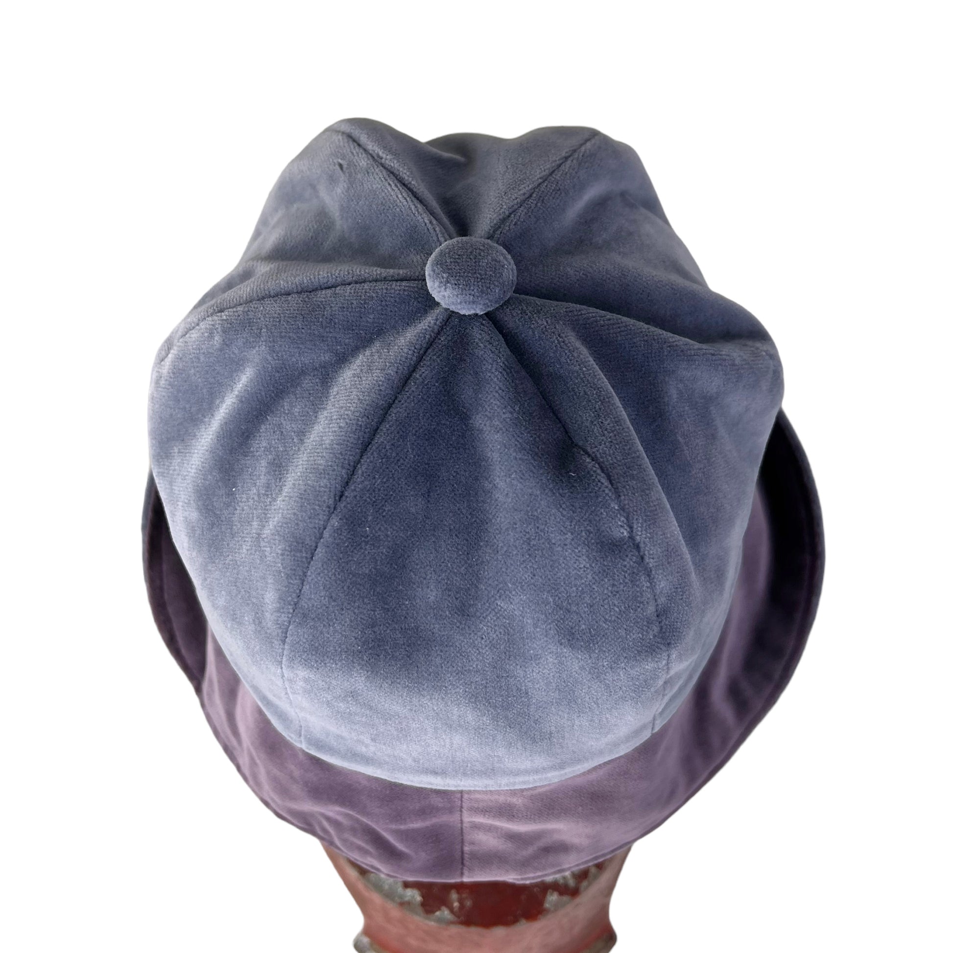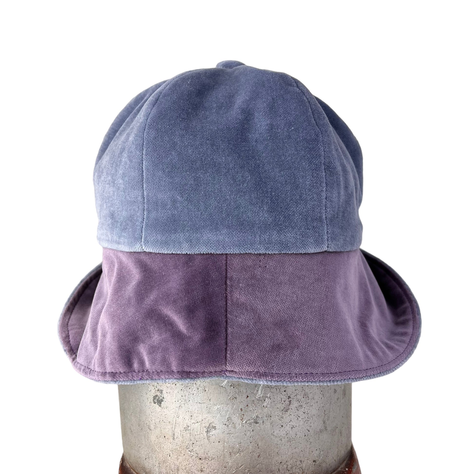 Named "The Chloe" this one of a kind luxurious seasonal cloche design has been hand cut from grey blue and mauve dutch velvet cotton fabric. This 2 color rim is soft to wrap around the face. The lining is cut from a chartreuse green silk fabric which makes the hat very breathable and eliminates hat hair. Accented on the top with a covered velvet button.