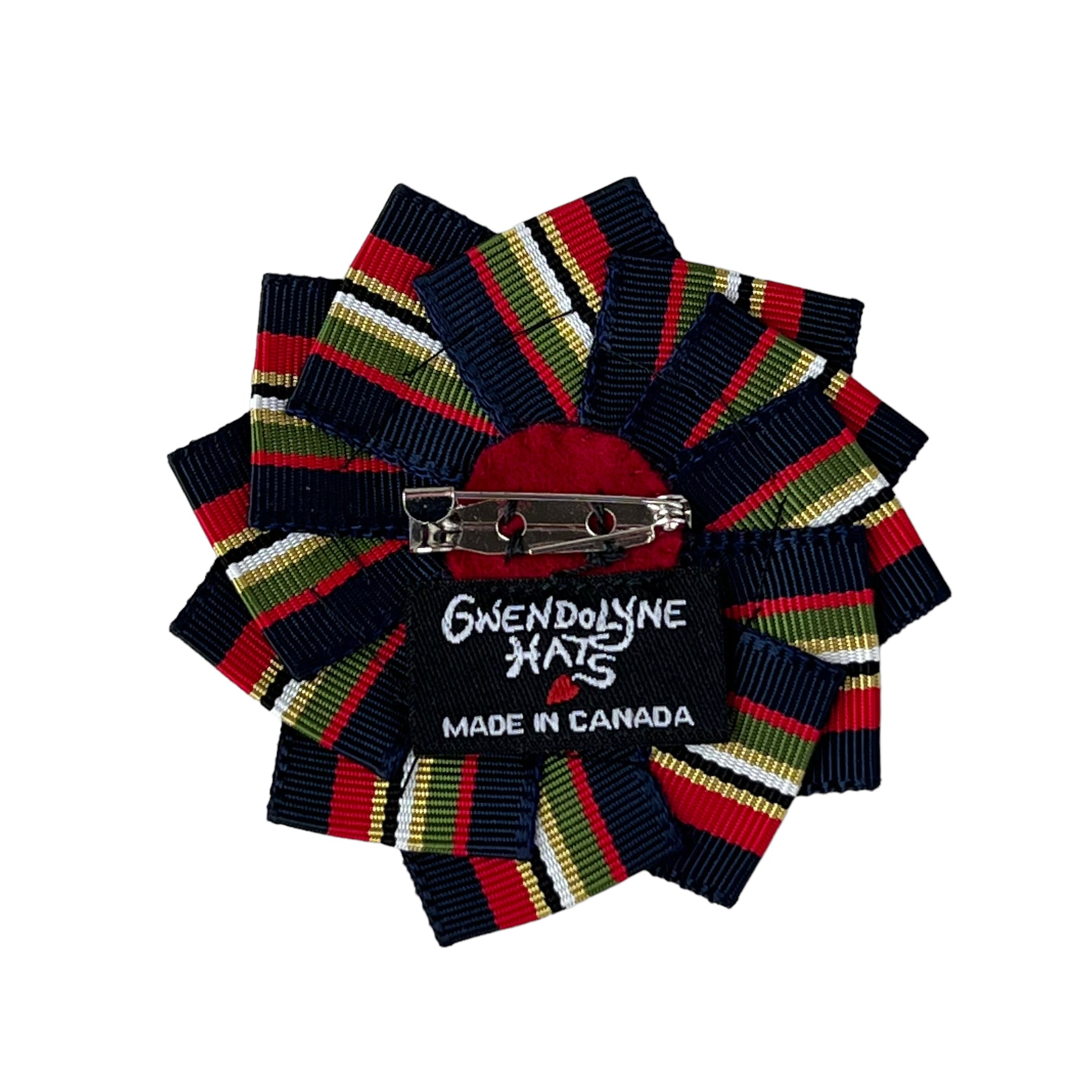 Measuring just over 2 1/2" wide this unique ribbon cockade brooch is hand sewn and is finished with a 1890 Victorian Shell Steel Cut Inset 5/8" wide button. Hand sewn with a metal 1" wide pin back.