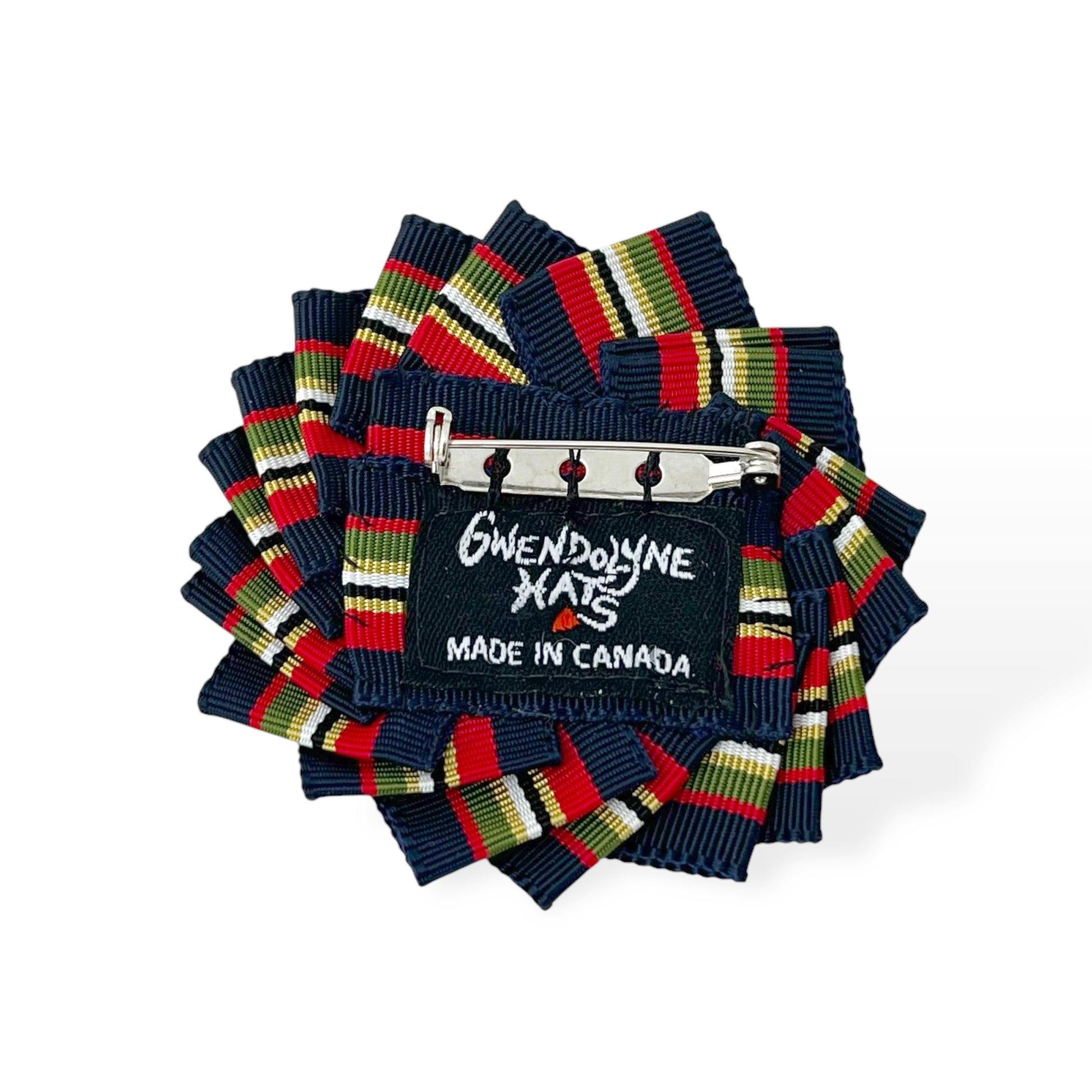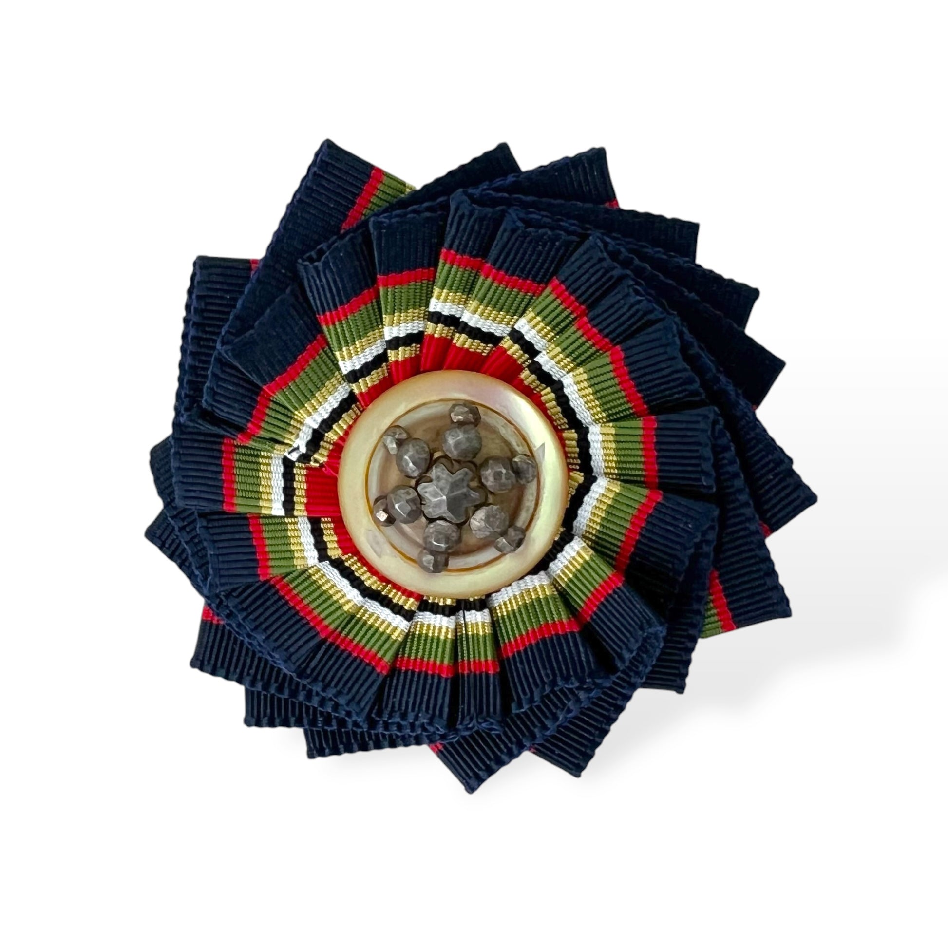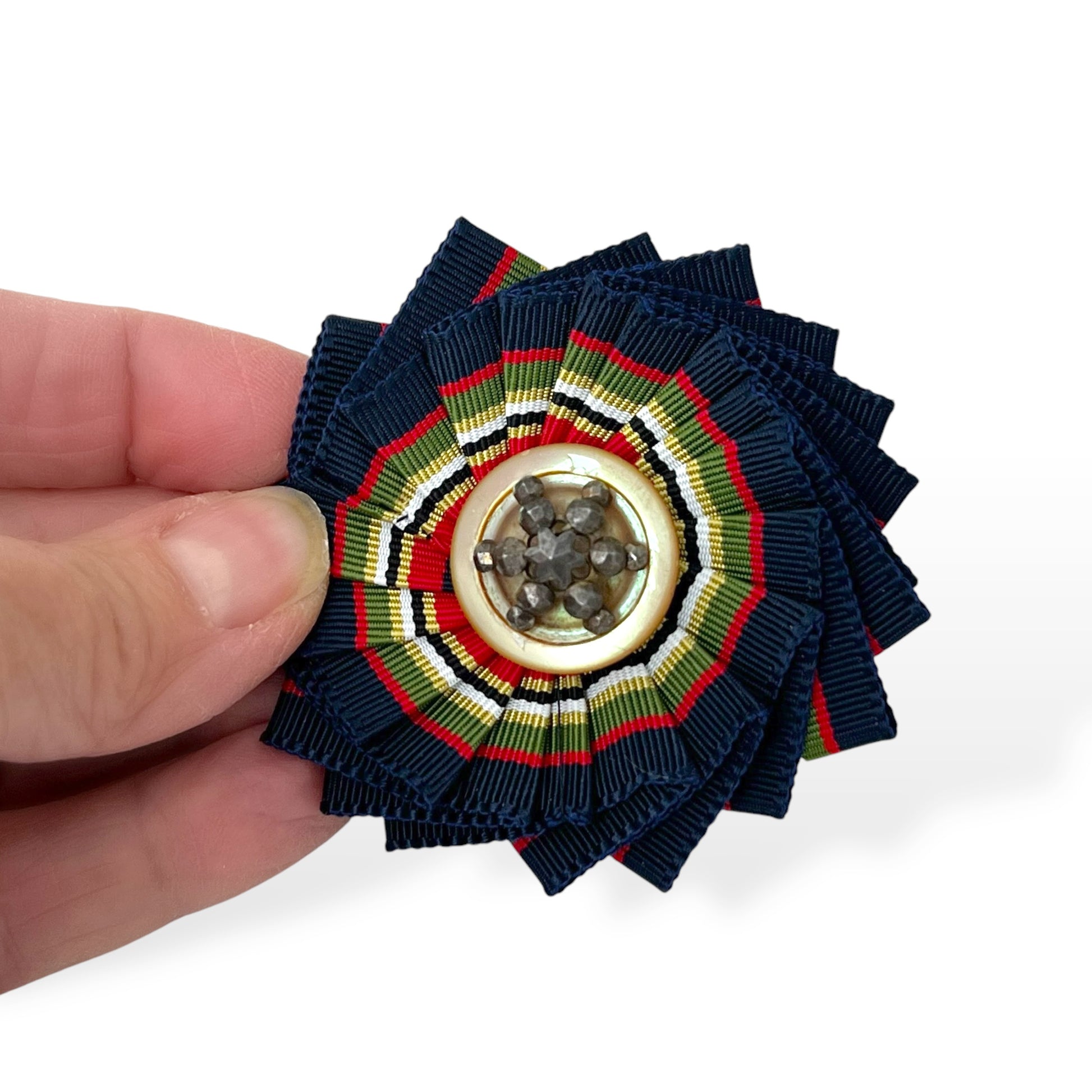 Measuring just over 3" wide this unique ribbon cockade brooch is hand sewn and is finished with a 1890 Victorian Shell Steel Cut Inset 1" wide button. Hand sewn with a metal 1 1/4" wide pin back.