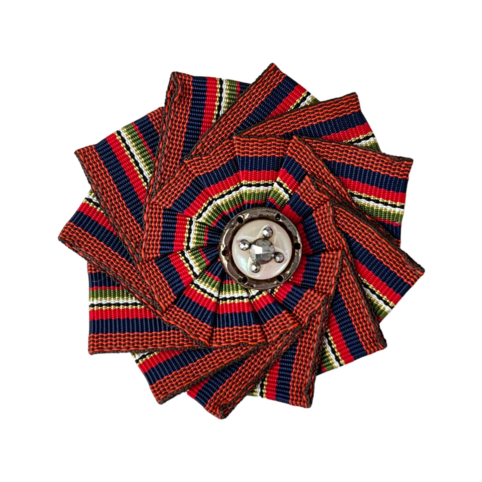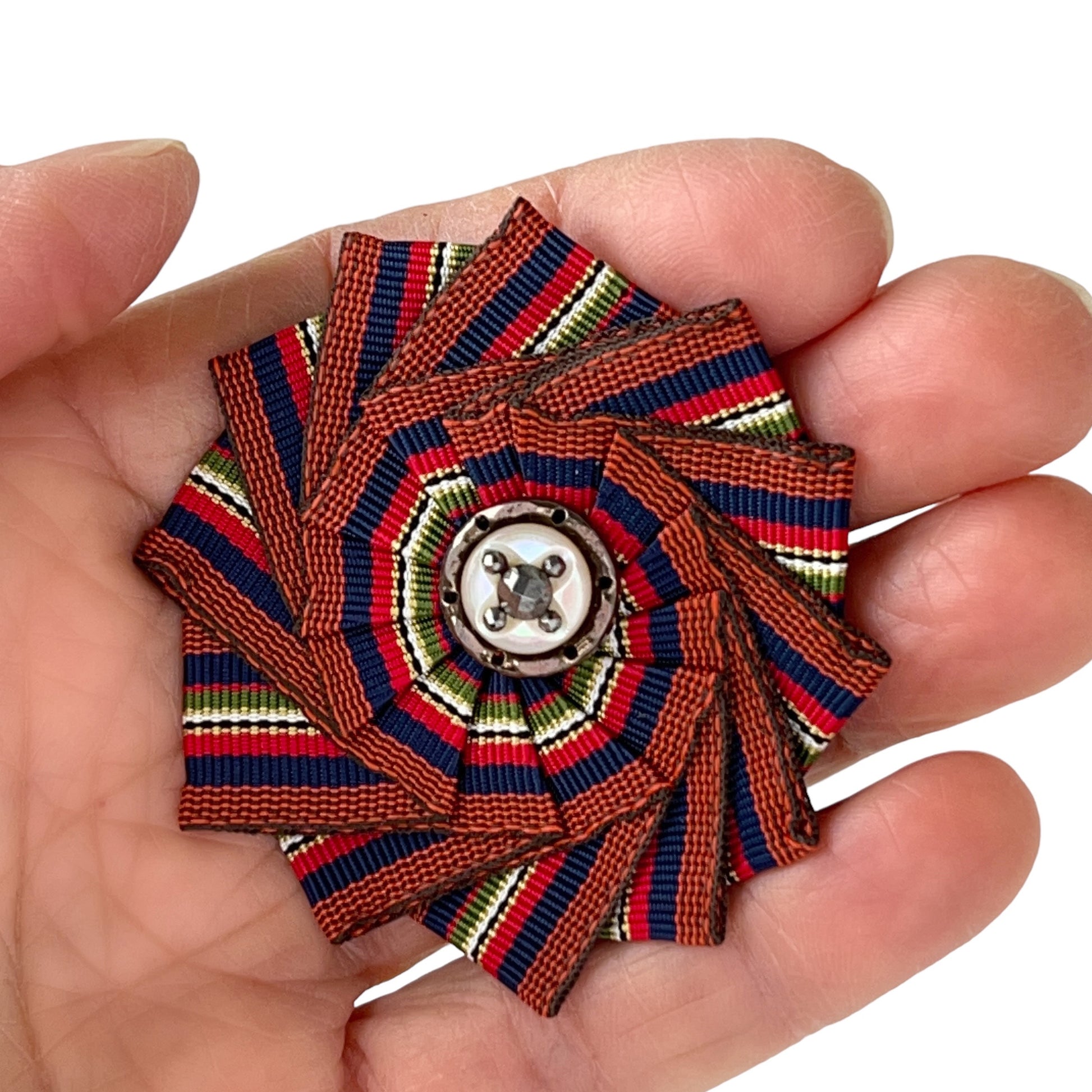 Rust Navy Red 1890 Victorian Shell Steel Cut Button Cockade Ribbon Brooch