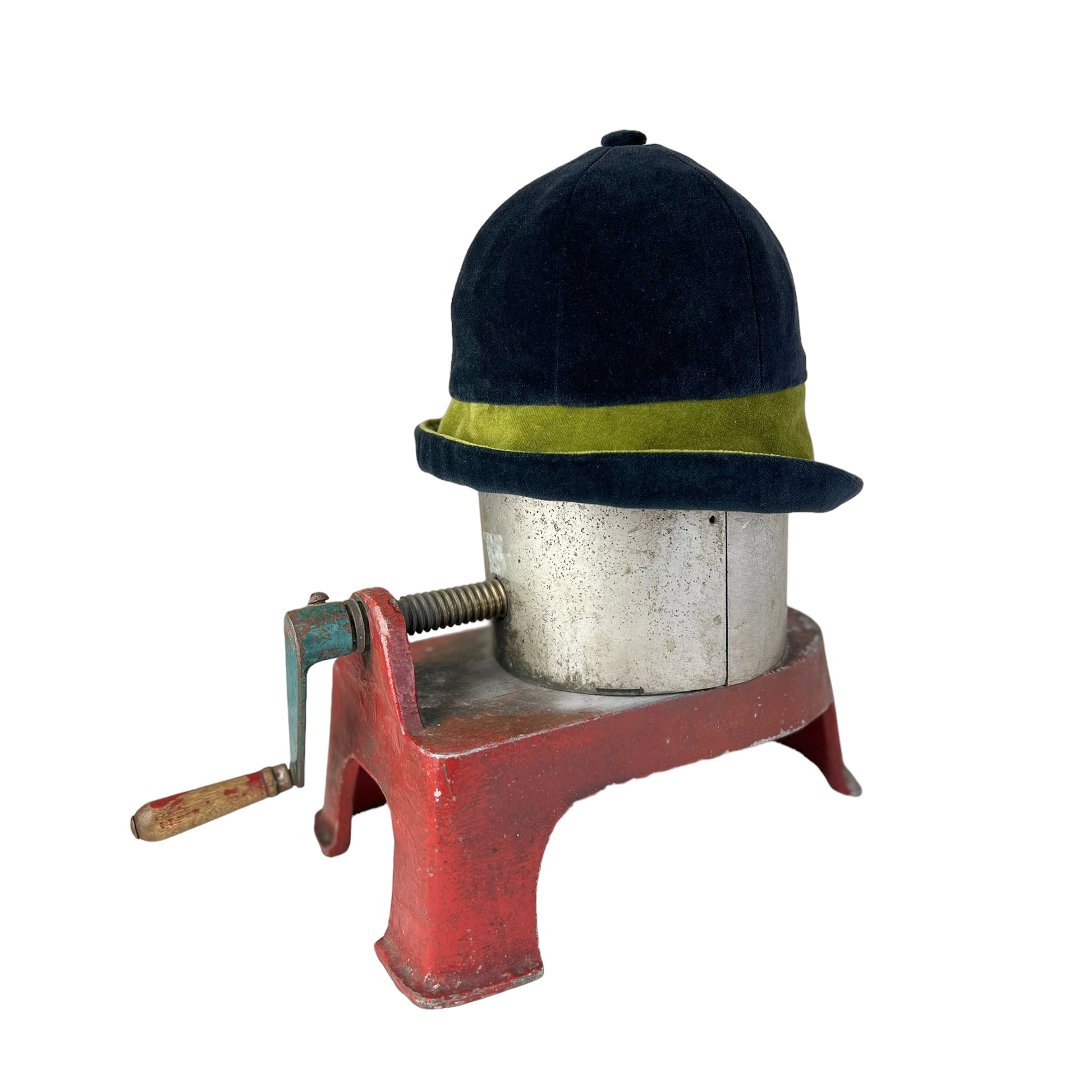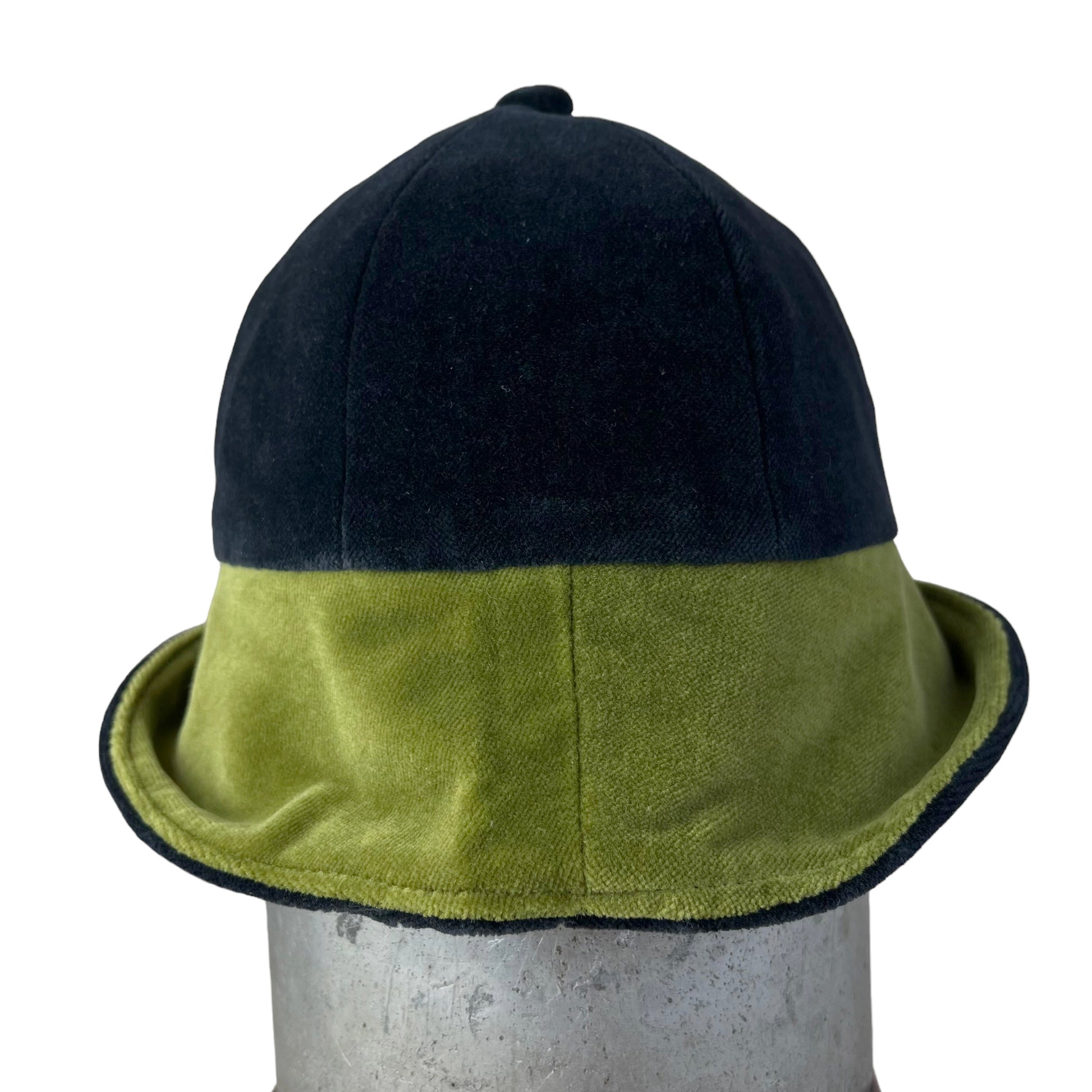 This sample hat has been hand cut from black and lime green dutch velvet cotton fabric. This 2 color rim is soft to wrap around the face. The lining is cut from a orange taffeta silk fabric which makes the hat very breathable and eliminates hat hair. Accented on the top with a covered velvet button.