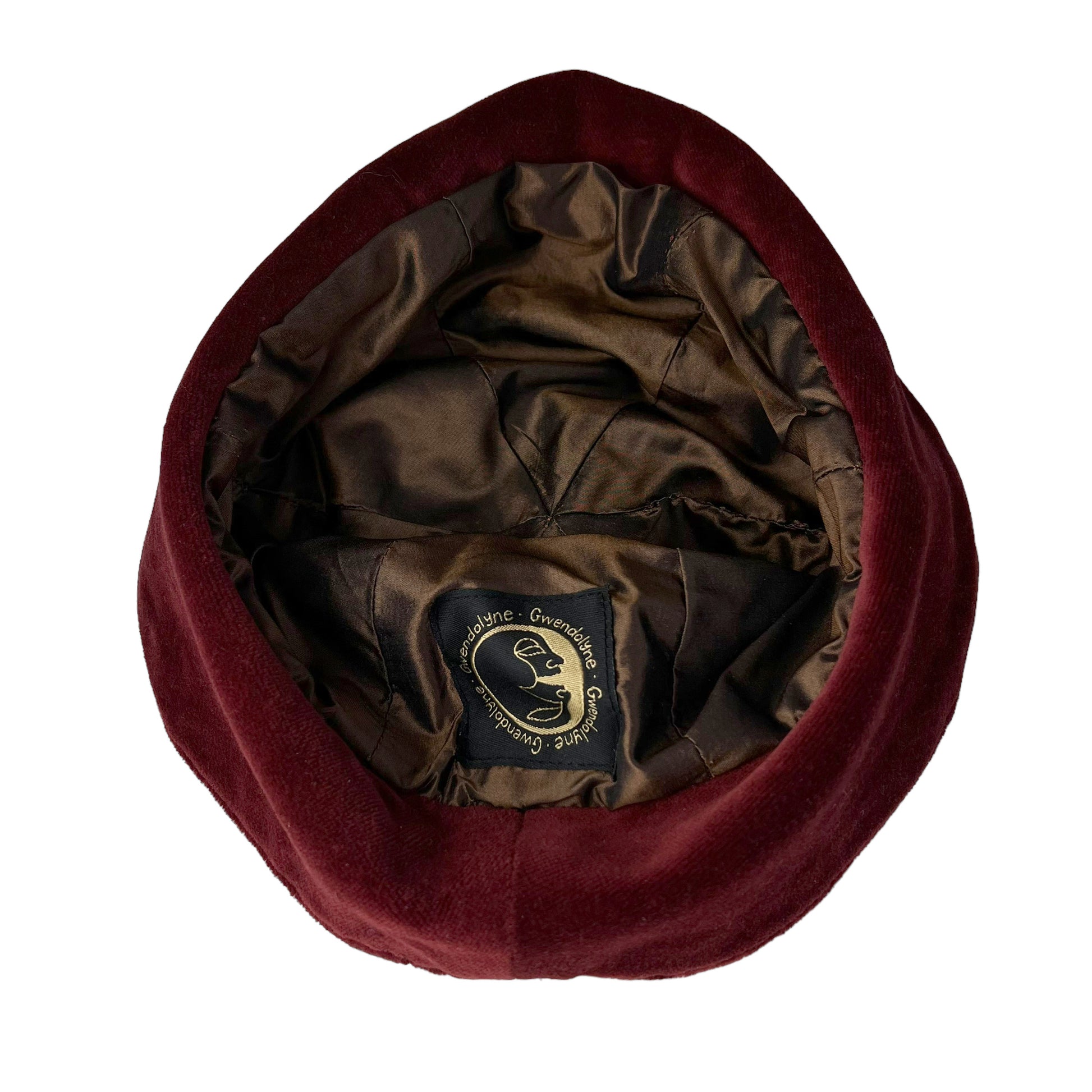 This sample hat has been hand cut from rust and brown dutch velvet cotton fabric. This 2 color rim is soft to wrap around the face. The lining is cut from a taffeta brown silk fabric which makes the hat very breathable and eliminates hat hair. Accented on the top with a covered velvet button.