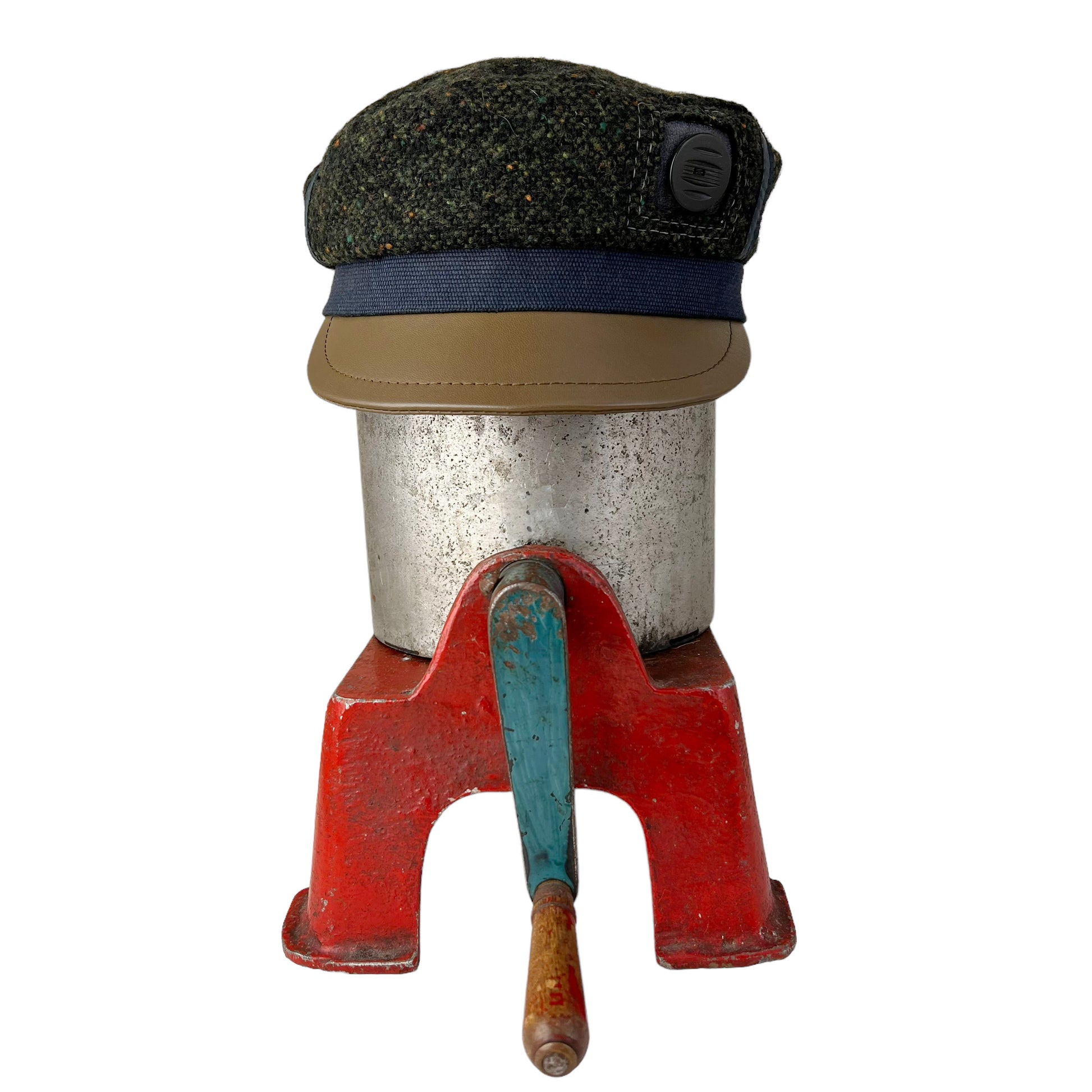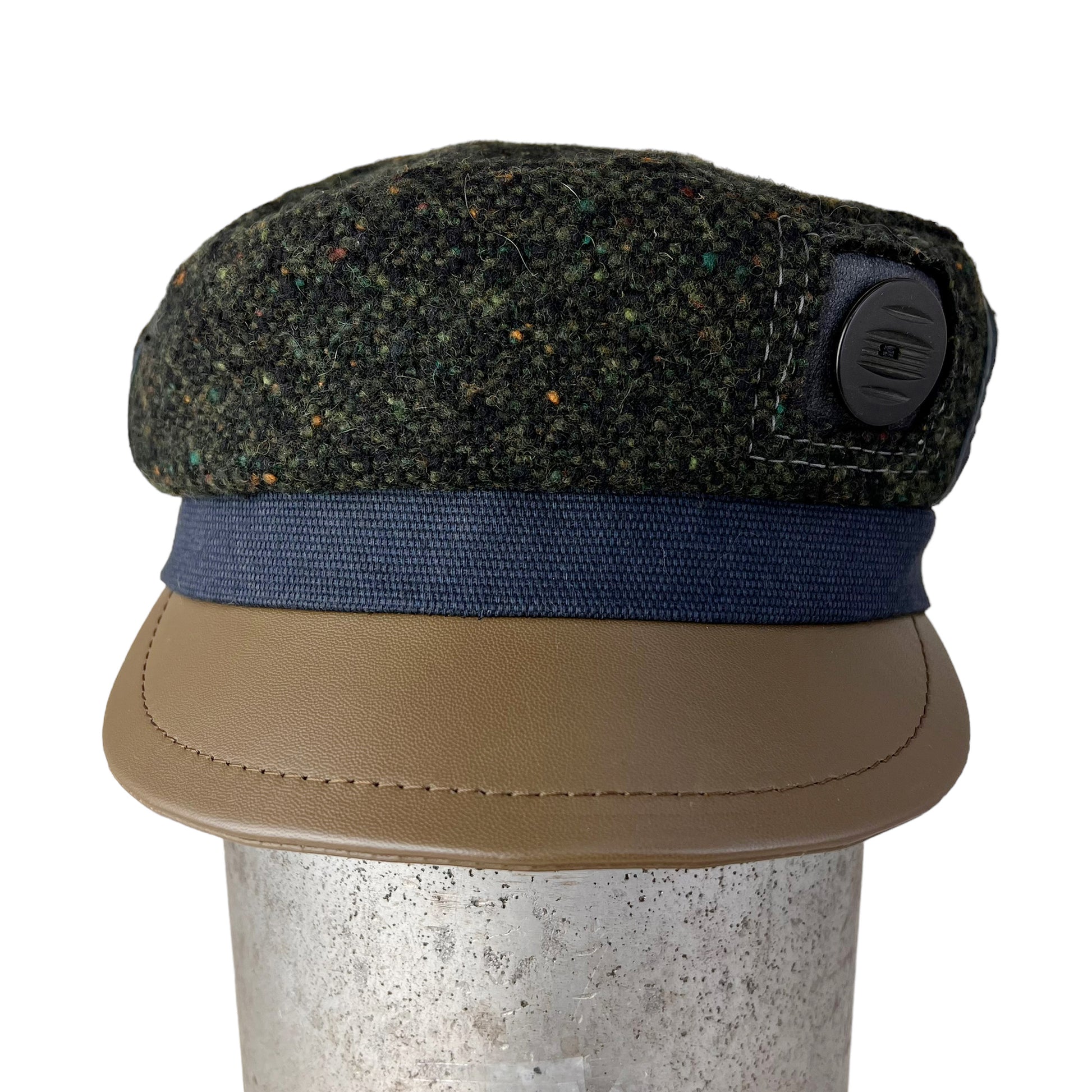 The outside of this hat has been hand cut from a dark green black wool weave. The navy blue band is made from a strong basket weave cotton. I hand cut my peak from a olive green lamb leather and reinforce it with a leather board inside, then finish it off by top stitching on my leather machine. This antique celluloid button was chosen for this cap is from the 1920s
