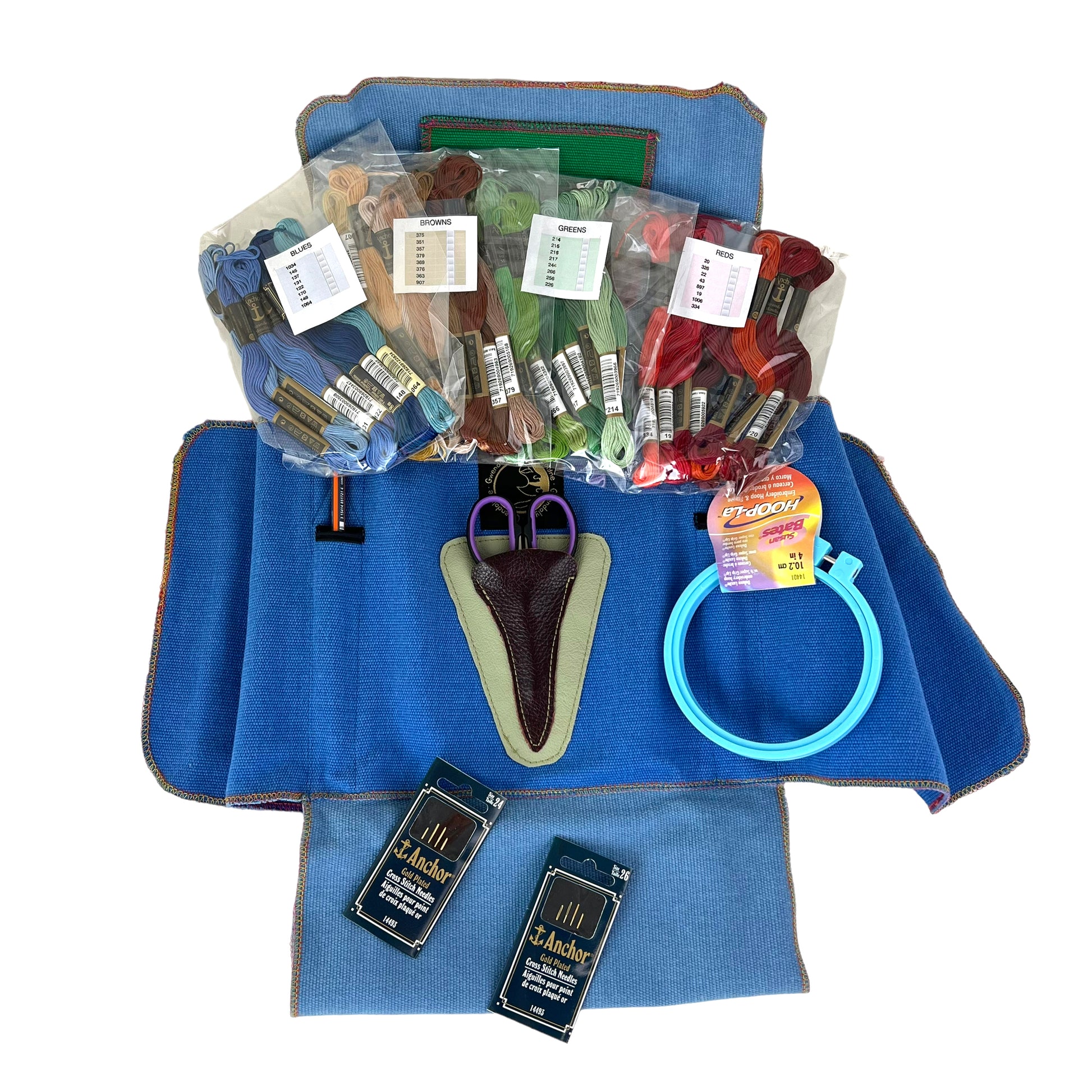 The supplies include a small embroidery hoop, 4 pouches of Anchor Embroidery Floss in the four colour groups  red, browns, blue, and greens, A HB pencil, 2 packs of needles, and a bee wax block.