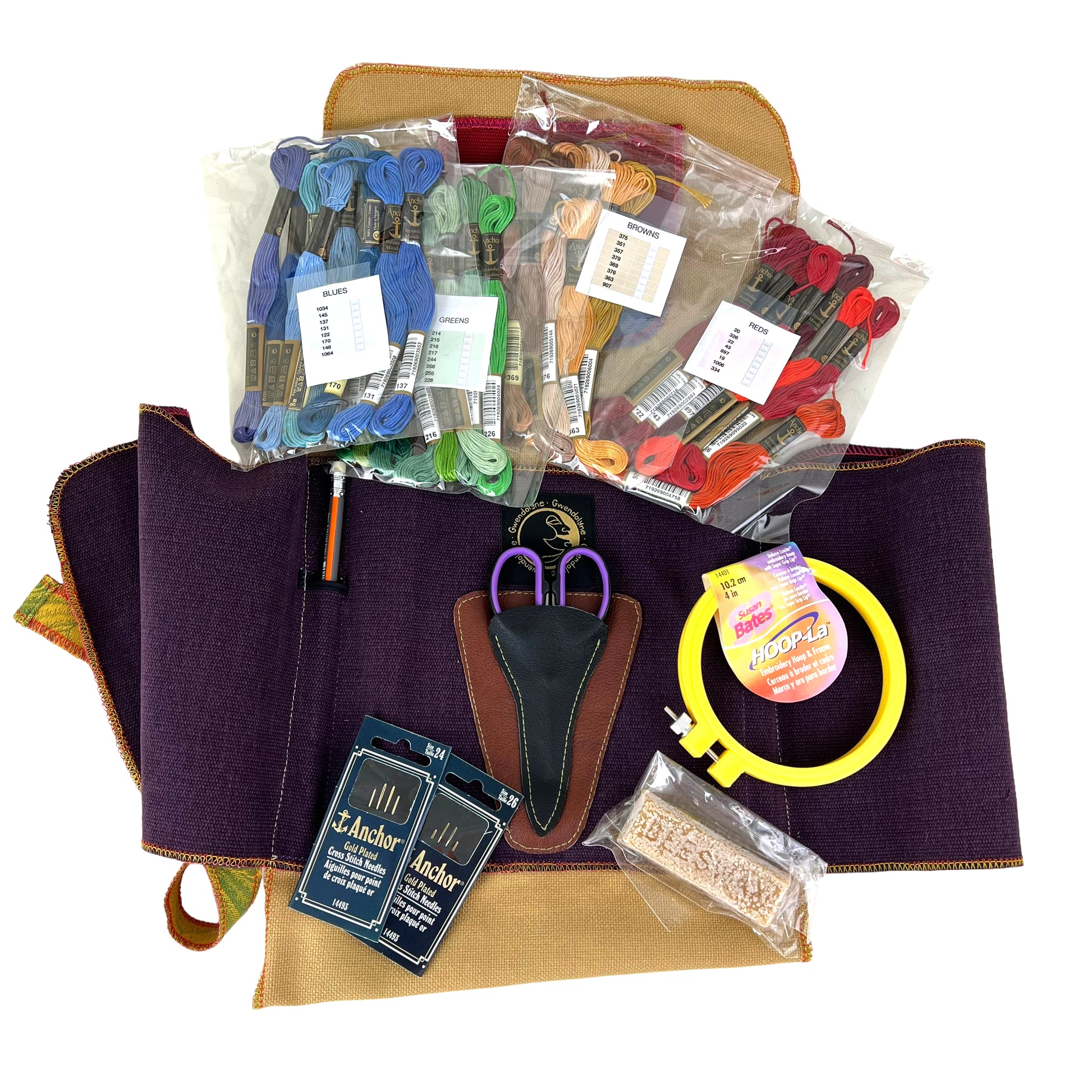 The supplies include a small embroidery hoop, 4 pouches of Anchor Embroidery Floss in the four colour groups  red, browns, blue, and greens, A HB pencil, 2 packs of needles, and a bee wax block.