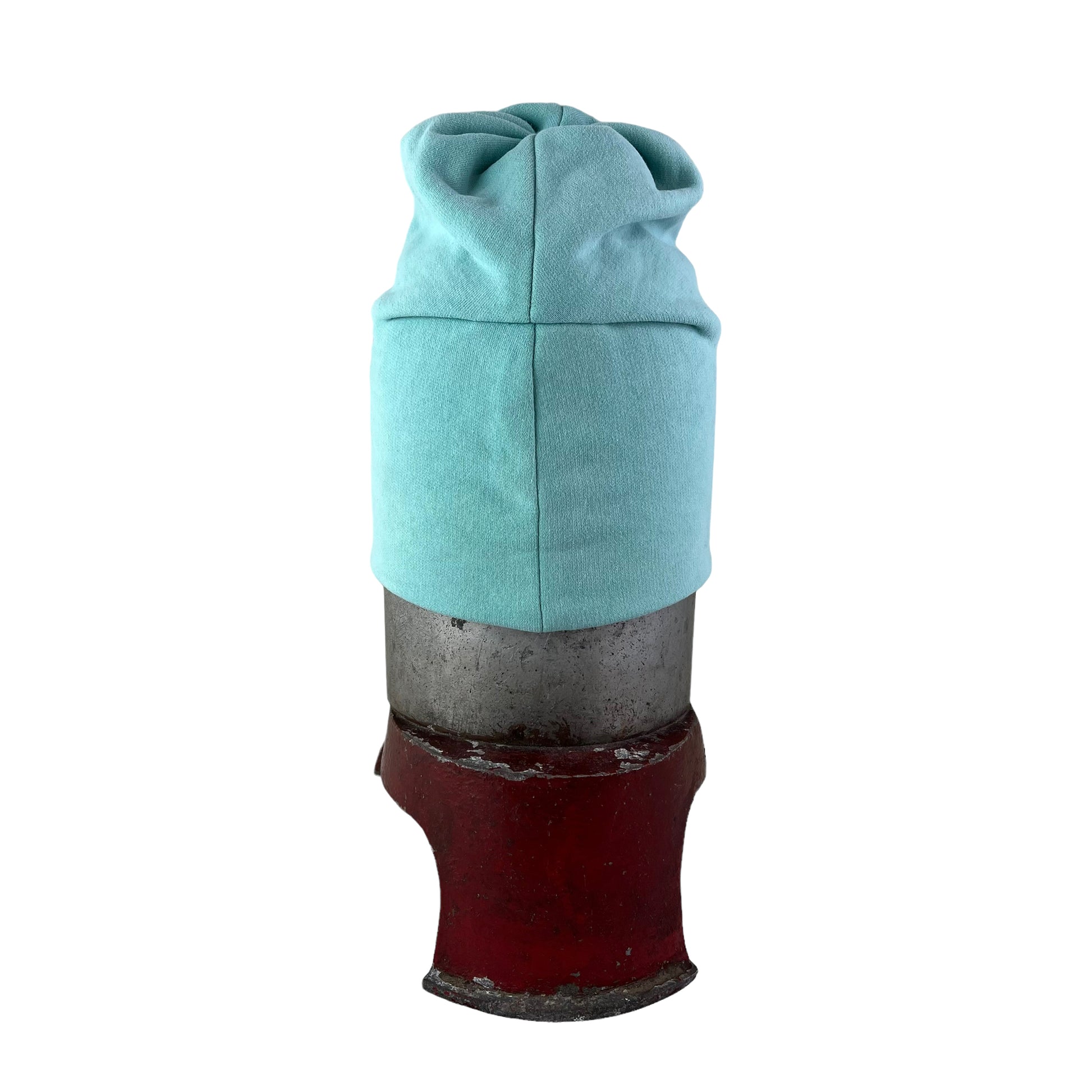 This double layer pastel sea foam green slouchy toque is made from a 100% cotton brushed fleece fabric. I dye the fabric in small batches of three hats. The Evening Grosbeak on a branch was created by me and transferred onto the right side of hat.