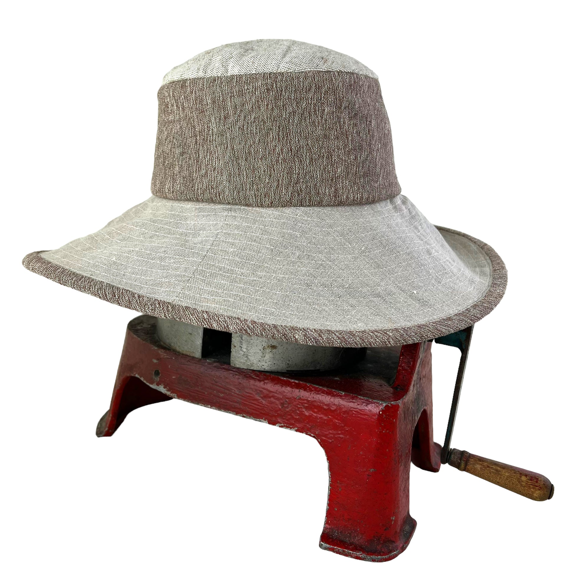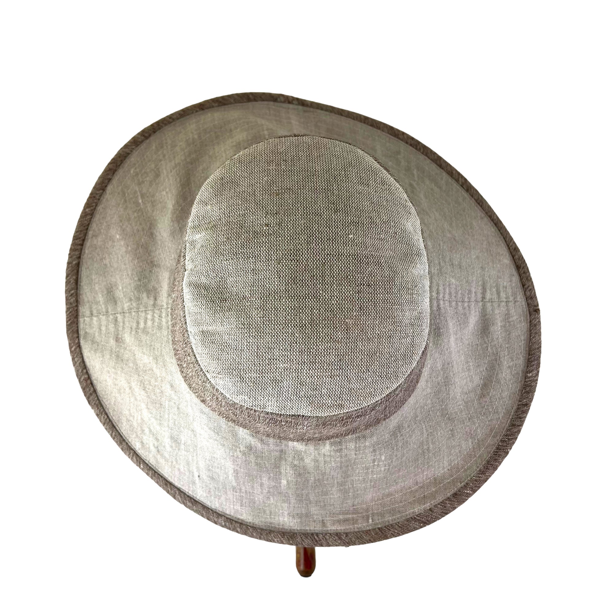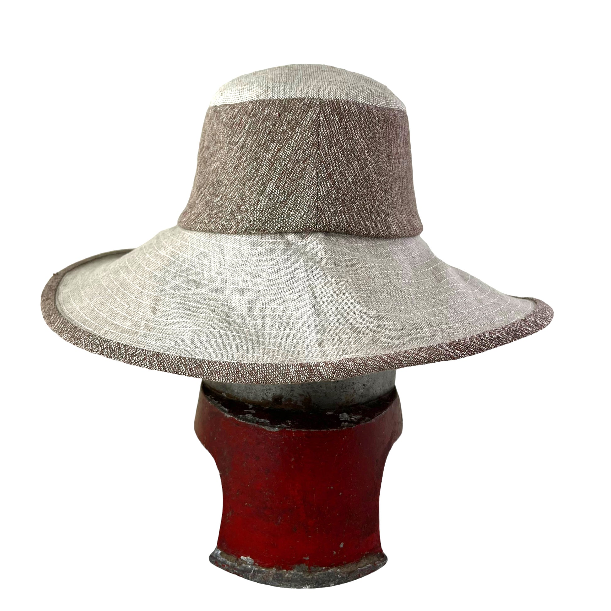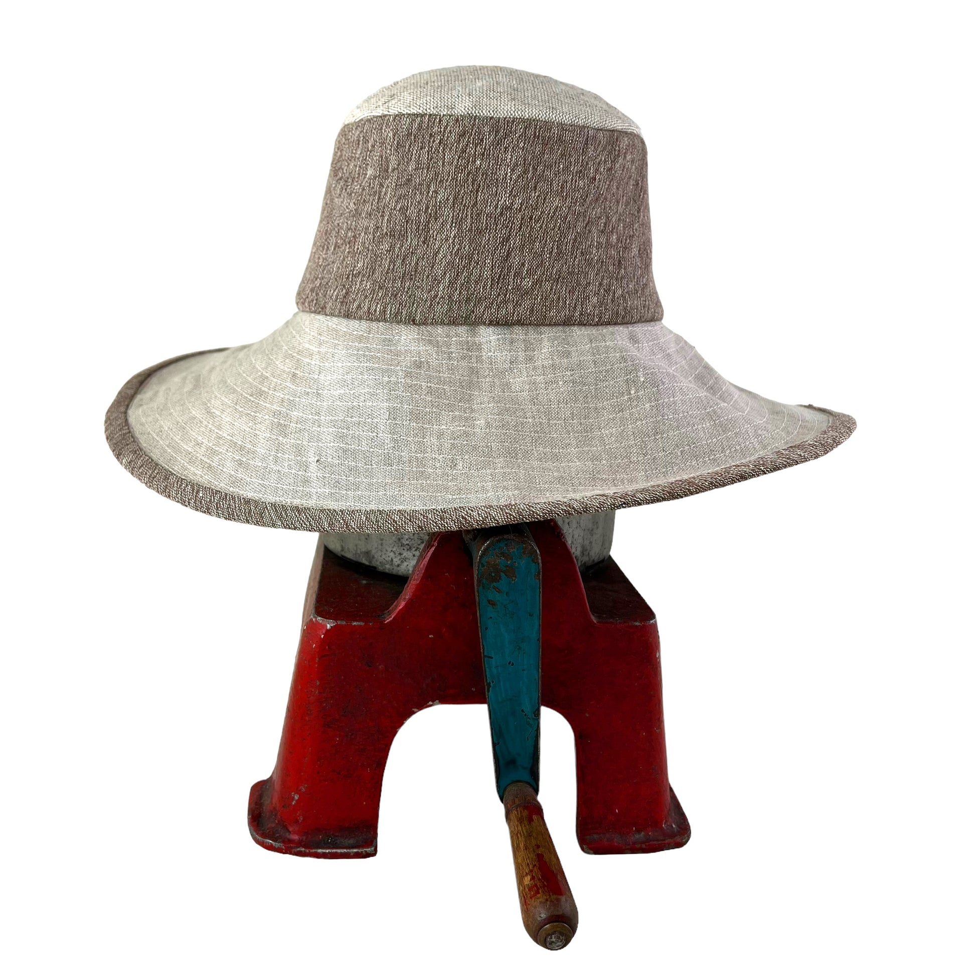 Inspired by Summer's hot intensive UV ray days, this linen wide brimmed hat will give you great protection. The exterior is hand cut and sewn from different natural coloured linens. The band is cut from a hand loomed woven clay brown and natural coloured linen weave. The top is cut from a thick natural coloured linen.