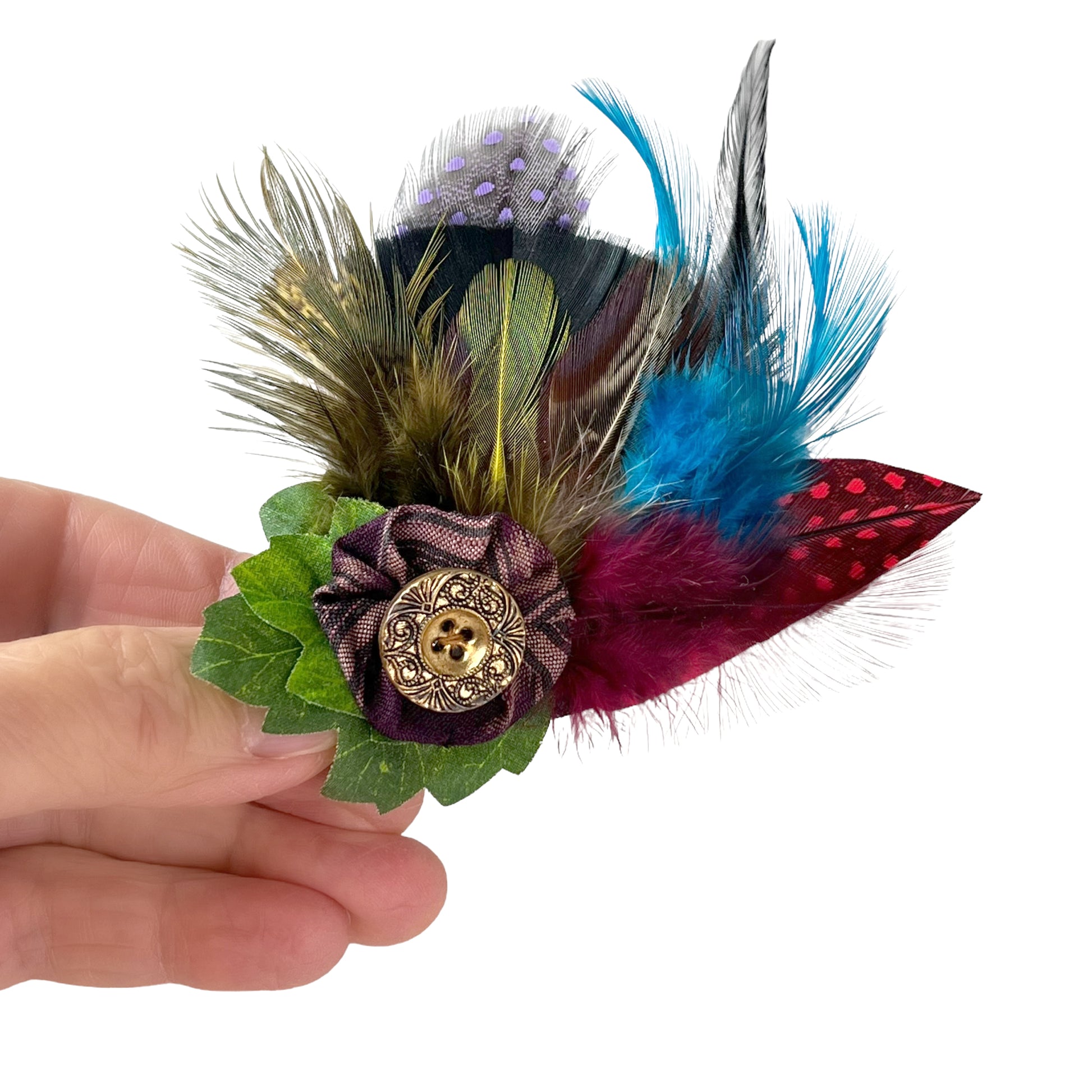 This one of a kind summer feather brooch clip is a splash of color. The antique brass filigree 4 hole button, is sewn on a silk puff with a unique bed of feathers underneath. Fun to be clipped or pinned onto your summer hat band or jacket lapel.
