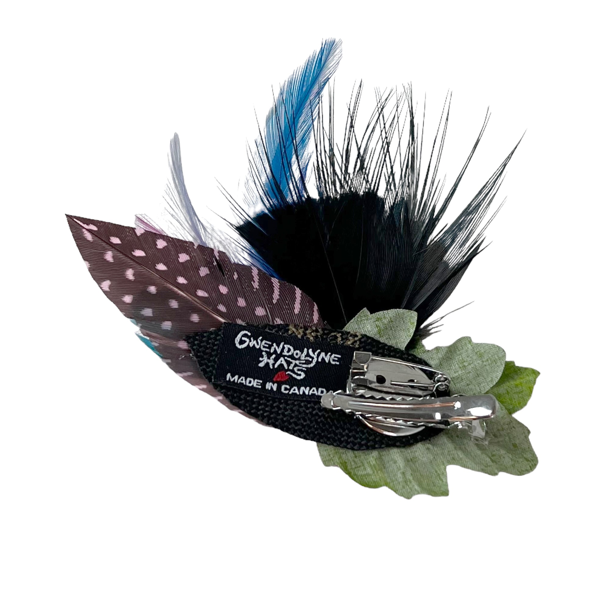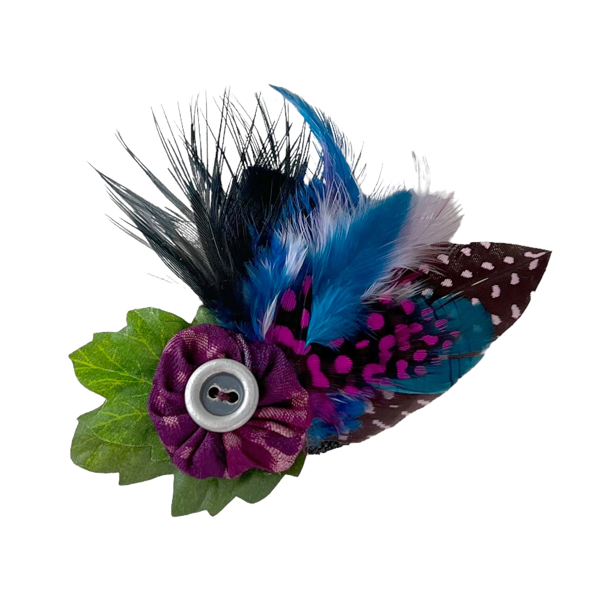 This one of a kind summer feather brooch clip is a splash of color. The antique 2 hole blue metal workers button, is sewn on a silk puff with a unique bed of feathers underneath. Fun to be clipped or pinned onto your summer hat band or jacket lapel.