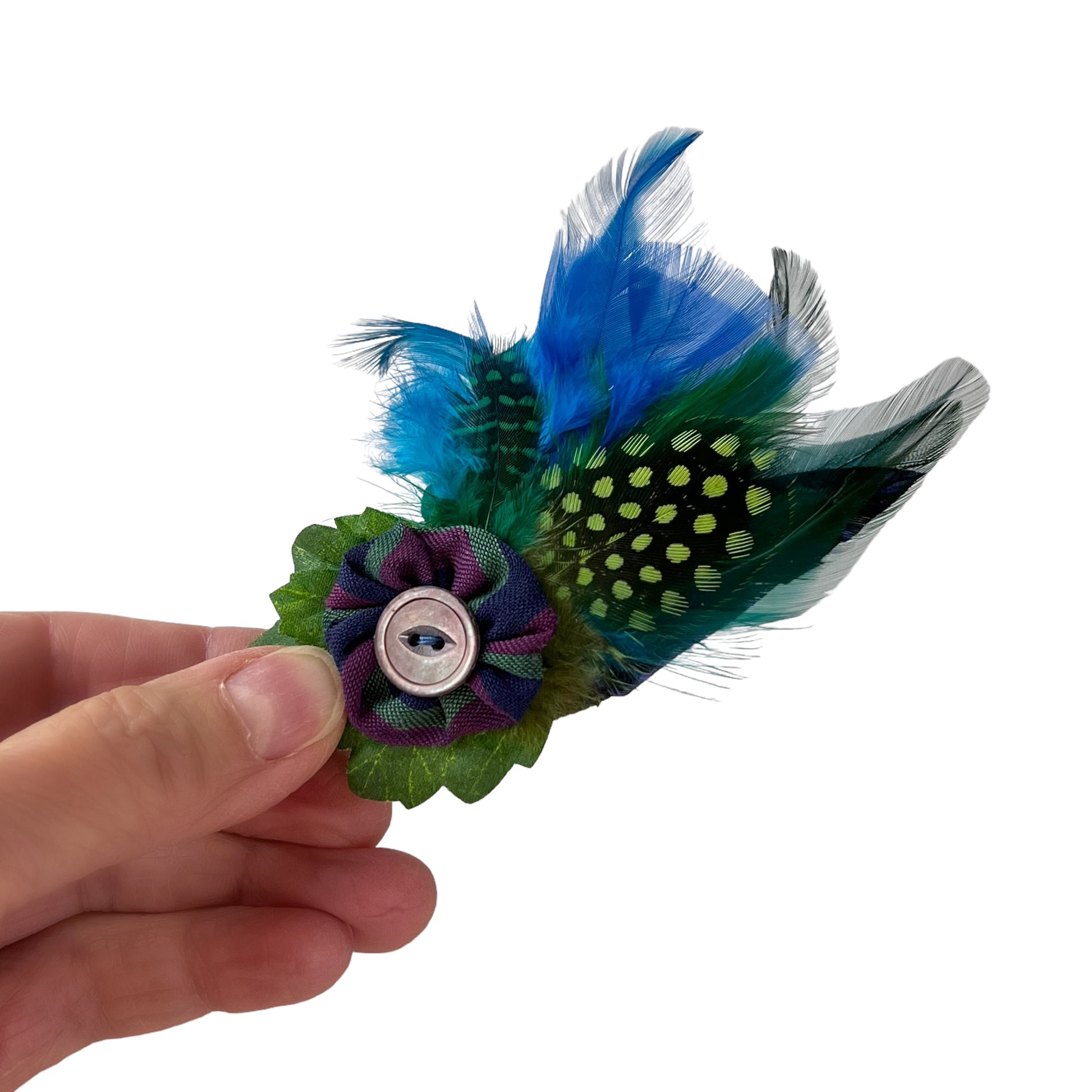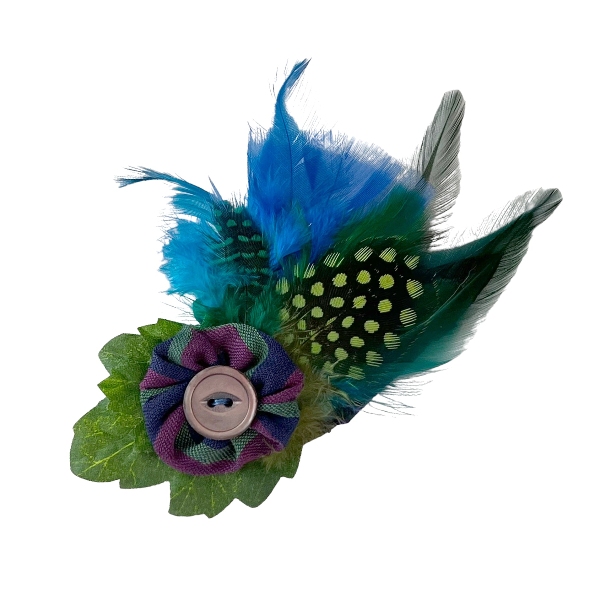This one of a kind summer feather brooch clip is a splash of color. The antique carved 2 hole cats eye shell button, is sewn on a silk puff with a unique bed of feathers underneath. Fun to be clipped or pinned onto your summer hat band or jacket lapel.