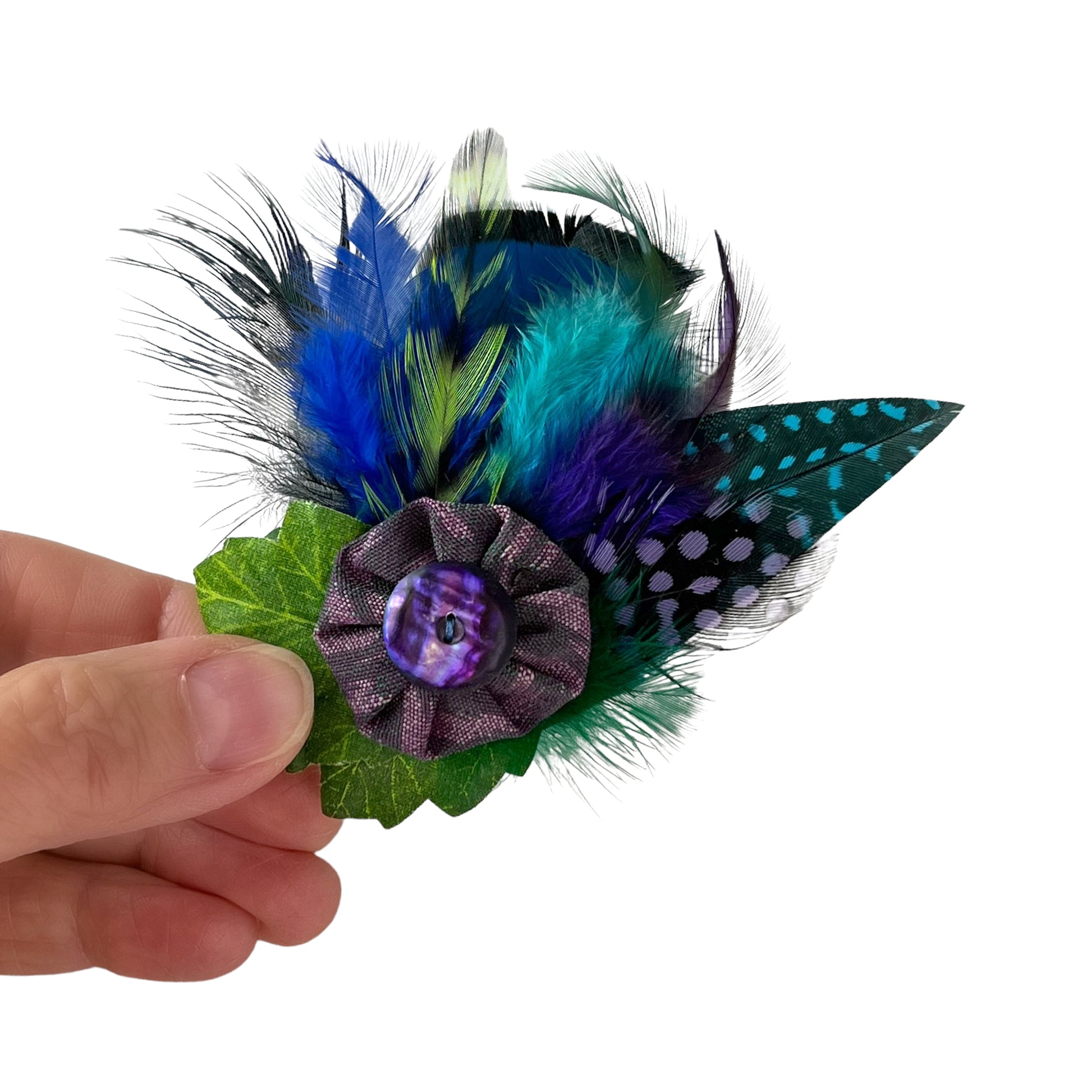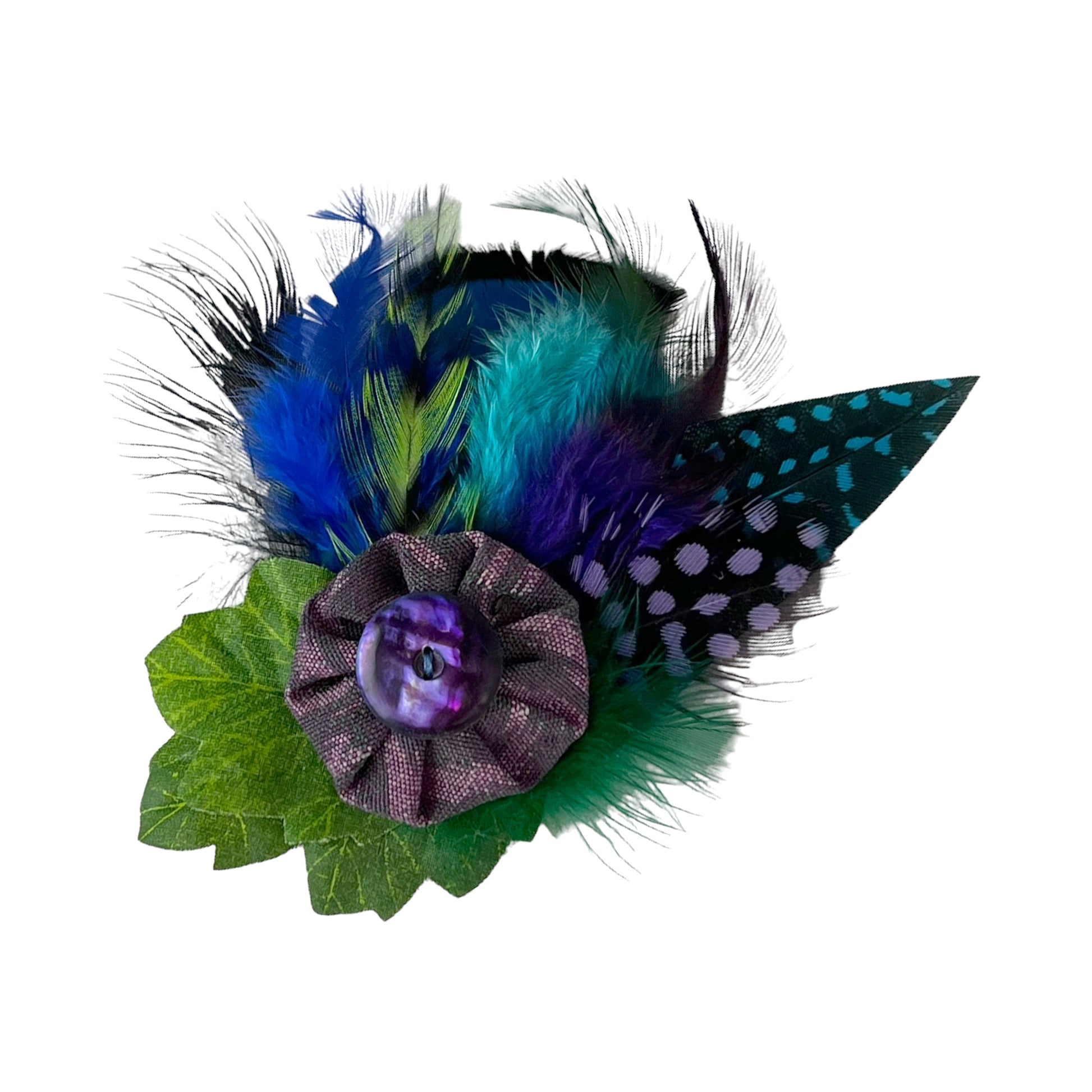 This one of a kind summer feather brooch clip is a purple and blue color pallet. The antique 2 hole purple shell button, is sewn on a silk puff with a unique bed of feathers underneath. Fun to be clipped or pinned onto your summer hat band or jacket lapel.