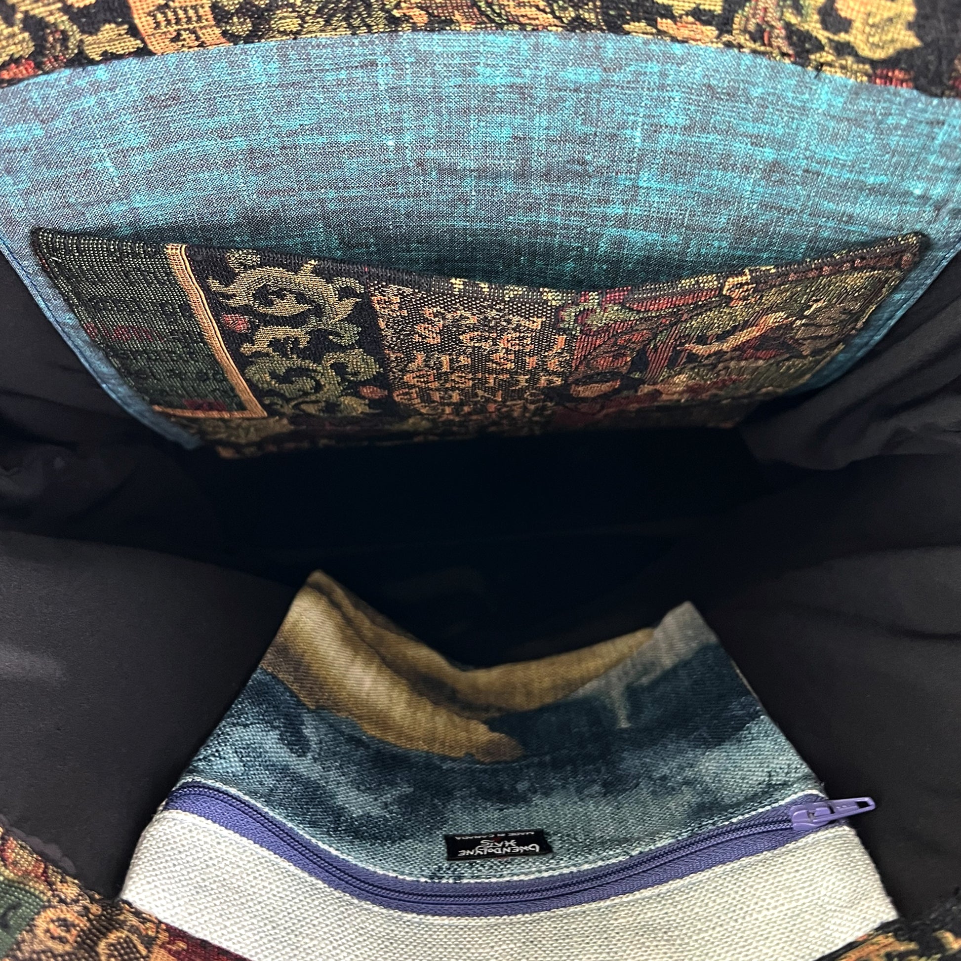 The tapestry was too beautiful to hide and so I made both pockets to be resting inside. The front inside lined pocket is 6" deep and is 8" wide. Hanging on the inside back of this tote is a 6 1/2" wide zipper pocket that is 6" deep to carry your more secure items.