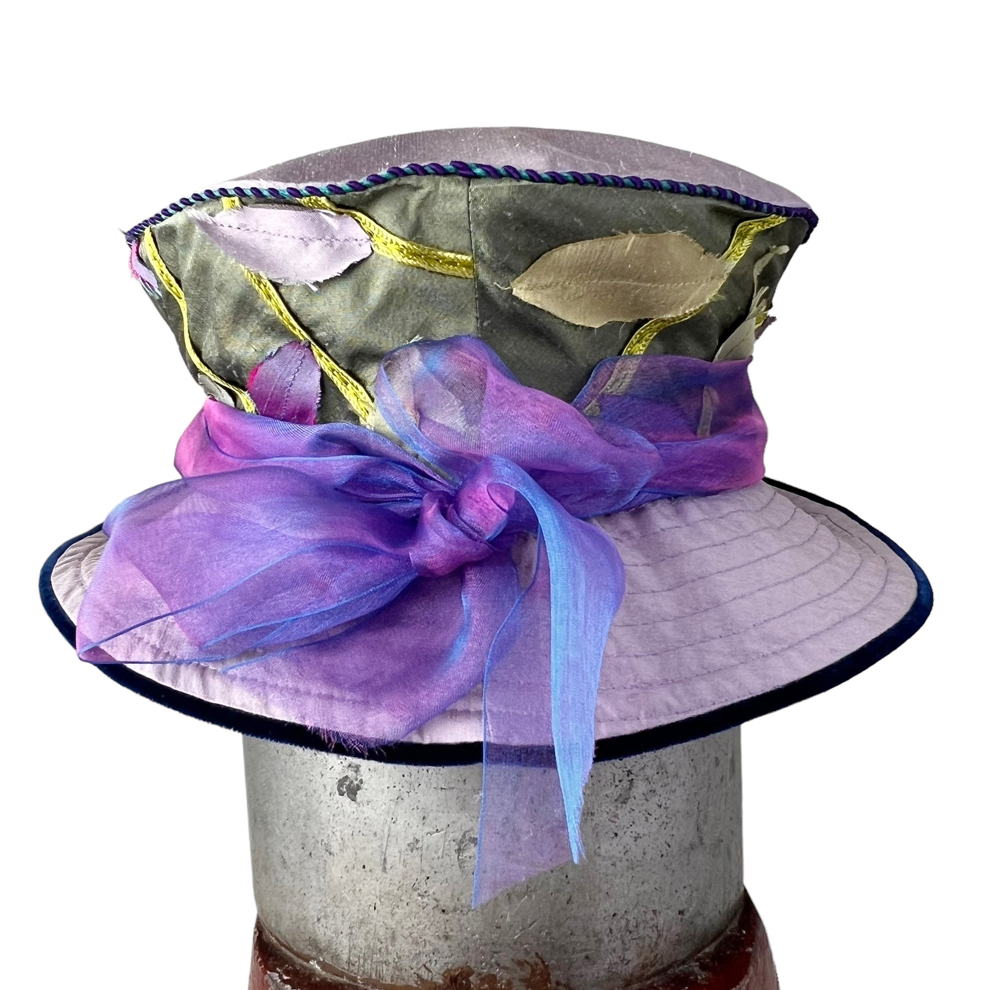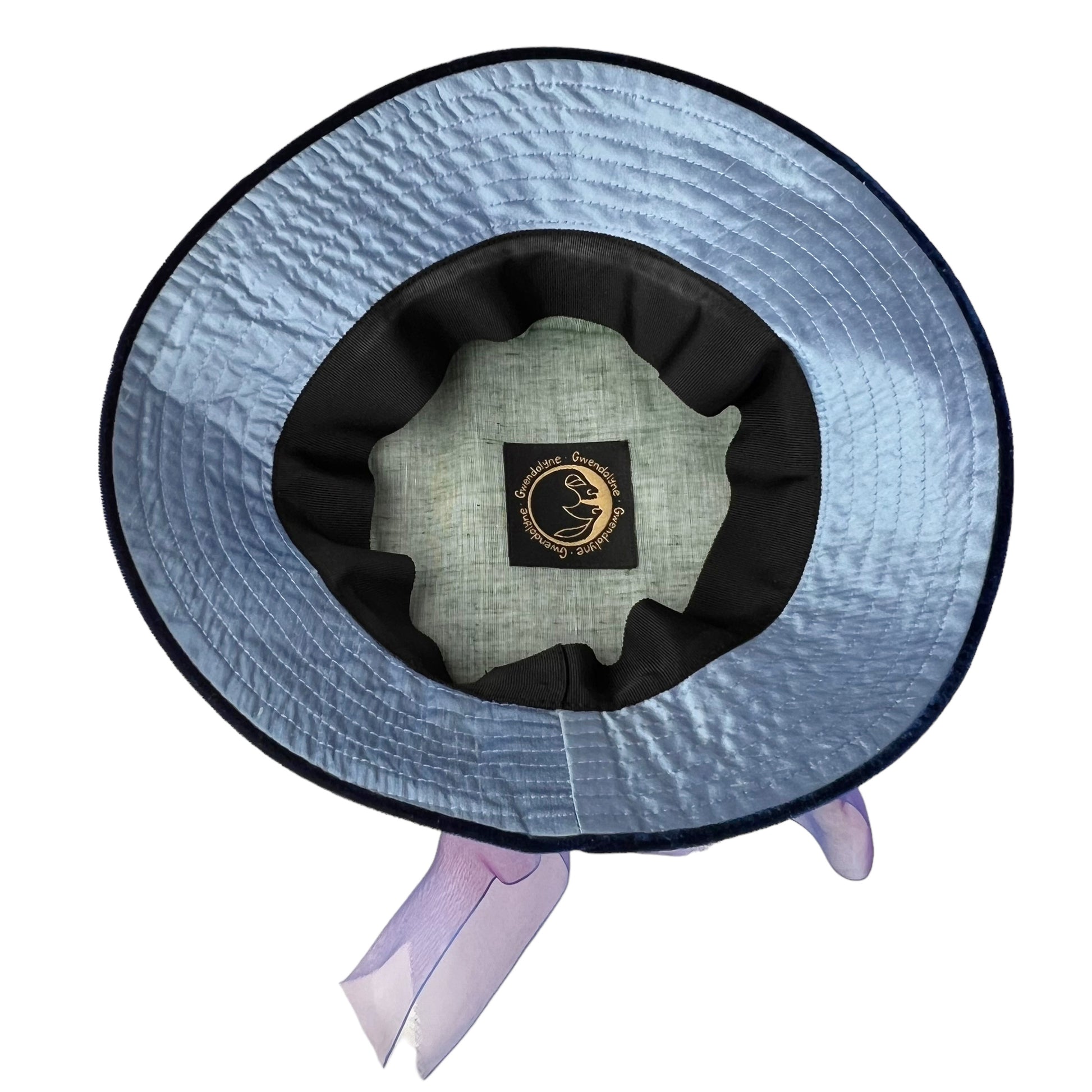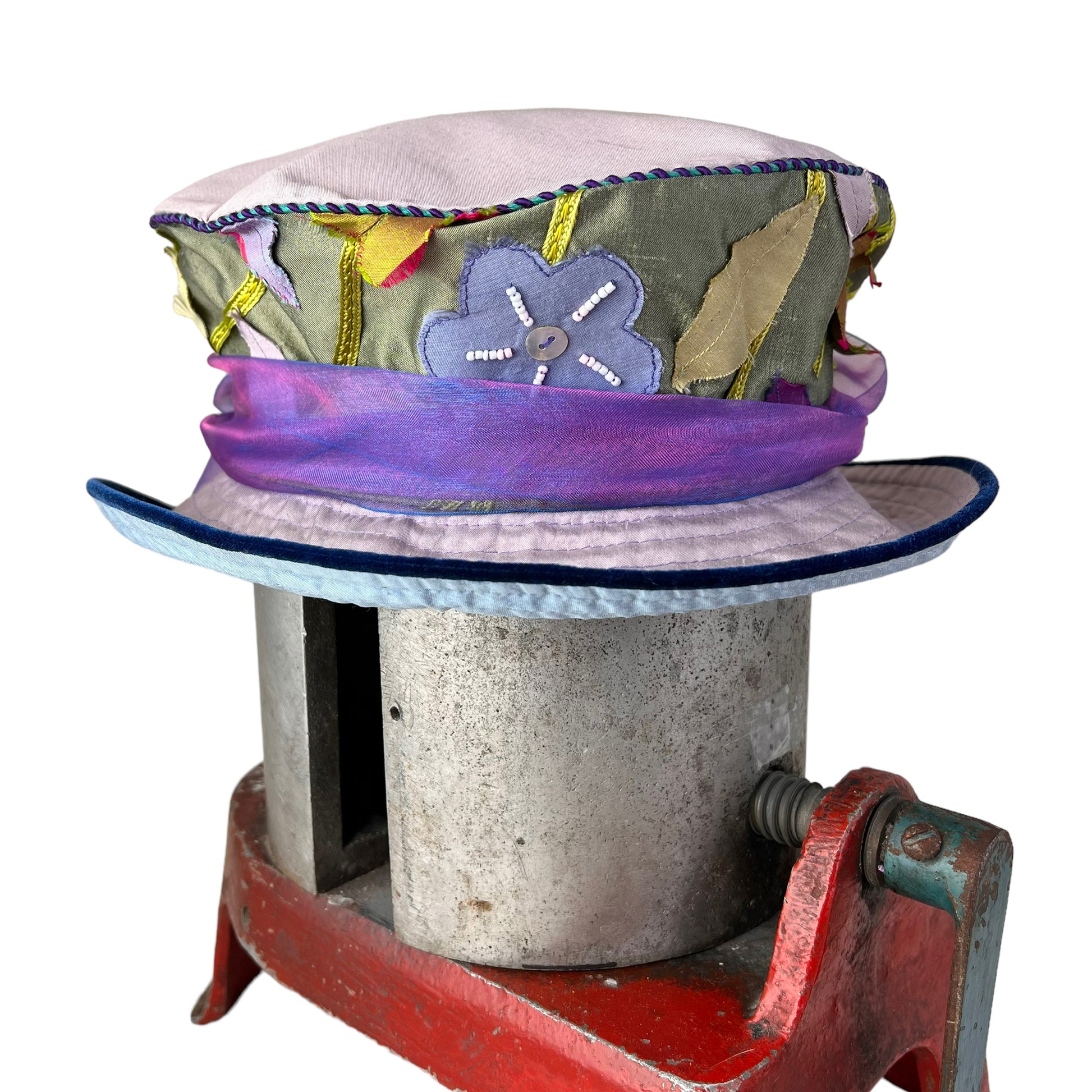 The lower rim is cut from a baby blue silk and the top and upper rim from a lilac silk. The rim is trimmed with navy blue and is top stitched. The lining is cut from a light weight cotton weave which makes the hat very breathable and eliminates hat hair.
