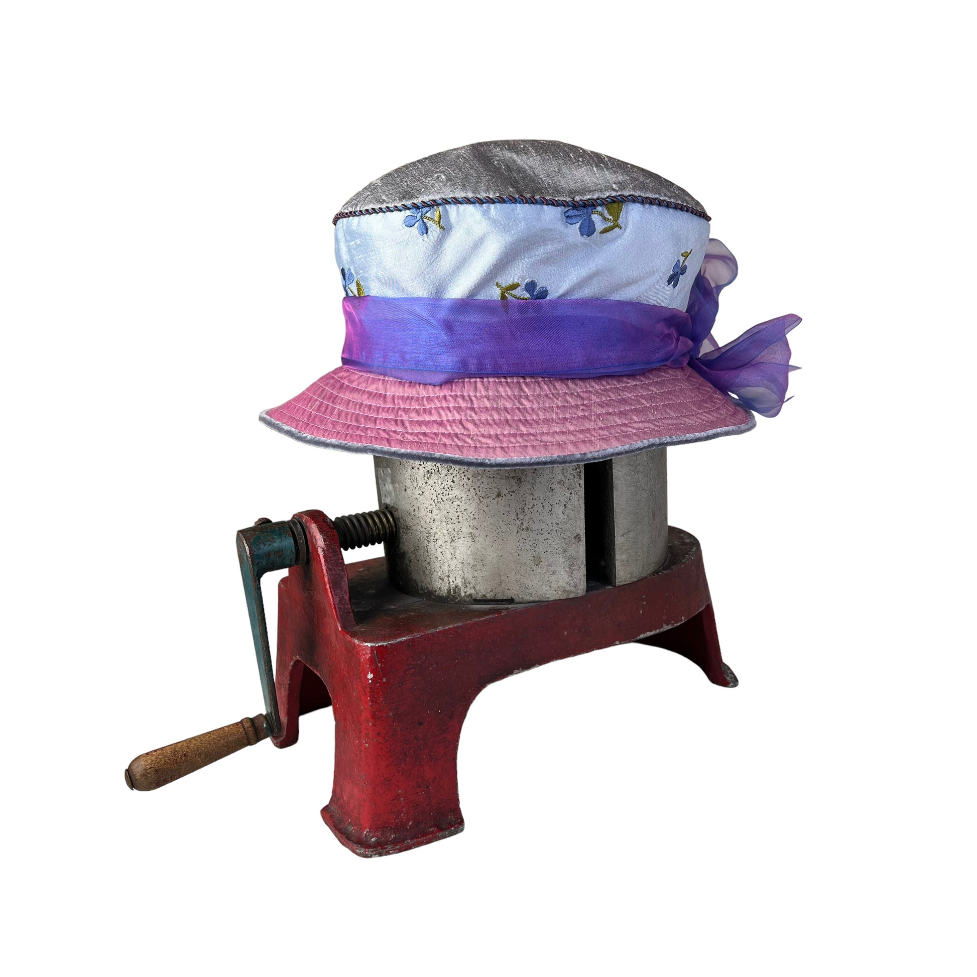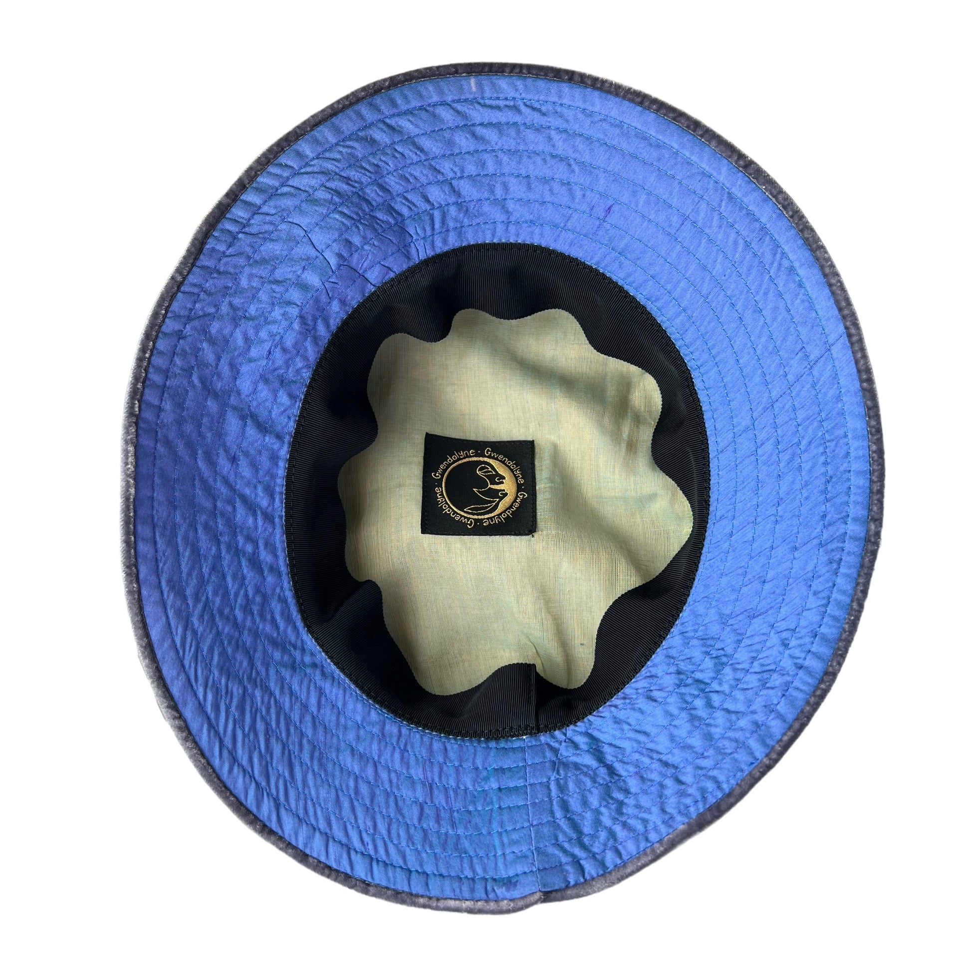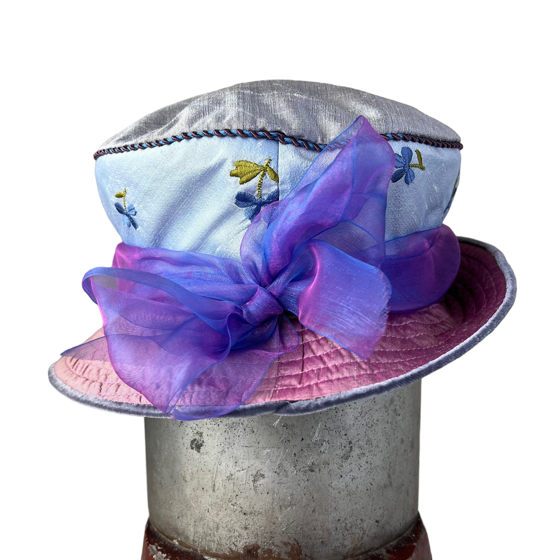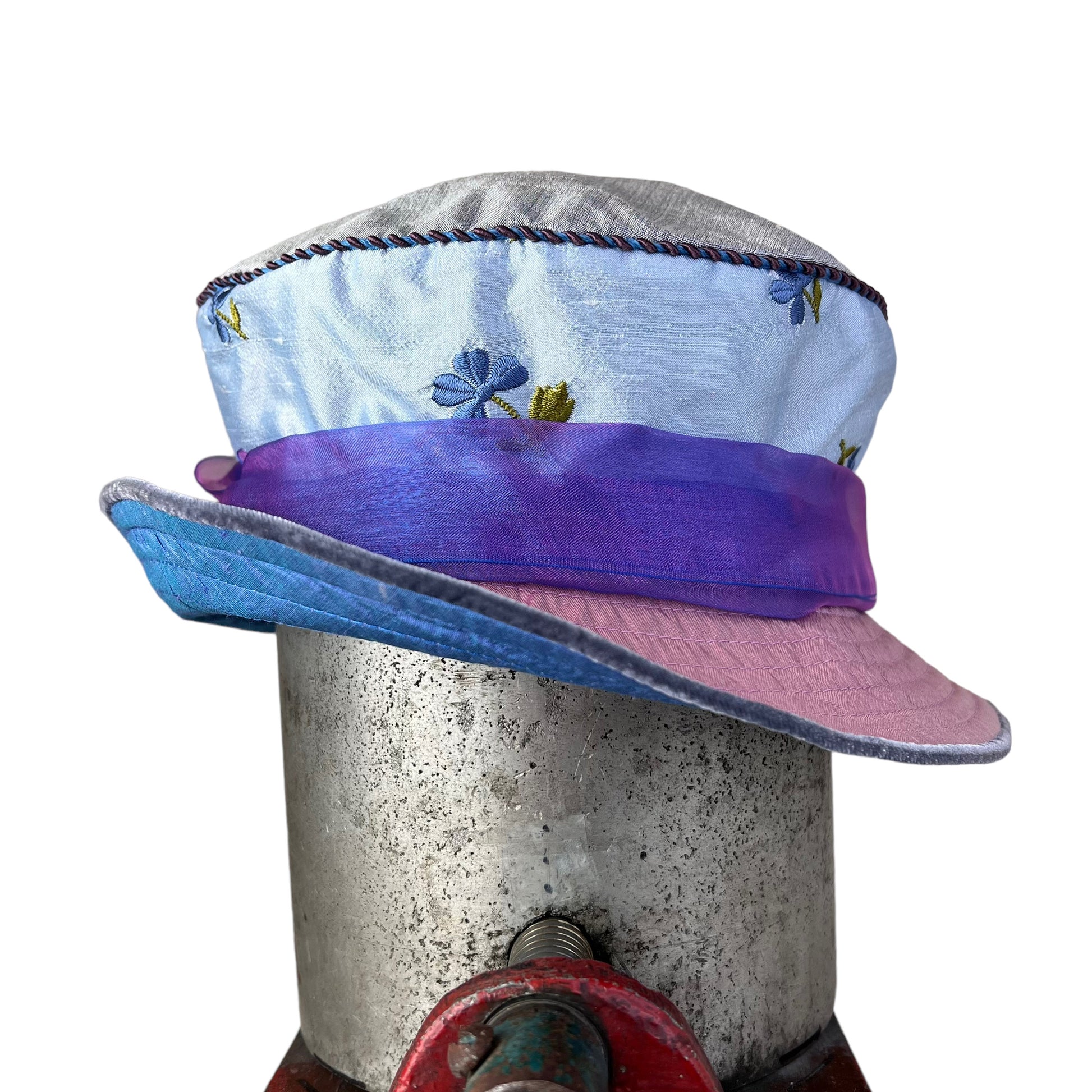 The lower rim is cut from a baby blue silk and the top and upper rim from a pink silk. The rim is trimmed with grey trim and is top stitched. The lining is cut from a light weight cotton weave which makes the hat very breathable and eliminates hat hair.