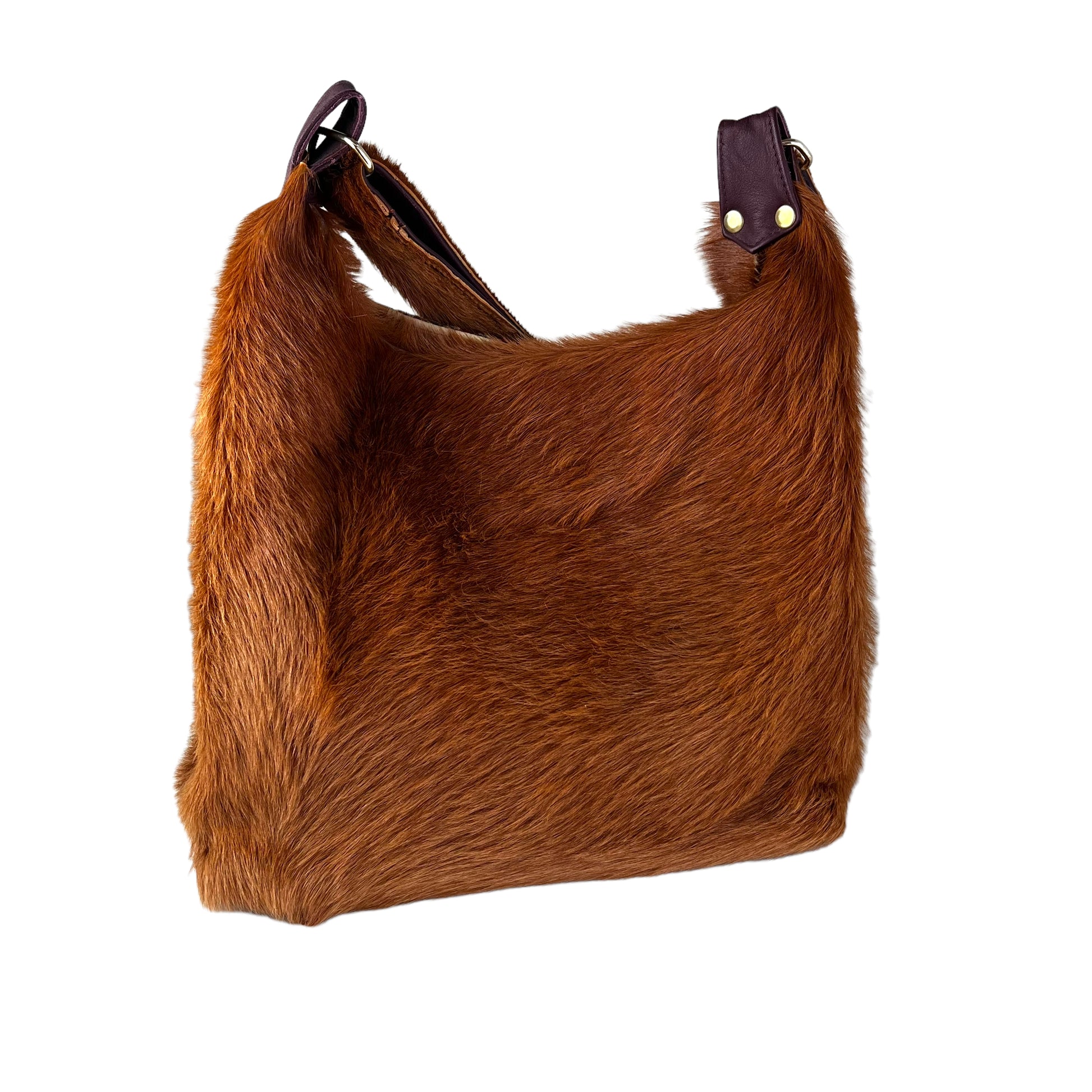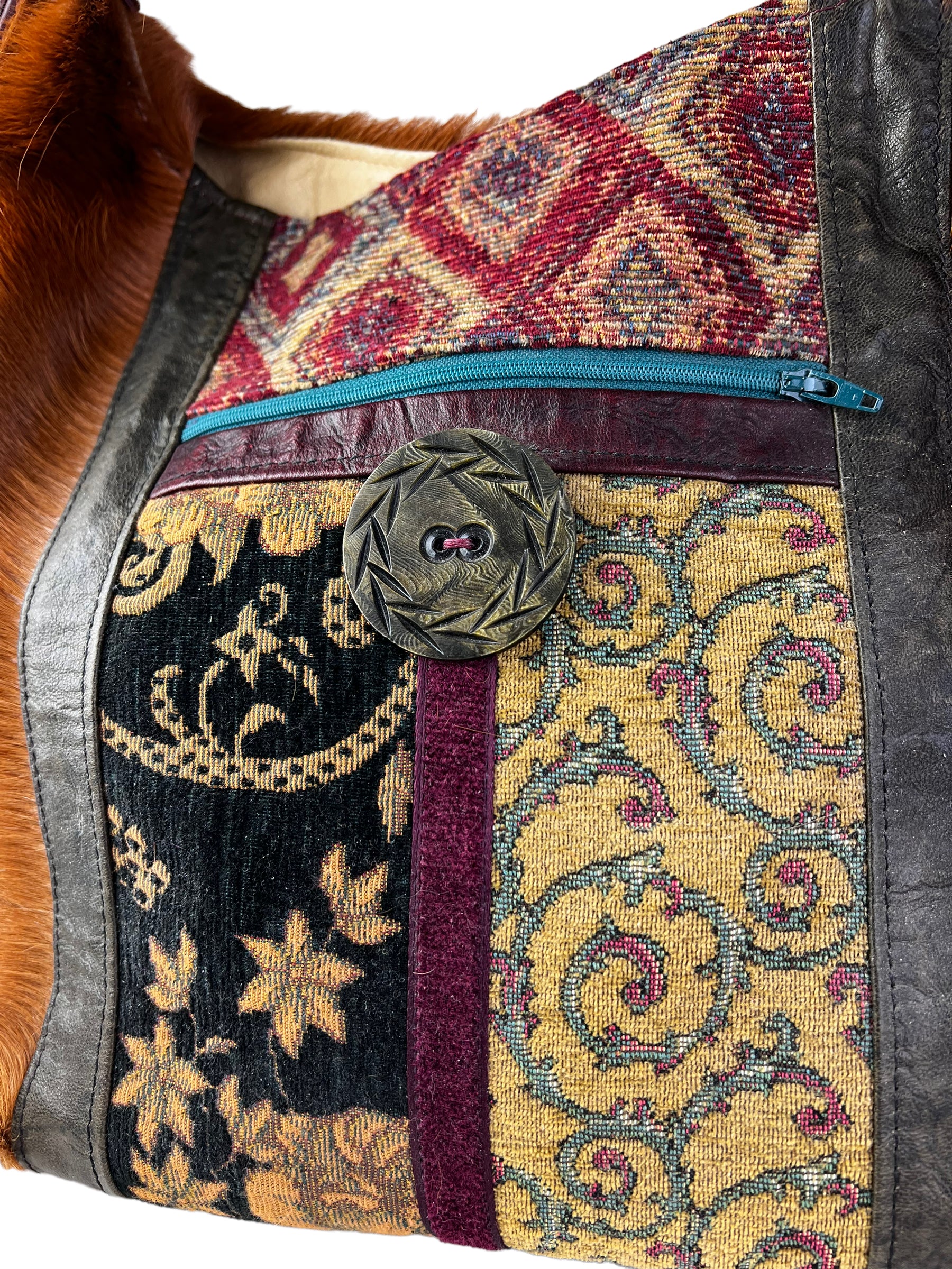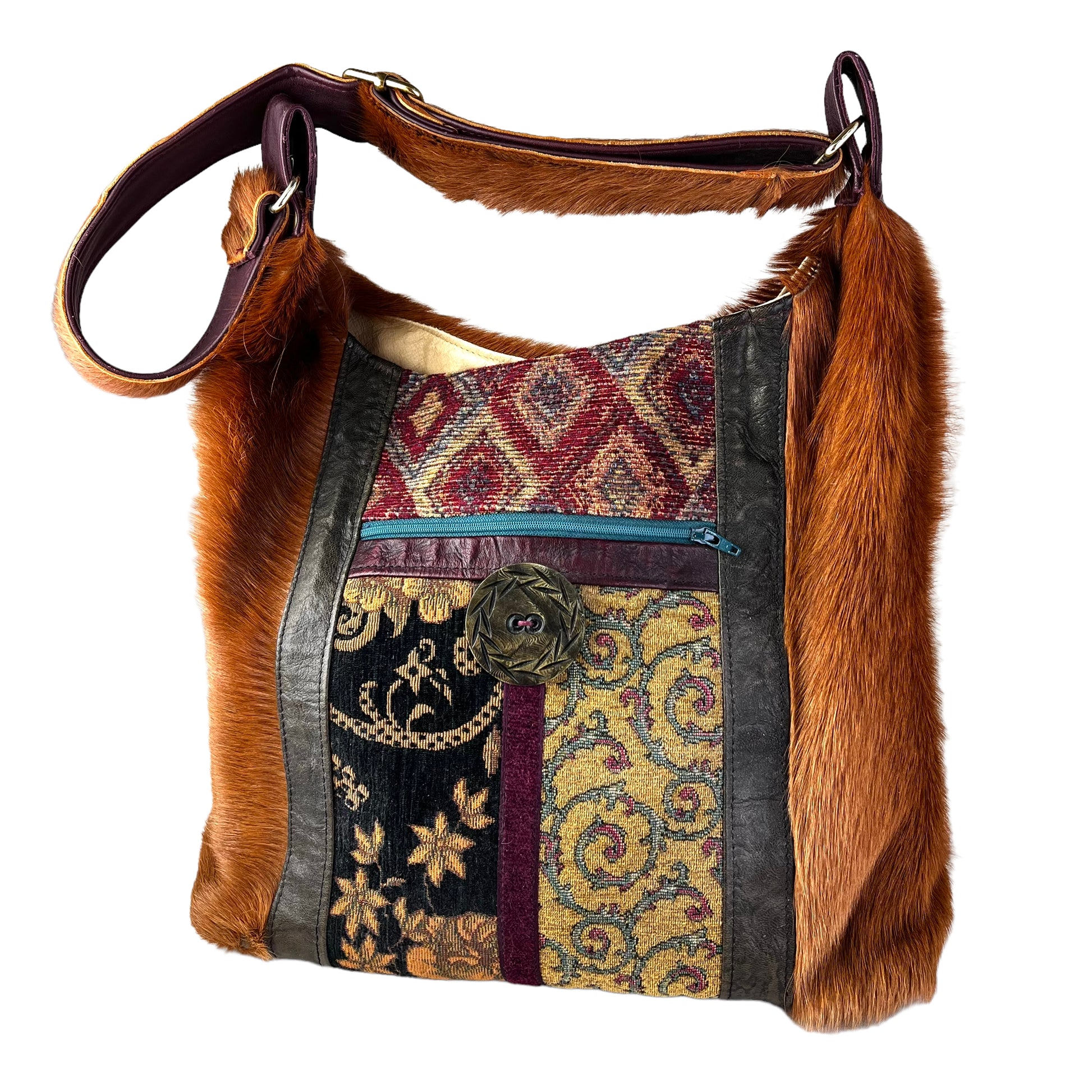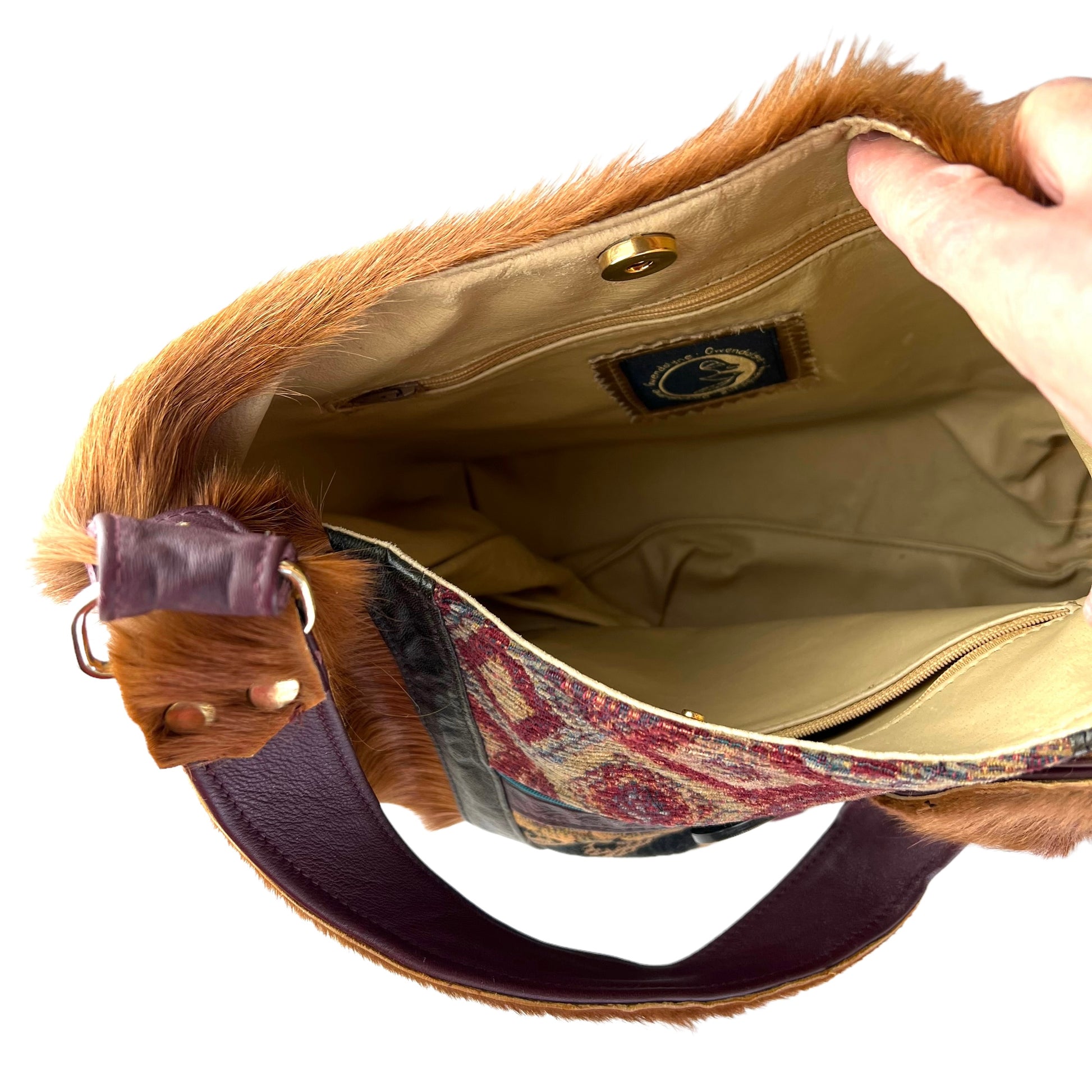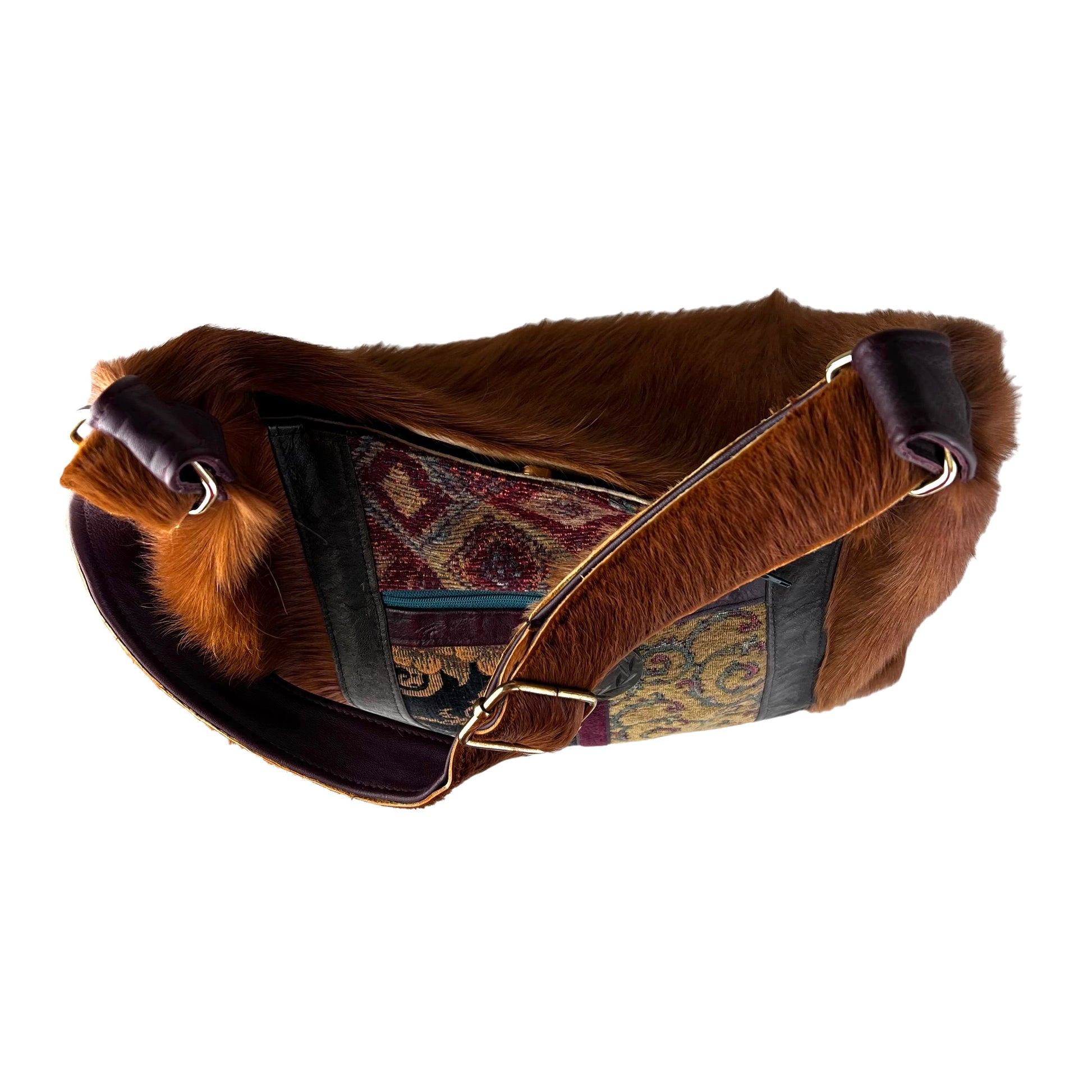 This luxurious one of a kind adjustable shoulder strap bag measures 21" wide and 28" tall. It was cut from a variety of leathers ranging from goat, horse, pig and Belgian tapestries.