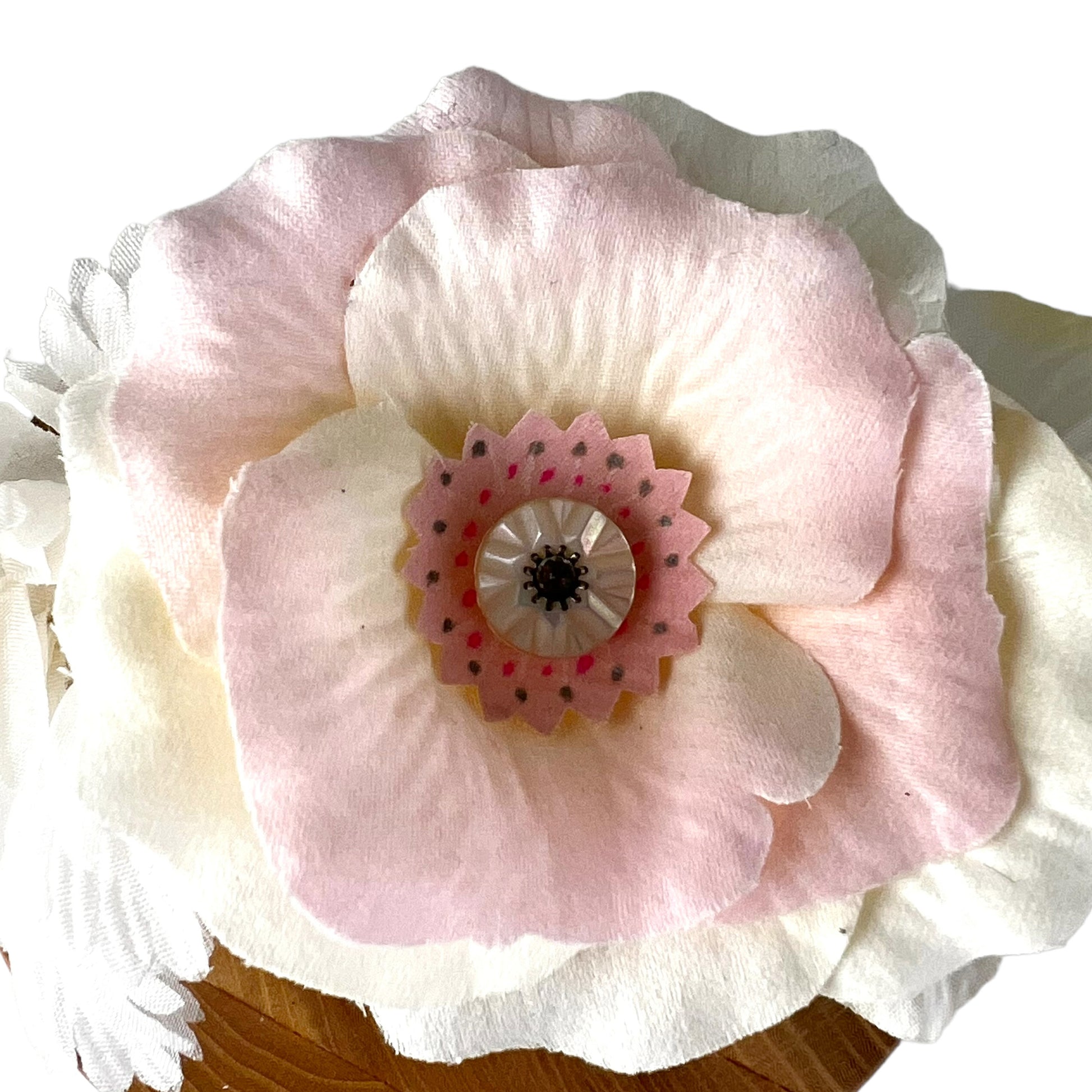 This one of a kind peach pastel and white Rose flower wreath tiaras has an array of hand sewn flowers and leaves. I have added vintage silk flowers to this hair headband. The rose flowers I make are both unique and magical. Each one I hand sew petal by petal around an antique button from the 1890 era.