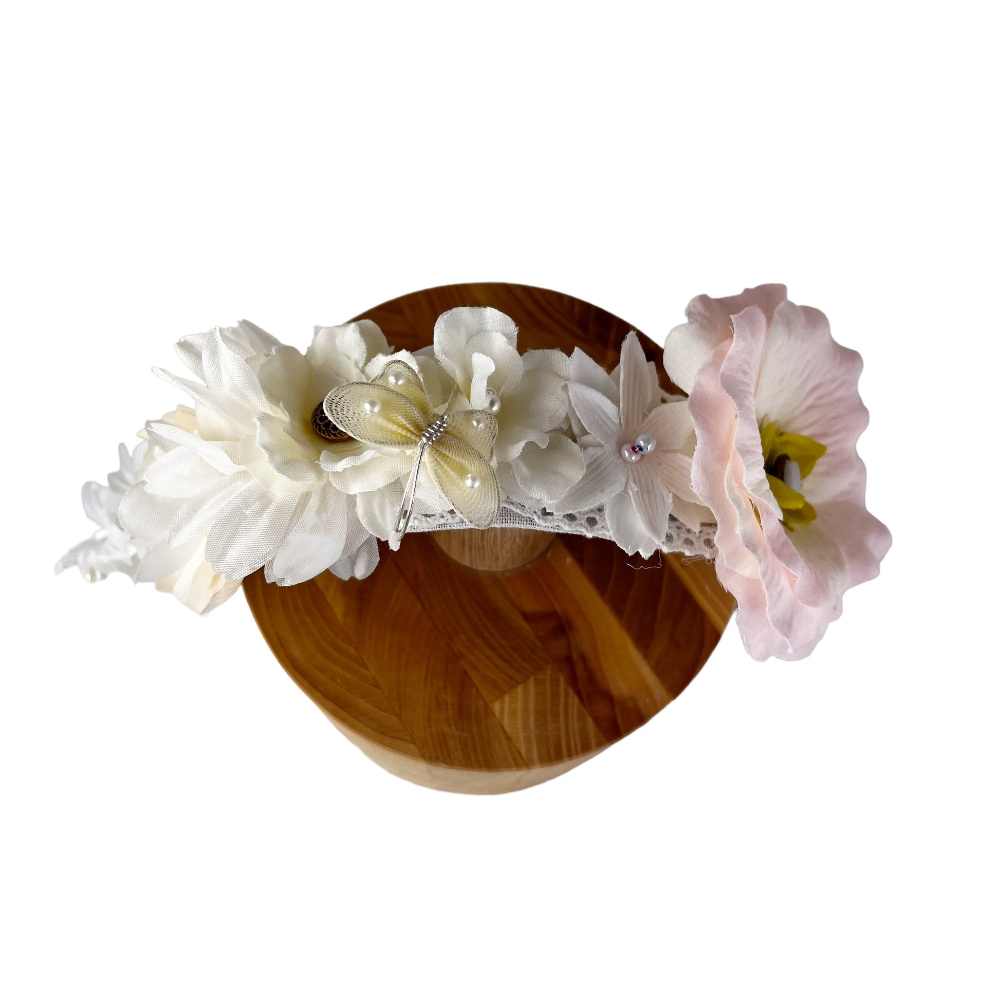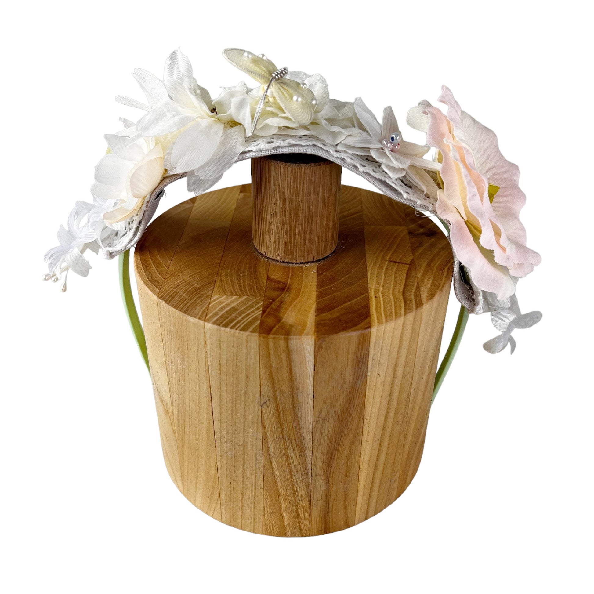 This one of a kind peach pastel and white Rose flower wreath tiaras has an array of hand sewn flowers and a sweet butterfly. I have added vintage silk flowers to this hair headband. The rose flowers I make are both unique and magical. Each one I hand sew petal by petal around an antique button from the 1890 era.